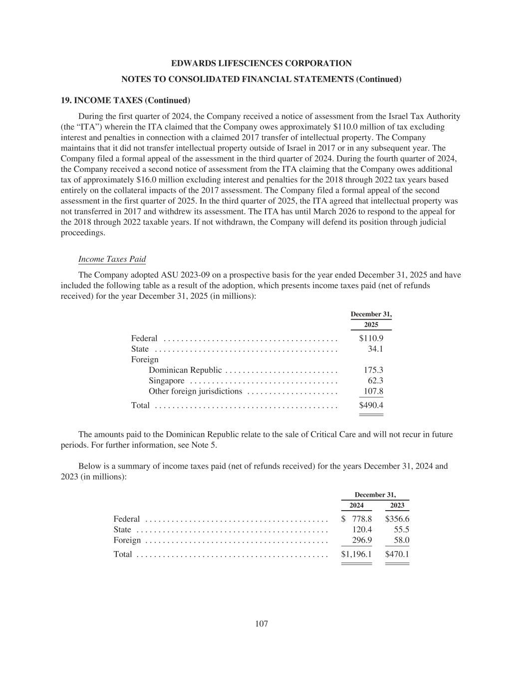 EDWARDS LIFESCIENCES CORPORATION NOTES TO CONSOLIDATED FINANCIAL STATEMENTS (Continued) 19. INCOME TAXES (Continued) During the first quarter of 2024, the Company received a notice of assessment from the Israel Tax Authority (the “ITA”) wherein the ITA claimed that the Company owes approximately $110.0 million of tax excluding interest and penalties in connection with a claimed 2017 transfer of intellectual property. The Company maintains that it did not transfer intellectual property outside of Israel in 2017 or in any subsequent year. The Company filed a formal appeal of the assessment in the third quarter of 2024. During the fourth quarter of 2024, the Company received a second notice of assessment from the ITA claiming that the Company owes additional tax of approximately $16.0 million excluding interest and penalties for the 2018 through 2022 tax years based entirely on the collateral impacts of the 2017 assessment. The Company filed a formal appeal of the second assessment in the first quarter of 2025. In the third quarter of 2025, the ITA agreed that intellectual property was not transferred in 2017 and withdrew its assessment. The ITA has until March 2026 to respond to the appeal for the 2018 through 2022 taxable years. If not withdrawn, the Company will defend its position through judicial proceedings. Income Taxes Paid The Company adopted ASU 2023-09 on a prospective basis for the year ended December 31, 2025 and have included the following table as a result of the adoption, which presents income taxes paid (net of refunds received) for the year December 31, 2025 (in millions): December 31, 2025 Federal . . . . . . . . . . . . . . . . . . . . . . . . . . . . . . . . . . . . . . . . $110.9 State . . . . . . . . . . . . . . . . . . . . . . . . . . . . . . . . . . . . . . . . . . 34.1 Foreign Dominican Republic . . . . . . . . . . . . . . . . . . . . . . . . . . 175.3 Singapore . . . . . . . . . . . . . . . . . . . . . . . . . . . . . . . . . . 62.3 Other foreign jurisdictions . . . . . . . . . . . . . . . . . . . . . 107.8 Total . . . . . . . . . . . . . . . . . . . . . . . . . . . . . . . . . . . . . . . . . . $490.4 The amounts paid to the Dominican Republic relate to the sale of Critical Care and will not recur in future periods. For further information, see Note 5. Below is a summary of income taxes paid (net of refunds received) for the years December 31, 2024 and 2023 (in millions): December 31, 2024 2023 Federal . . . . . . . . . . . . . . . . . . . . . . . . . . . . . . . . . . . . . . . . . . $ 778.8 $356.6 State . . . . . . . . . . . . . . . . . . . . . . . . . . . . . . . . . . . . . . . . . . . . 120.4 55.5 Foreign . . . . . . . . . . . . . . . . . . . . . . . . . . . . . . . . . . . . . . . . . . 296.9 58.0 Total . . . . . . . . . . . . . . . . . . . . . . . . . . . . . . . . . . . . . . . . . . . . $1,196.1 $470.1 107