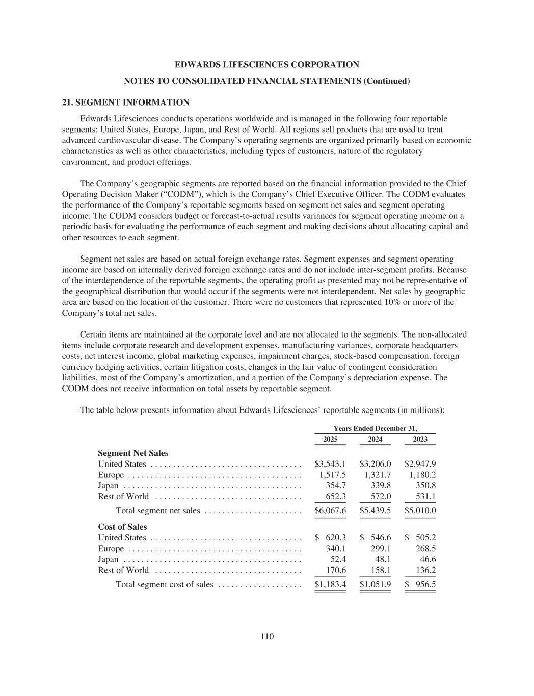 EDWARDS LIFESCIENCES CORPORATION NOTES TO CONSOLIDATED FINANCIAL STATEMENTS (Continued) 21. SEGMENT INFORMATION Edwards Lifesciences conducts operations worldwide and is managed in the following four reportable segments: United States, Europe, Japan, and Rest of World. All regions sell products that are used to treat advanced cardiovascular disease. The Company’s operating segments are organized primarily based on economic characteristics as well as other characteristics, including types of customers, nature of the regulatory environment, and product offerings. The Company’s geographic segments are reported based on the financial information provided to the Chief Operating Decision Maker (“CODM”), which is the Company’s Chief Executive Officer. The CODM evaluates the performance of the Company’s reportable segments based on segment net sales and segment operating income. The CODM considers budget or forecast-to-actual results variances for segment operating income on a periodic basis for evaluating the performance of each segment and making decisions about allocating capital and other resources to each segment. Segment net sales are based on actual foreign exchange rates. Segment expenses and segment operating income are based on internally derived foreign exchange rates and do not include inter-segment profits. Because of the interdependence of the reportable segments, the operating profit as presented may not be representative of the geographical distribution that would occur if the segments were not interdependent. Net sales by geographic area are based on the location of the customer. There were no customers that represented 10% or more of the Company’s total net sales. Certain items are maintained at the corporate level and are not allocated to the segments. The non-allocated items include corporate research and development expenses, manufacturing variances, corporate headquarters costs, net interest income, global marketing expenses, impairment charges, stock-based compensation, foreign currency hedging activities, certain litigation costs, changes in the fair value of contingent consideration liabilities, most of the Company’s amortization, and a portion of the Company’s depreciation expense. The CODM does not receive information on total assets by reportable segment. The table below presents information about Edwards Lifesciences’ reportable segments (in millions): Years Ended December 31, 2025 2024 2023 Segment Net Sales United States . . . . . . . . . . . . . . . . . . . . . . . . . . . . . . . . . . $3,543.1 $3,206.0 $2,947.9 Europe . . . . . . . . . . . . . . . . . . . . . . . . . . . . . . . . . . . . . . . 1,517.5 1,321.7 1,180.2 Japan . . . . . . . . . . . . . . . . . . . . . . . . . . . . . . . . . . . . . . . . 354.7 339.8 350.8 Rest of World . . . . . . . . . . . . . . . . . . . . . . . . . . . . . . . . . 652.3 572.0 531.1 Total segment net sales . . . . . . . . . . . . . . . . . . . . . . $6,067.6 $5,439.5 $5,010.0 Cost of Sales United States . . . . . . . . . . . . . . . . . . . . . . . . . . . . . . . . . . $ 620.3 $ 546.6 $ 505.2 Europe . . . . . . . . . . . . . . . . . . . . . . . . . . . . . . . . . . . . . . . 340.1 299.1 268.5 Japan . . . . . . . . . . . . . . . . . . . . . . . . . . . . . . . . . . . . . . . . 52.4 48.1 46.6 Rest of World . . . . . . . . . . . . . . . . . . . . . . . . . . . . . . . . . 170.6 158.1 136.2 Total segment cost of sales . . . . . . . . . . . . . . . . . . . $1,183.4 $1,051.9 $ 956.5 110