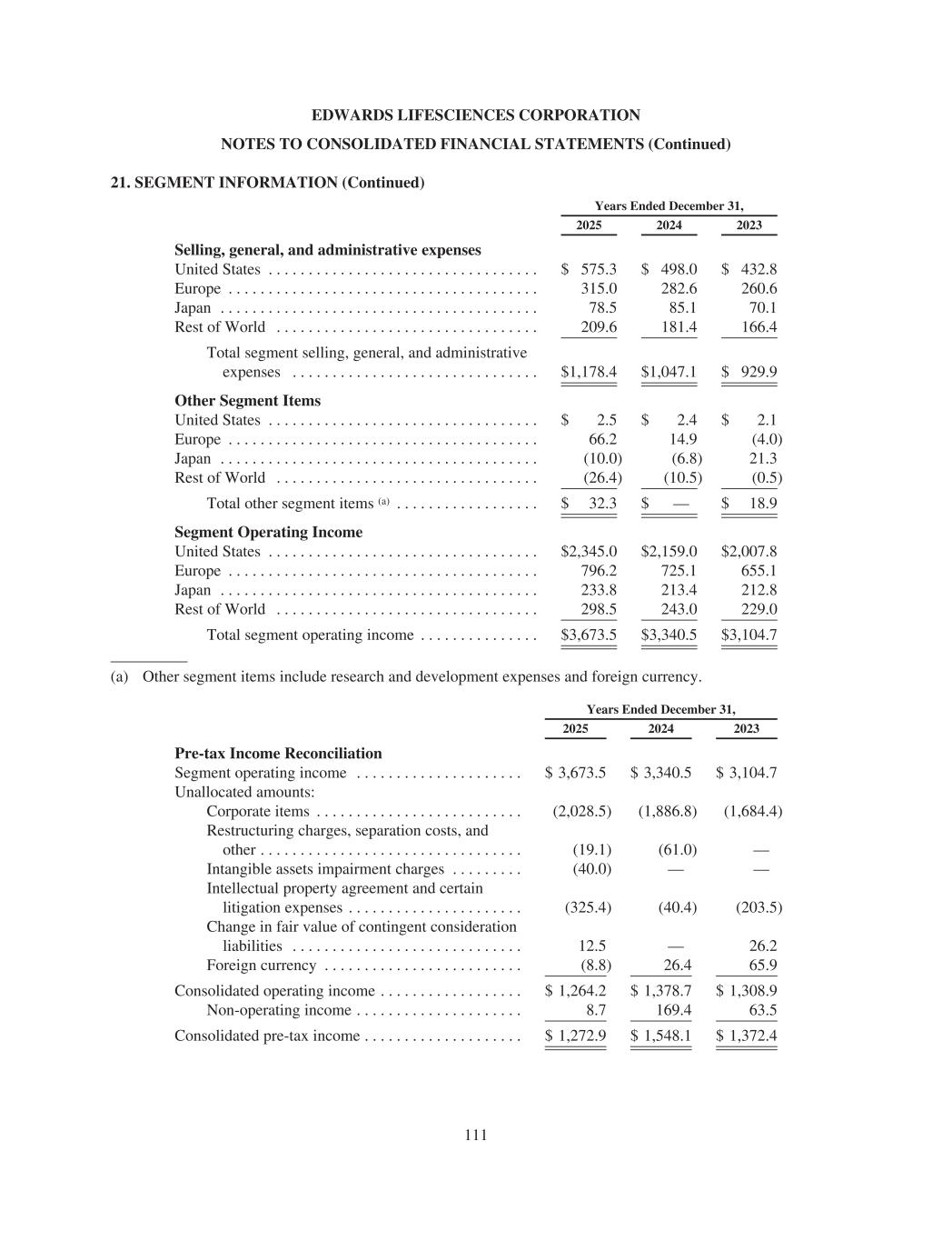 EDWARDS LIFESCIENCES CORPORATION NOTES TO CONSOLIDATED FINANCIAL STATEMENTS (Continued) 21. SEGMENT INFORMATION (Continued) Years Ended December 31, 2025 2024 2023 Selling, general, and administrative expenses United States . . . . . . . . . . . . . . . . . . . . . . . . . . . . . . . . . . $ 575.3 $ 498.0 $ 432.8 Europe . . . . . . . . . . . . . . . . . . . . . . . . . . . . . . . . . . . . . . . 315.0 282.6 260.6 Japan . . . . . . . . . . . . . . . . . . . . . . . . . . . . . . . . . . . . . . . . 78.5 85.1 70.1 Rest of World . . . . . . . . . . . . . . . . . . . . . . . . . . . . . . . . . 209.6 181.4 166.4 Total segment selling, general, and administrative expenses . . . . . . . . . . . . . . . . . . . . . . . . . . . . . . . $1,178.4 $1,047.1 $ 929.9 Other Segment Items United States . . . . . . . . . . . . . . . . . . . . . . . . . . . . . . . . . . $ 2.5 $ 2.4 $ 2.1 Europe . . . . . . . . . . . . . . . . . . . . . . . . . . . . . . . . . . . . . . . 66.2 14.9 (4.0) Japan . . . . . . . . . . . . . . . . . . . . . . . . . . . . . . . . . . . . . . . . (10.0) (6.8) 21.3 Rest of World . . . . . . . . . . . . . . . . . . . . . . . . . . . . . . . . . (26.4) (10.5) (0.5) Total other segment items (a) . . . . . . . . . . . . . . . . . . $ 32.3 $ — $ 18.9 Segment Operating Income United States . . . . . . . . . . . . . . . . . . . . . . . . . . . . . . . . . . $2,345.0 $2,159.0 $2,007.8 Europe . . . . . . . . . . . . . . . . . . . . . . . . . . . . . . . . . . . . . . . 796.2 725.1 655.1 Japan . . . . . . . . . . . . . . . . . . . . . . . . . . . . . . . . . . . . . . . . 233.8 213.4 212.8 Rest of World . . . . . . . . . . . . . . . . . . . . . . . . . . . . . . . . . 298.5 243.0 229.0 Total segment operating income . . . . . . . . . . . . . . . $3,673.5 $3,340.5 $3,104.7 (a) Other segment items include research and development expenses and foreign currency. Years Ended December 31, 2025 2024 2023 Pre-tax Income Reconciliation Segment operating income . . . . . . . . . . . . . . . . . . . . . $ 3,673.5 $ 3,340.5 $ 3,104.7 Unallocated amounts: Corporate items . . . . . . . . . . . . . . . . . . . . . . . . . . (2,028.5) (1,886.8) (1,684.4) Restructuring charges, separation costs, and other . . . . . . . . . . . . . . . . . . . . . . . . . . . . . . . . . (19.1) (61.0) — Intangible assets impairment charges . . . . . . . . . (40.0) — — Intellectual property agreement and certain litigation expenses . . . . . . . . . . . . . . . . . . . . . . (325.4) (40.4) (203.5) Change in fair value of contingent consideration liabilities . . . . . . . . . . . . . . . . . . . . . . . . . . . . . 12.5 — 26.2 Foreign currency . . . . . . . . . . . . . . . . . . . . . . . . . (8.8) 26.4 65.9 Consolidated operating income . . . . . . . . . . . . . . . . . . $ 1,264.2 $ 1,378.7 $ 1,308.9 Non-operating income . . . . . . . . . . . . . . . . . . . . . 8.7 169.4 63.5 Consolidated pre-tax income . . . . . . . . . . . . . . . . . . . . $ 1,272.9 $ 1,548.1 $ 1,372.4 111