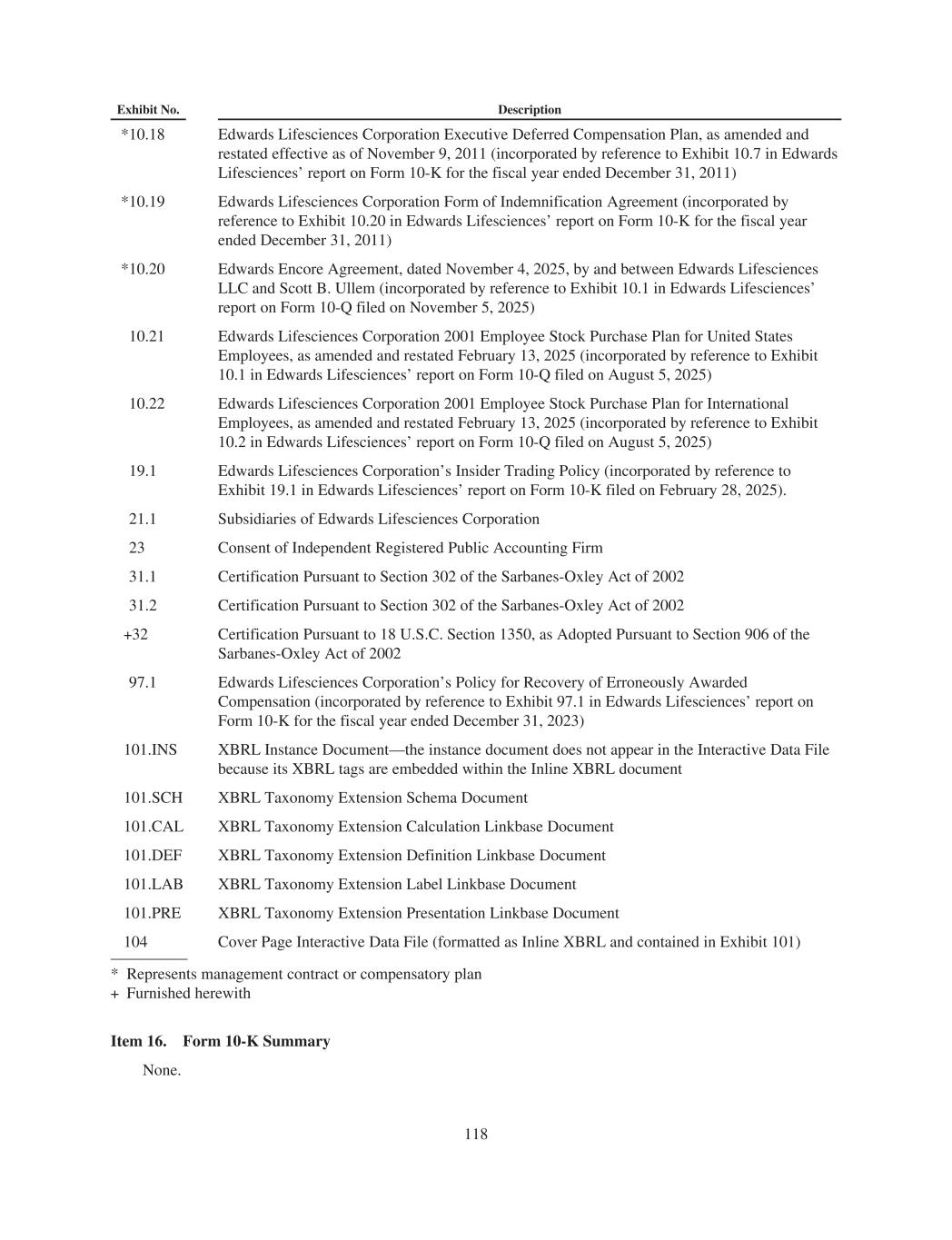 Exhibit No. Description *10.18 Edwards Lifesciences Corporation Executive Deferred Compensation Plan, as amended and restated effective as of November 9, 2011 (incorporated by reference to Exhibit 10.7 in Edwards Lifesciences’ report on Form 10-K for the fiscal year ended December 31, 2011) *10.19 Edwards Lifesciences Corporation Form of Indemnification Agreement (incorporated by reference to Exhibit 10.20 in Edwards Lifesciences’ report on Form 10-K for the fiscal year ended December 31, 2011) *10.20 Edwards Encore Agreement, dated November 4, 2025, by and between Edwards Lifesciences LLC and Scott B. Ullem (incorporated by reference to Exhibit 10.1 in Edwards Lifesciences’ report on Form 10-Q filed on November 5, 2025) 10.21 Edwards Lifesciences Corporation 2001 Employee Stock Purchase Plan for United States Employees, as amended and restated February 13, 2025 (incorporated by reference to Exhibit 10.1 in Edwards Lifesciences’ report on Form 10-Q filed on August 5, 2025) 10.22 Edwards Lifesciences Corporation 2001 Employee Stock Purchase Plan for International Employees, as amended and restated February 13, 2025 (incorporated by reference to Exhibit 10.2 in Edwards Lifesciences’ report on Form 10-Q filed on August 5, 2025) 19.1 Edwards Lifesciences Corporation’s Insider Trading Policy (incorporated by reference to Exhibit 19.1 in Edwards Lifesciences’ report on Form 10-K filed on February 28, 2025). 21.1 Subsidiaries of Edwards Lifesciences Corporation 23 Consent of Independent Registered Public Accounting Firm 31.1 Certification Pursuant to Section 302 of the Sarbanes-Oxley Act of 2002 31.2 Certification Pursuant to Section 302 of the Sarbanes-Oxley Act of 2002 +32 Certification Pursuant to 18 U.S.C. Section 1350, as Adopted Pursuant to Section 906 of the Sarbanes-Oxley Act of 2002 97.1 Edwards Lifesciences Corporation’s Policy for Recovery of Erroneously Awarded Compensation (incorporated by reference to Exhibit 97.1 in Edwards Lifesciences’ report on Form 10-K for the fiscal year ended December 31, 2023) 101.INS XBRL Instance Document—the instance document does not appear in the Interactive Data File because its XBRL tags are embedded within the Inline XBRL document 101.SCH XBRL Taxonomy Extension Schema Document 101.CAL XBRL Taxonomy Extension Calculation Linkbase Document 101.DEF XBRL Taxonomy Extension Definition Linkbase Document 101.LAB XBRL Taxonomy Extension Label Linkbase Document 101.PRE XBRL Taxonomy Extension Presentation Linkbase Document 104 Cover Page Interactive Data File (formatted as Inline XBRL and contained in Exhibit 101) * Represents management contract or compensatory plan + Furnished herewith Item 16. Form 10-K Summary None. 118