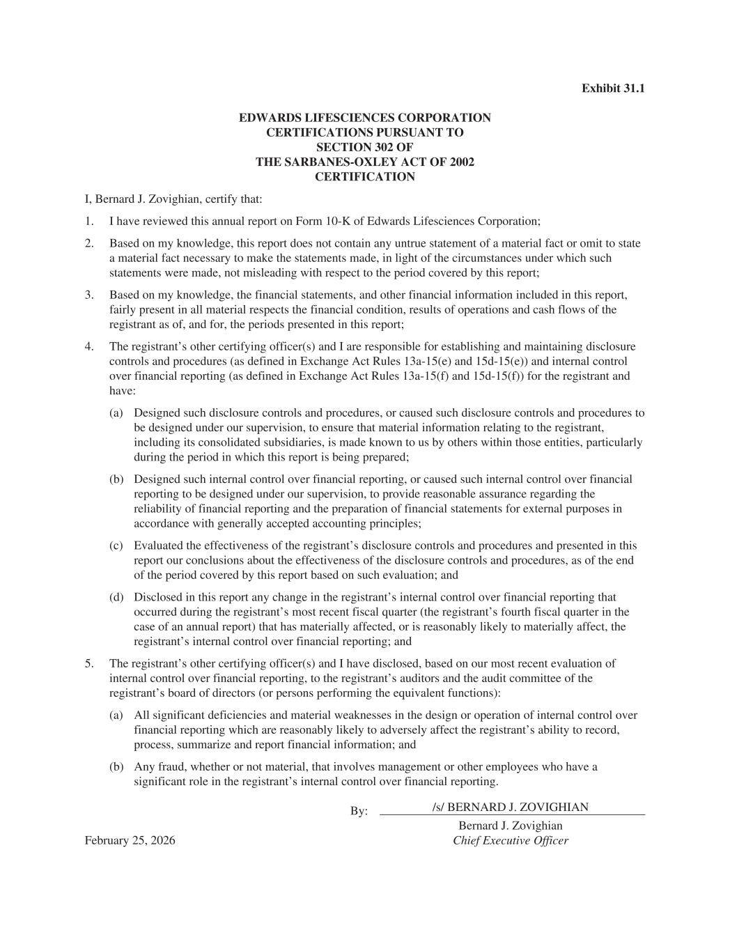 Exhibit 31.1 EDWARDS LIFESCIENCES CORPORATION CERTIFICATIONS PURSUANT TO SECTION 302 OF THE SARBANES-OXLEY ACT OF 2002 CERTIFICATION I, Bernard J. Zovighian, certify that: 1. I have reviewed this annual report on Form 10-K of Edwards Lifesciences Corporation; 2. Based on my knowledge, this report does not contain any untrue statement of a material fact or omit to state a material fact necessary to make the statements made, in light of the circumstances under which such statements were made, not misleading with respect to the period covered by this report; 3. Based on my knowledge, the financial statements, and other financial information included in this report, fairly present in all material respects the financial condition, results of operations and cash flows of the registrant as of, and for, the periods presented in this report; 4. The registrant’s other certifying officer(s) and I are responsible for establishing and maintaining disclosure controls and procedures (as defined in Exchange Act Rules 13a-15(e) and 15d-15(e)) and internal control over financial reporting (as defined in Exchange Act Rules 13a-15(f) and 15d-15(f)) for the registrant and have: (a) Designed such disclosure controls and procedures, or caused such disclosure controls and procedures to be designed under our supervision, to ensure that material information relating to the registrant, including its consolidated subsidiaries, is made known to us by others within those entities, particularly during the period in which this report is being prepared; (b) Designed such internal control over financial reporting, or caused such internal control over financial reporting to be designed under our supervision, to provide reasonable assurance regarding the reliability of financial reporting and the preparation of financial statements for external purposes in accordance with generally accepted accounting principles; (c) Evaluated the effectiveness of the registrant’s disclosure controls and procedures and presented in this report our conclusions about the effectiveness of the disclosure controls and procedures, as of the end of the period covered by this report based on such evaluation; and (d) Disclosed in this report any change in the registrant’s internal control over financial reporting that occurred during the registrant’s most recent fiscal quarter (the registrant’s fourth fiscal quarter in the case of an annual report) that has materially affected, or is reasonably likely to materially affect, the registrant’s internal control over financial reporting; and 5. The registrant’s other certifying officer(s) and I have disclosed, based on our most recent evaluation of internal control over financial reporting, to the registrant’s auditors and the audit committee of the registrant’s board of directors (or persons performing the equivalent functions): (a) All significant deficiencies and material weaknesses in the design or operation of internal control over financial reporting which are reasonably likely to adversely affect the registrant’s ability to record, process, summarize and report financial information; and (b) Any fraud, whether or not material, that involves management or other employees who have a significant role in the registrant’s internal control over financial reporting. By: /s/ BERNARD J. ZOVIGHIAN February 25, 2026 Bernard J. Zovighian Chief Executive Officer