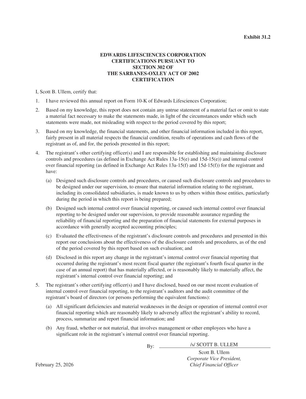 Exhibit 31.2 EDWARDS LIFESCIENCES CORPORATION CERTIFICATIONS PURSUANT TO SECTION 302 OF THE SARBANES-OXLEY ACT OF 2002 CERTIFICATION I, Scott B. Ullem, certify that: 1. I have reviewed this annual report on Form 10-K of Edwards Lifesciences Corporation; 2. Based on my knowledge, this report does not contain any untrue statement of a material fact or omit to state a material fact necessary to make the statements made, in light of the circumstances under which such statements were made, not misleading with respect to the period covered by this report; 3. Based on my knowledge, the financial statements, and other financial information included in this report, fairly present in all material respects the financial condition, results of operations and cash flows of the registrant as of, and for, the periods presented in this report; 4. The registrant’s other certifying officer(s) and I are responsible for establishing and maintaining disclosure controls and procedures (as defined in Exchange Act Rules 13a-15(e) and 15d-15(e)) and internal control over financial reporting (as defined in Exchange Act Rules 13a-15(f) and 15d-15(f)) for the registrant and have: (a) Designed such disclosure controls and procedures, or caused such disclosure controls and procedures to be designed under our supervision, to ensure that material information relating to the registrant, including its consolidated subsidiaries, is made known to us by others within those entities, particularly during the period in which this report is being prepared; (b) Designed such internal control over financial reporting, or caused such internal control over financial reporting to be designed under our supervision, to provide reasonable assurance regarding the reliability of financial reporting and the preparation of financial statements for external purposes in accordance with generally accepted accounting principles; (c) Evaluated the effectiveness of the registrant’s disclosure controls and procedures and presented in this report our conclusions about the effectiveness of the disclosure controls and procedures, as of the end of the period covered by this report based on such evaluation; and (d) Disclosed in this report any change in the registrant’s internal control over financial reporting that occurred during the registrant’s most recent fiscal quarter (the registrant’s fourth fiscal quarter in the case of an annual report) that has materially affected, or is reasonably likely to materially affect, the registrant’s internal control over financial reporting; and 5. The registrant’s other certifying officer(s) and I have disclosed, based on our most recent evaluation of internal control over financial reporting, to the registrant’s auditors and the audit committee of the registrant’s board of directors (or persons performing the equivalent functions): (a) All significant deficiencies and material weaknesses in the design or operation of internal control over financial reporting which are reasonably likely to adversely affect the registrant’s ability to record, process, summarize and report financial information; and (b) Any fraud, whether or not material, that involves management or other employees who have a significant role in the registrant’s internal control over financial reporting. By: /s/ SCOTT B. ULLEM February 25, 2026 Scott B. Ullem Corporate Vice President, Chief Financial Officer