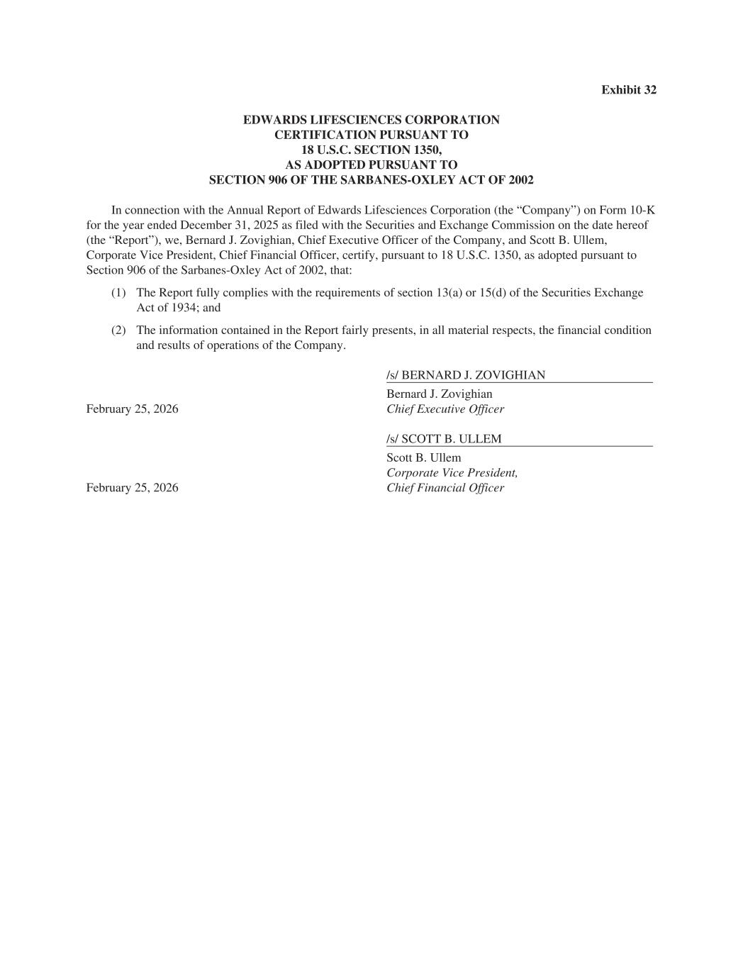 Exhibit 32 EDWARDS LIFESCIENCES CORPORATION CERTIFICATION PURSUANT TO 18 U.S.C. SECTION 1350, AS ADOPTED PURSUANT TO SECTION 906 OF THE SARBANES-OXLEY ACT OF 2002 In connection with the Annual Report of Edwards Lifesciences Corporation (the “Company”) on Form 10-K for the year ended December 31, 2025 as filed with the Securities and Exchange Commission on the date hereof (the “Report”), we, Bernard J. Zovighian, Chief Executive Officer of the Company, and Scott B. Ullem, Corporate Vice President, Chief Financial Officer, certify, pursuant to 18 U.S.C. 1350, as adopted pursuant to Section 906 of the Sarbanes-Oxley Act of 2002, that: (1) The Report fully complies with the requirements of section 13(a) or 15(d) of the Securities Exchange Act of 1934; and (2) The information contained in the Report fairly presents, in all material respects, the financial condition and results of operations of the Company. /s/ BERNARD J. ZOVIGHIAN Bernard J. Zovighian February 25, 2026 Chief Executive Officer /s/ SCOTT B. ULLEM Scott B. Ullem February 25, 2026 Corporate Vice President, Chief Financial Officer