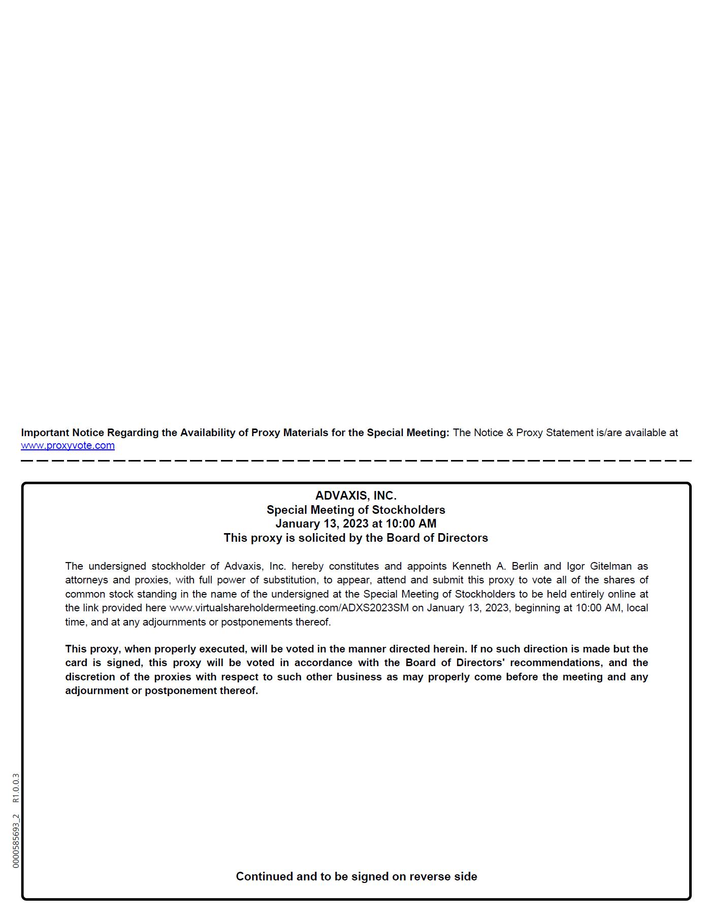 This Notice of Special Meeting of Stockholders, Proxy Statement and the proxy card are available online at: www.virtualshareholdermeeting.com/ADXS2023SM.