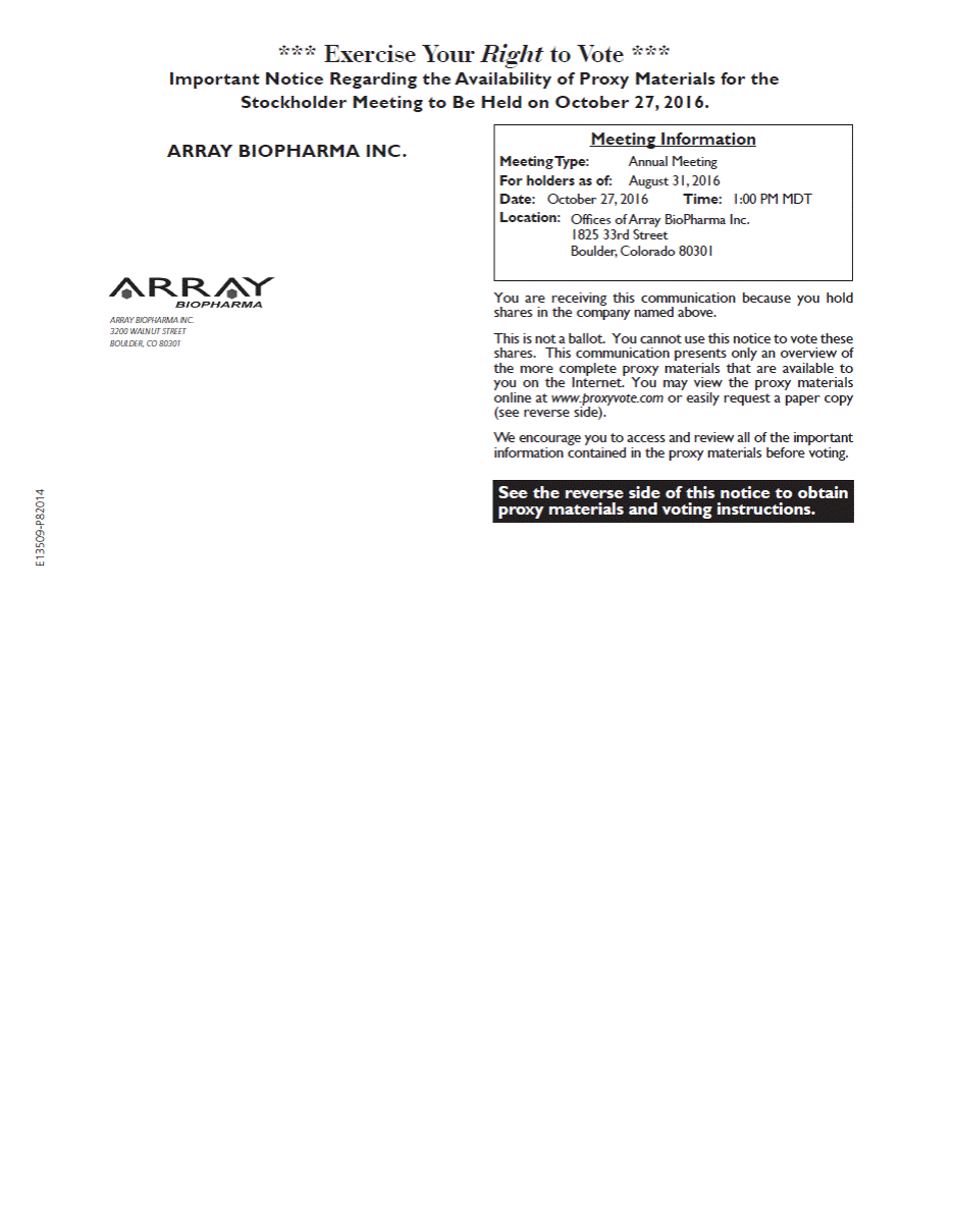 *** Exercise Your Right to Vote *** Important Notice Regarding the Availability of Proxy Materials for the Stockholder Meeting to Be Held on October 27, 2016. ARRAY BIOPHARMA INC. You are receiving this communication because you hold shares in the company named above. This is not a ballot. You cannot use this notice to vote these shares. This communication presents only an overview of ARRAY BIOPHARMA INC. 3200 WALNUT STREET BOULDER, CO 80301 the more complete proxy materials that are available to you on the Internet. You may view the proxy materials online at www.proxyvote.com or easily request a paper copy (see reverse side). We encourage you to access and review all of the important information contained in the proxy materials before voting. proxy materials and voting instructions. E13509-P82014 See the reverse side of this notice to obtain Meeting Information Meeting Type:Annual Meeting For holders as of:August 31, 2016 Date: October 27, 2016Time: 1:00 PM MDT Location: Offices of Array BioPharma Inc. 1825 33rd Street Boulder, Colorado 80301