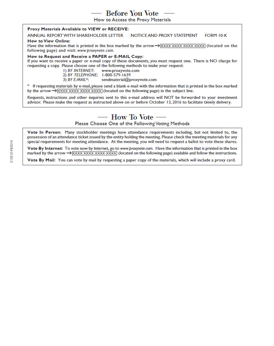 Before You Vote How to Access the Proxy Materials Have the information that is printed in the box marked by the arrow XXXX XXXX XXXX XXXX (located on the by the arrow XXXX XXXX XXXX XXXX (located on the following page) in the subject line. How To Vote Please Choose One of the Following Voting Methods marked by the arrow XXXX XXXX XXXX XXXX (located on the following page) available and follow the instructions. E13510-P82014 Vote In Person: Many stockholder meetings have attendance requirements including, but not limited to, the possession of an attendance ticket issued by the entity holding the meeting. Please check the meeting materials for any special requirements for meeting attendance. At the meeting, you will need to request a ballot to vote these shares. Vote By Internet: To vote now by Internet, go to www.proxyvote.com. Have the information that is printed in the box Vote By Mail: You can vote by mail by requesting a paper copy of the materials, which will include a proxy card. Proxy Materials AAvvaaiillaabbllee ttooVVIEIEWWoorrRREECCEEIVIVEE: : ANNUAL REPORT WITH SHAREHOLDER LETTERNOTICE AND PROXY STATEMENTFORM 10-K How to View Online: following page) and visit: www.proxyvote .com. How to Request and Receive a PAPER or E-MAIL Copy: If you want to receive a paper or e-mail copy of these documents, you must request one. There is NO charge for requesting a copy. Please choose one of the following methods to make your request: 1) BY INTERNET:www.proxyvote.com 2) BY TELEPHONE: 1-800-579-1639 3) BY E-MAIL*:sendmaterial@proxyvote.com * If requesting materials by e-mail, please send a blank e-mail with the information that is printed in the box marked Requests, instructions and other inquiries sent to this e-mail address will NOT be forwarded to your investment advisor. Please make the request as instructed above on or before October 13, 2016 to facilitate timely delivery.