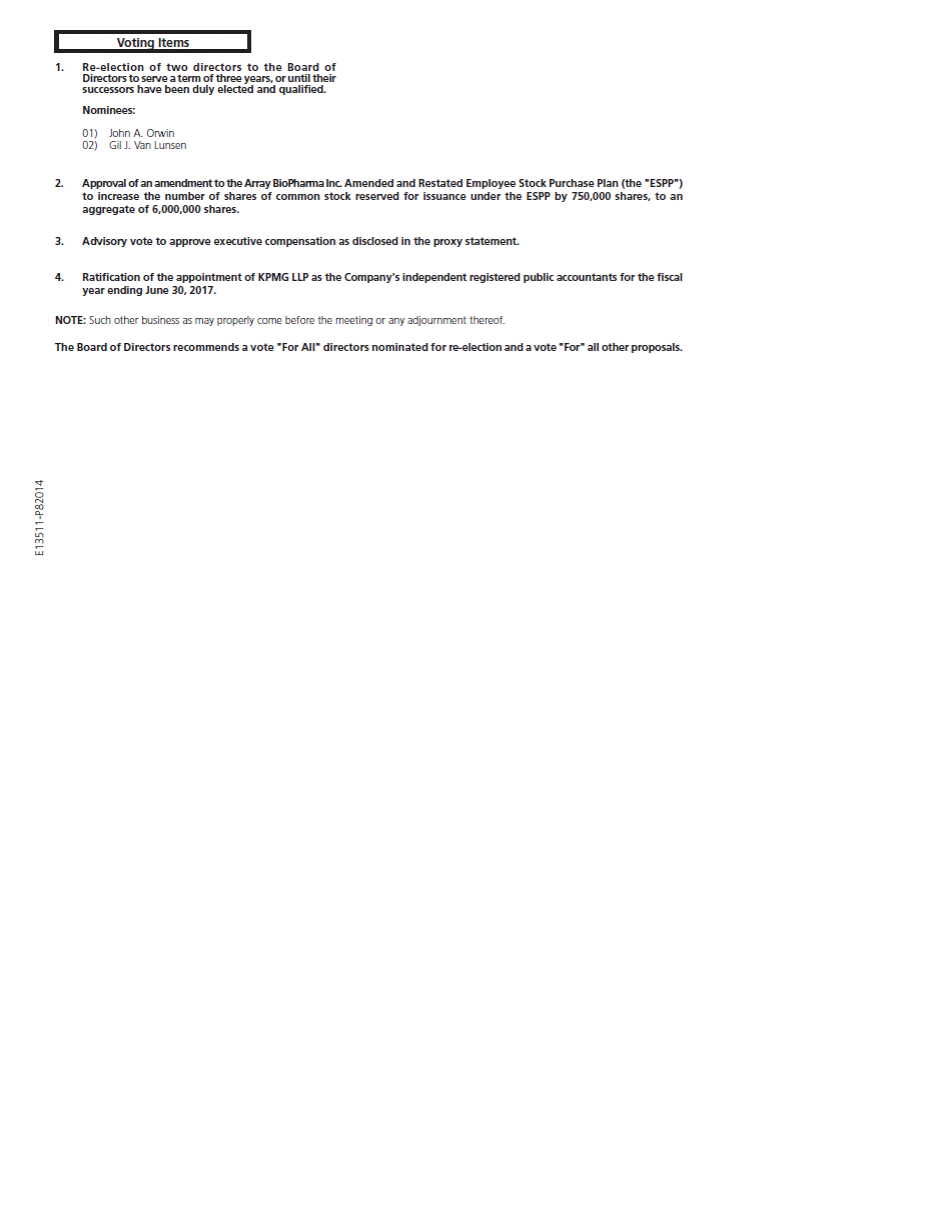 1. Re-election of two directors to the Board of Directors to serve a term of three years, or until their successors have been duly elected and qualified. Nominees: 01) John A. Orwin 02) Gil J. Van Lunsen 2. Approval of an amendment to the Array BioPharma Inc. Amended and Restated Employee Stock Purchase Plan (the "ESPP") to increase the number of shares of common stock reserved for issuance under the ESPP by 750,000 shares, to an aggregate of 6,000,000 shares. 3. Advisory vote to approve executive compensation as disclosed in the proxy statement. 4. Ratification of the appointment of KPMG LLP as the Company's independent registered public accountants for the fiscal year ending June 30, 2017. NOTE: Such other business as may properly come before the meeting or any adjournment thereof. The Board of Directors recommends a vote "For All" directors nominated for re-election and a vote "For" all other proposals. E13511-P82014 Voting Items