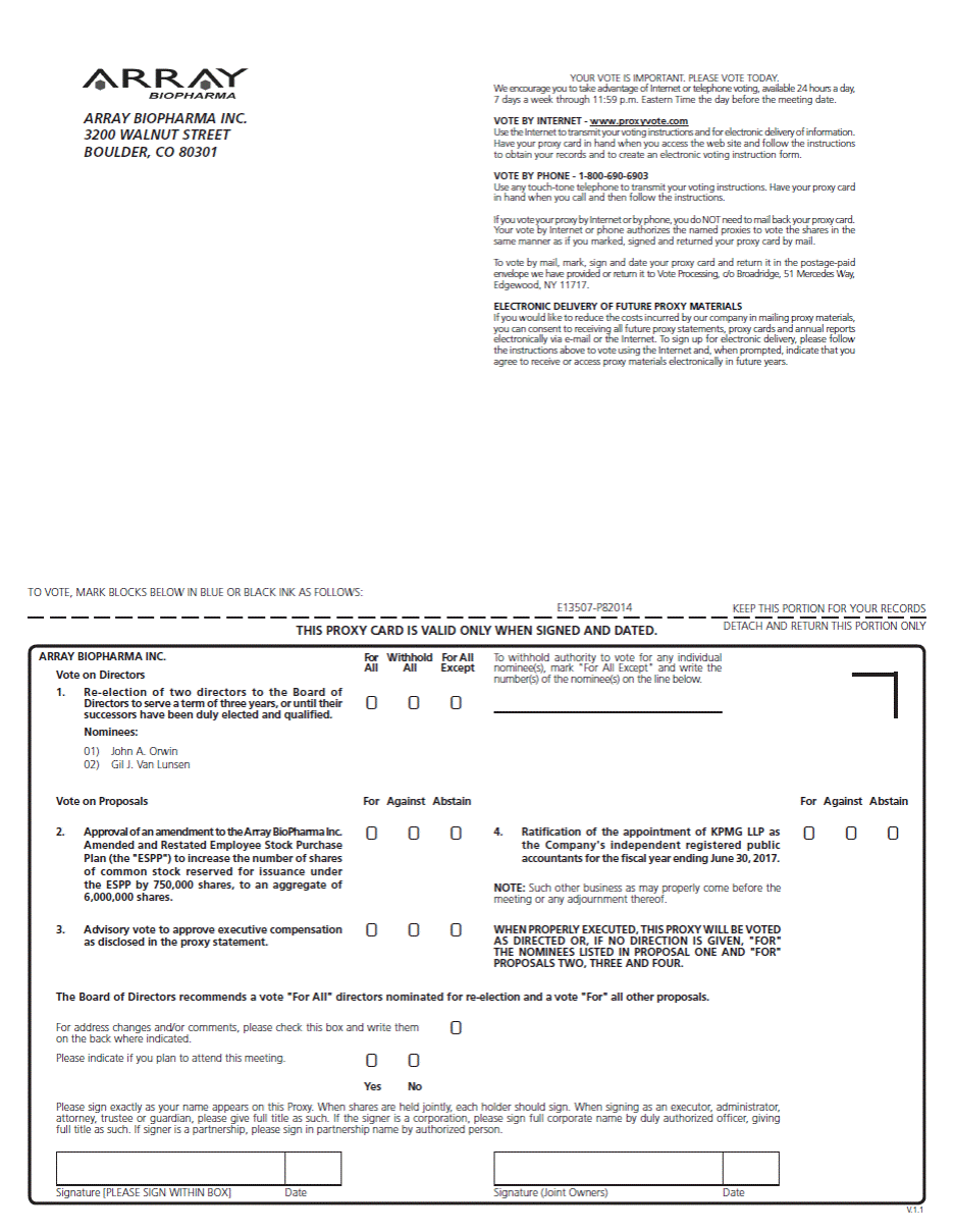 YOUR VOTE IS IMPORTANT. PLEASE VOTE TODAY. We encourage you to take advantage of Internet or telephone voting, available 24 hours a day, 7 days a week through 11:59 p.m. Eastern Time the day before the meeting date. ARRAY BIOPHARMA INC. 3200 WALNUT STREET BOULDER, CO 80301 VOTE BY INTERNET - www.proxyvote.com Use the Internet to transmit your voting instructions and for electronic delivery of information. Have your proxy card in hand when you access the web site and follow the instructions to obtain your records and to create an electronic voting instruction form. VOTE BY PHONE - 1-800-690-6903 Use any touch-tone telephone to transmit your voting instructions. Have your proxy card in hand when you call and then follow the instructions. If you vote your proxy by Internet or by phone, you do NOT need to mail back your proxy card. Your vote by Internet or phone authorizes the named proxies to vote the shares in the same manner as if you marked, signed and returned your proxy card by mail. To vote by mail, mark, sign and date your proxy card and return it in the postage-paid envelope we have provided or return it to Vote Processing, c/o Broadridge, 51 Mercedes Way, Edgewood, NY 11717. ELECTRONIC DELIVERY OF FUTURE PROXY MATERIALS If you would like to reduce the costs incurred by our company in mailing proxy materials, you can consent to receiving all future proxy statements, proxy cards and annual reports electronically via e-mail or the Internet. To sign up for electronic delivery, please follow the instructions above to vote using the Internet and, when prompted, indicate that you agree to receive or access proxy materials electronically in future years. TO VOTE, MARK BLOCKS BELOW IN BLUE OR BLACK INK AS FOLLOWS: E13507-P82014 KEEP THIS PORTION FOR YOUR RECORDS DETACH AND RETURN THIS PORTION ONLY THIS PROXY CARD IS VALID ONLY WHEN SIGNED AND DATED. ARRAY BIOPHARMA INC. Vote on Directors For All Withhold All For All Except To withhold authority to vote for any individual nominee(s), mark "For All Except" and write the number(s) of the nominee(s) on the line below. 1. Re-election of two directors to the Board of Directors to serve a term of three years, or until their successors have been duly elected and qualified. Nominees: 01) John A. Orwin 02) Gil J. Van Lunsen ! ! ! For Against Abstain Vote on Proposals For Against Abstain ! ! ! ! ! ! 2. Approval of an amendment to the Array BioPharma Inc. Amended and Restated Employee Stock Purchase Plan (the "ESPP") to increase the number of shares of common stock reserved for issuance under the ESPP by 750,000 shares, to an aggregate of 6,000,000 shares. 4. Ratification of the appointment of KPMG LLP as the Company's independent registered public accountants for the fiscal year ending June 30, 2017. NOTE: Such other business as may properly come before the meeting or any adjournment thereof. ! ! ! 3. Advisory vote to approve executive compensation as disclosed in the proxy statement. WHEN PROPERLY EXECUTED, THIS PROXY WILL BE VOTED AS DIRECTED OR, IF NO DIRECTION IS GIVEN, "FOR" THE NOMINEES LISTED IN PROPOSAL ONE AND "FOR" PROPOSALS TWO, THREE AND FOUR. The Board of Directors recommends a vote "For All" directors nominated for re-election and a vote "For" all other proposals. ! For address changes and/or comments, please check this box and write them on the back where indicated. ! Yes ! No Please indicate if you plan to attend this meeting. Please sign exactly as your name appears on this Proxy. When shares are held jointly, each holder should sign. When signing as an executor, administrator, attorney, trustee or guardian, please give full title as such. If the signer is a corporation, please sign full corporate name by duly authorized officer, giving full title as such. If signer is a partnership, please sign in partnership name by authorized person. Signature [PLEASE SIGN WITHIN BOX] Date Signature (Joint Owners) Date V.1.1