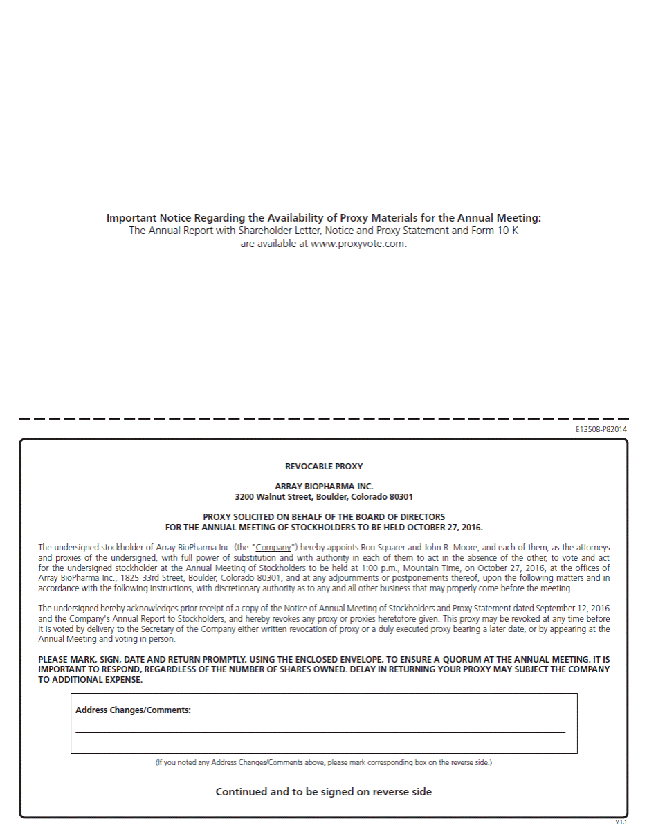 Important Notice Regarding the Availability of Proxy Materials for the Annual Meeting: The Annual Report with Shareholder Letter, Notice and Proxy Statement and Form 10-K are available at www.proxyvote.com. E13508-P82014 REVOCABLE PROXY ARRAY BIOPHARMA INC. 3200 Walnut Street, Boulder, Colorado 80301 PROXY SOLICITED ON BEHALF OF THE BOARD OF DIRECTORS FOR THE ANNUAL MEETING OF STOCKHOLDERS TO BE HELD OCTOBER 27, 2016. The undersigned stockholder of Array BioPharma Inc. (the "Company") hereby appoints Ron Squarer and John R. Moore, and each of them, as the attorneys and proxies of the undersigned, with full power of substitution and with authority in each of them to act in the absence of the other, to vote and act for the undersigned stockholder at the Annual Meeting of Stockholders to be held at 1:00 p.m., Mountain Time, on October 27, 2016, at the offices of Array BioPharma Inc., 1825 33rd Street, Boulder, Colorado 80301, and at any adjournments or postponements thereof, upon the following matters and in accordance with the following instructions, with discretionary authority as to any and all other business that may properly come before the meeting. The undersigned hereby acknowledges prior receipt of a copy of the Notice of Annual Meeting of Stockholders and Proxy Statement dated September 12, 2016 and the Company's Annual Report to Stockholders, and hereby revokes any proxy or proxies heretofore given. This proxy may be revoked at any time before it is voted by delivery to the Secretary of the Company either written revocation of proxy or a duly executed proxy bearing a later date, or by appearing at the Annual Meeting and voting in person. PLEASE MARK, SIGN, DATE AND RETURN PROMPTLY, USING THE ENCLOSED ENVELOPE, TO ENSURE A QUORUM AT THE ANNUAL MEETING. IT IS IMPORTANT TO RESPOND, REGARDLESS OF THE NUMBER OF SHARES OWNED. DELAY IN RETURNING YOUR PROXY MAY SUBJECT THE COMPANY TO ADDITIONAL EXPENSE. (If you noted any Address Changes/Comments above, please mark corresponding box on the reverse side.) Continued and to be signed on reverse side V.1.1 Address Changes/Comments: