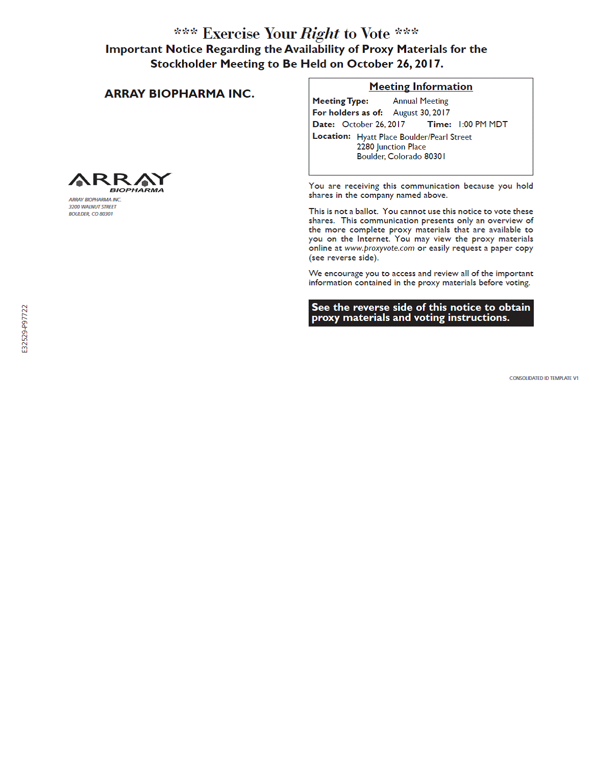 *** Exercise Your Right to Vote *** Important Notice Regarding the Availability of Proxy Materials for the Stockholder Meeting to Be Held on October 26, 2017. ARRAY BIOPHARMA INC. You are receiving this communication because you hold shares in the company named above. This is not a ballot. You cannot use this notice to vote these shares. This communication presents only an overview of ARRAY BIOPHARMA INC. 3200 WALNUT STREET BOULDER, CO 80301 the more complete proxy materials that are available to you on the Internet. You may view the proxy materials online at www.proxyvote.com or easily request a paper copy (see reverse side). We encourage you to access and review all of the important information contained in the proxy materials before voting. proxy materials and voting instructions. CONSOLIDATED ID TEMPLATE V1 E32529-P97722 See the reverse side of this notice to obtain Meeting Information Meeting Type:Annual Meeting For holders as of:August 30, 2017 Date: October 26, 2017Time: 1:00 PM MDT Location: Hyatt Place Boulder/Pearl Street 2280 Junction Place Boulder, Colorado 80301