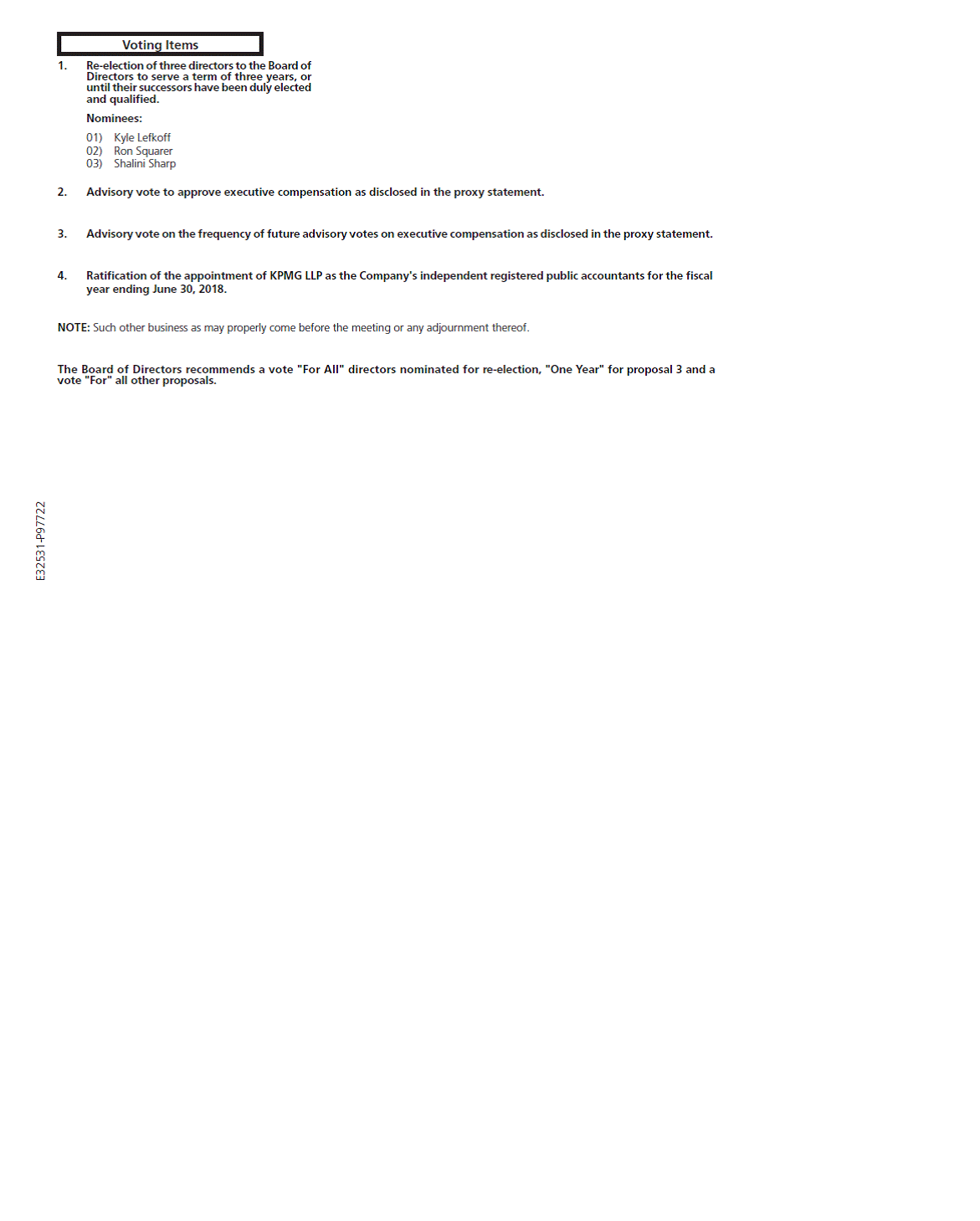 1. Re-election of three directors to the Board of Directors to serve a term of three years, or until their successors have been duly elected and qualified. Nominees: 01) 02) 03) Kyle Lefkoff Ron Squarer Shalini Sharp 2. Advisory vote to approve executive compensation as disclosed in the proxy statement. 3. Advisory vote on the frequency of future advisory votes on executive compensation as disclosed in the proxy statement. 4. Ratification of the appointment of KPMG LLP as the Company's independent registered public accountants for the fiscal year ending June 30, 2018. NOTE: Such other business as may properly come before the meeting or any adjournment thereof. The Board of Directors recommends a vote "For All" directors nominated for re-election, "One Year" for proposal 3 and a vote "For" all other proposals. E32531-P97722 Voting Items