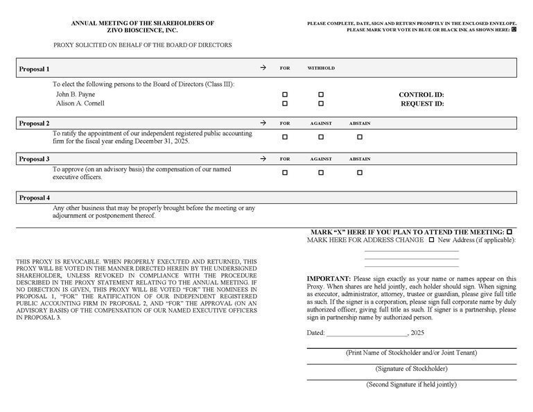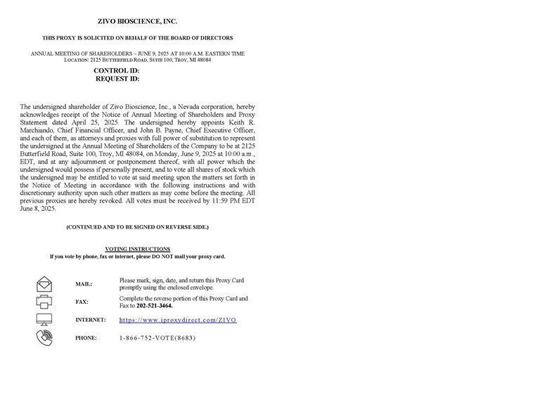 We are pleased to invite you to attend our 2025 Annual Meeting of Shareholders (the “Annual Meeting”) of Zivo Bioscience, Inc. to be held on Monday, June 9, 2025, at 10:00 a.m. Eastern Time at 2125 Butterfield Road, Troy, MI 48084.