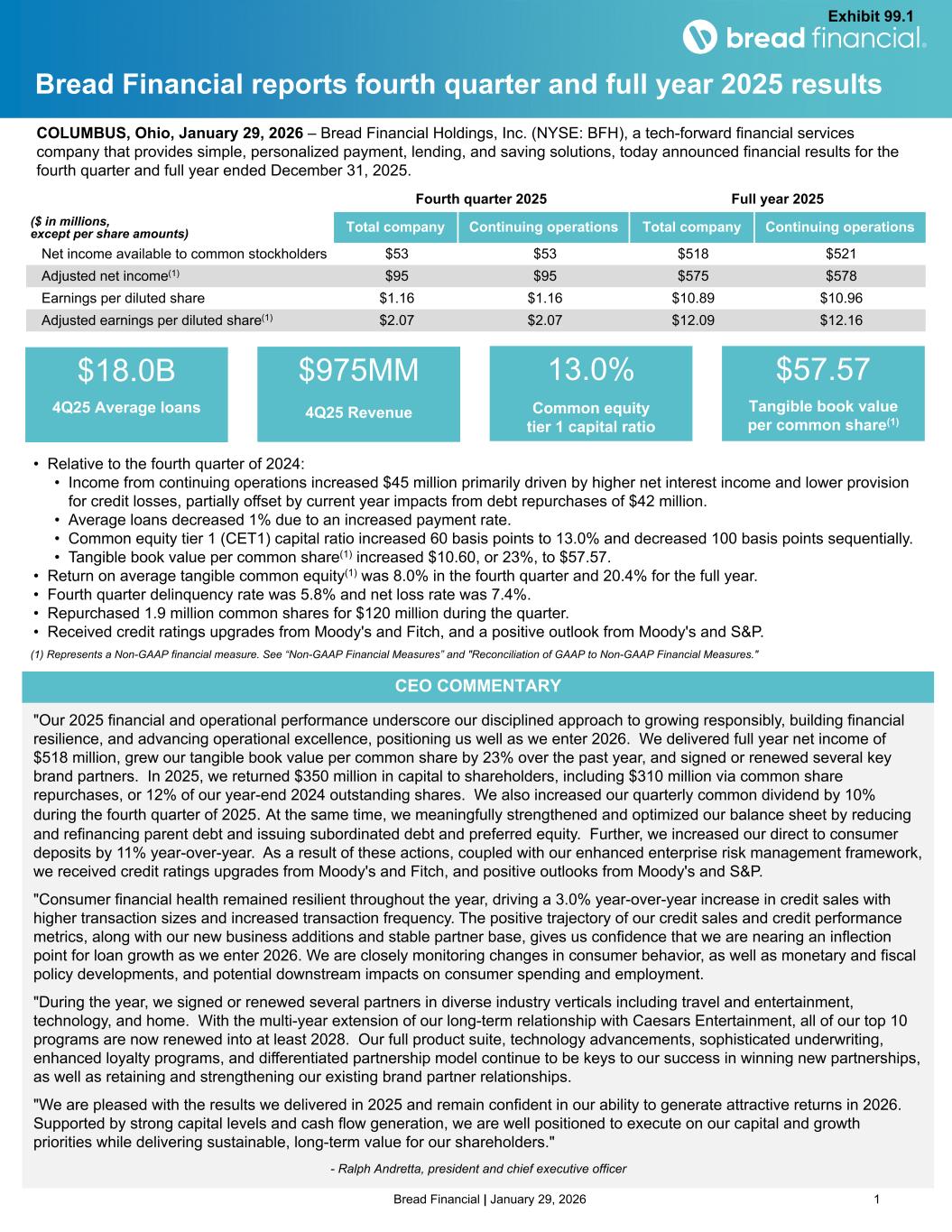 Bread Financial | January 29, 2026 1 "Our 2025 financial and operational performance underscore our disciplined approach to growing responsibly, building financial resilience, and advancing operational excellence, positioning us well as we enter 2026. We delivered full year net income of $518 million, grew our tangible book value per common share by 23% over the past year, and signed or renewed several key brand partners. In 2025, we returned $350 million in capital to shareholders, including $310 million via common share repurchases, or 12% of our year-end 2024 outstanding shares. We also increased our quarterly common dividend by 10% during the fourth quarter of 2025. At the same time, we meaningfully strengthened and optimized our balance sheet by reducing and refinancing parent debt and issuing subordinated debt and preferred equity. Further, we increased our direct to consumer deposits by 11% year-over-year. As a result of these actions, coupled with our enhanced enterprise risk management framework, we received credit ratings upgrades from Moody's and Fitch, and positive outlooks from Moody's and S&P. "Consumer financial health remained resilient throughout the year, driving a 3.0% year-over-year increase in credit sales with higher transaction sizes and increased transaction frequency. The positive trajectory of our credit sales and credit performance metrics, along with our new business additions and stable partner base, gives us confidence that we are nearing an inflection point for loan growth as we enter 2026. We are closely monitoring changes in consumer behavior, as well as monetary and fiscal policy developments, and potential downstream impacts on consumer spending and employment. "During the year, we signed or renewed several partners in diverse industry verticals including travel and entertainment, technology, and home. With the multi-year extension of our long-term relationship with Caesars Entertainment, all of our top 10 programs are now renewed into at least 2028. Our full product suite, technology advancements, sophisticated underwriting, enhanced loyalty programs, and differentiated partnership model continue to be keys to our success in winning new partnerships, as well as retaining and strengthening our existing brand partner relationships. "We are pleased with the results we delivered in 2025 and remain confident in our ability to generate attractive returns in 2026. Supported by strong capital levels and cash flow generation, we are well positioned to execute on our capital and growth priorities while delivering sustainable, long-term value for our shareholders." - Ralph Andretta, president and chief executive officer Bread Financial reports fourth quarter and full year 2025 results COLUMBUS, Ohio, January 29, 2026 – Bread Financial Holdings, Inc. (NYSE: BFH), a tech-forward financial services company that provides simple, personalized payment, lending, and saving solutions, today announced financial results for the fourth quarter and full year ended December 31, 2025. (1) Represents a Non-GAAP financial measure. See “Non-GAAP Financial Measures” and "Reconciliation of GAAP to Non-GAAP Financial Measures." $18.0B 4Q25 Average loans $975MM 4Q25 Revenue 13.0% Common equity tier 1 capital ratio $57.57 Tangible book value per common share(1) Fourth quarter 2025 Full year 2025 ($ in millions, except per share amounts) Total company Continuing operations Total company Continuing operations Net income available to common stockholders $53 $53 $518 $521 Adjusted net income(1) $95 $95 $575 $578 Earnings per diluted share $1.16 $1.16 $10.89 $10.96 Adjusted earnings per diluted share(1) $2.07 $2.07 $12.09 $12.16 • Relative to the fourth quarter of 2024: • Income from continuing operations increased $45 million primarily driven by higher net interest income and lower provision for credit losses, partially offset by current year impacts from debt repurchases of $42 million. • Average loans decreased 1% due to an increased payment rate. • Common equity tier 1 (CET1) capital ratio increased 60 basis points to 13.0% and decreased 100 basis points sequentially. • Tangible book value per common share(1) increased $10.60, or 23%, to $57.57. • Return on average tangible common equity(1) was 8.0% in the fourth quarter and 20.4% for the full year. • Fourth quarter delinquency rate was 5.8% and net loss rate was 7.4%. • Repurchased 1.9 million common shares for $120 million during the quarter. • Received credit ratings upgrades from Moody's and Fitch, and a positive outlook from Moody's and S&P. CEO COMMENTARY