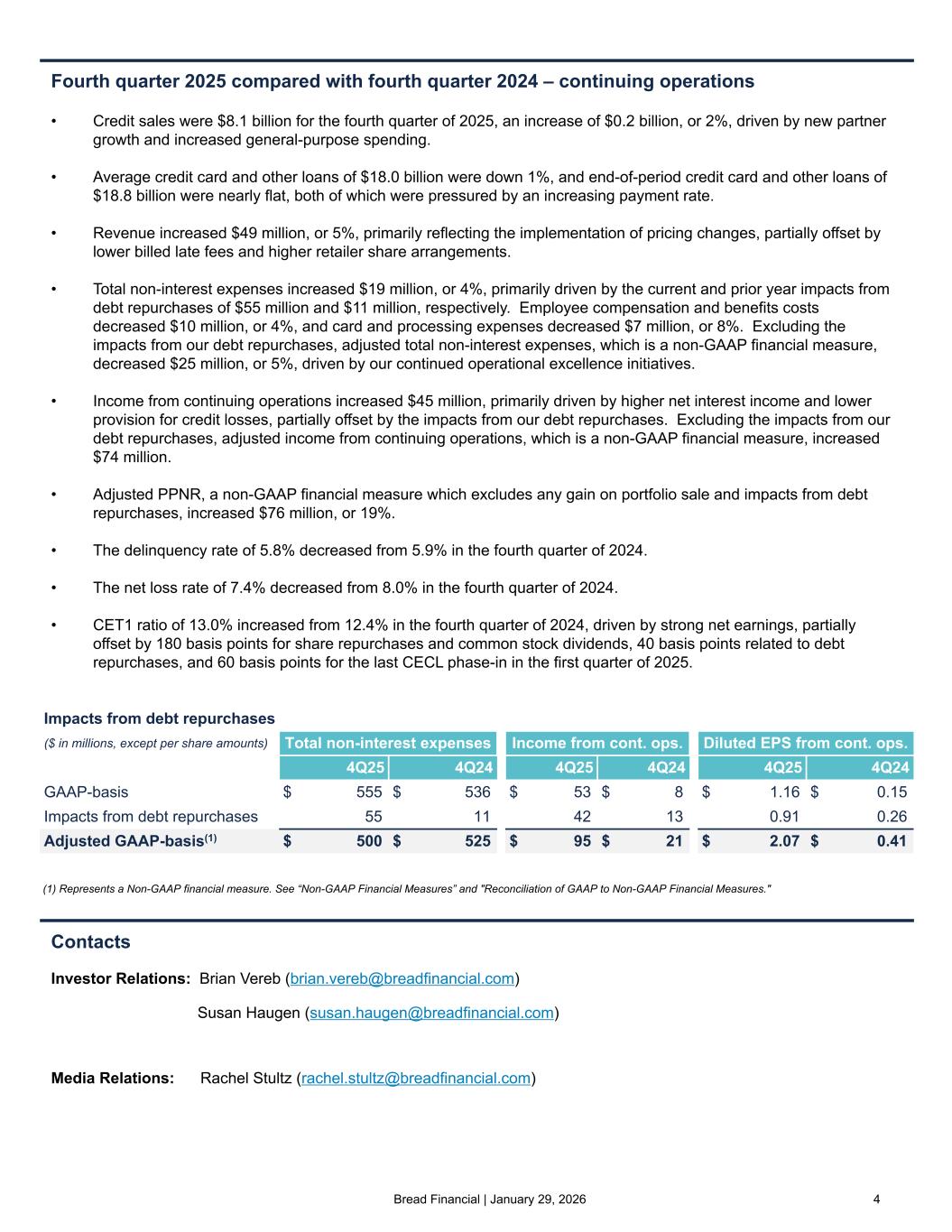Bread Financial | January 29, 2026 4 Fourth quarter 2025 compared with fourth quarter 2024 – continuing operations • Credit sales were $8.1 billion for the fourth quarter of 2025, an increase of $0.2 billion, or 2%, driven by new partner growth and increased general-purpose spending. • Average credit card and other loans of $18.0 billion were down 1%, and end-of-period credit card and other loans of $18.8 billion were nearly flat, both of which were pressured by an increasing payment rate. • Revenue increased $49 million, or 5%, primarily reflecting the implementation of pricing changes, partially offset by lower billed late fees and higher retailer share arrangements. • Total non-interest expenses increased $19 million, or 4%, primarily driven by the current and prior year impacts from debt repurchases of $55 million and $11 million, respectively. Employee compensation and benefits costs decreased $10 million, or 4%, and card and processing expenses decreased $7 million, or 8%. Excluding the impacts from our debt repurchases, adjusted total non-interest expenses, which is a non-GAAP financial measure, decreased $25 million, or 5%, driven by our continued operational excellence initiatives. • Income from continuing operations increased $45 million, primarily driven by higher net interest income and lower provision for credit losses, partially offset by the impacts from our debt repurchases. Excluding the impacts from our debt repurchases, adjusted income from continuing operations, which is a non-GAAP financial measure, increased $74 million. • Adjusted PPNR, a non-GAAP financial measure which excludes any gain on portfolio sale and impacts from debt repurchases, increased $76 million, or 19%. • The delinquency rate of 5.8% decreased from 5.9% in the fourth quarter of 2024. • The net loss rate of 7.4% decreased from 8.0% in the fourth quarter of 2024. • CET1 ratio of 13.0% increased from 12.4% in the fourth quarter of 2024, driven by strong net earnings, partially offset by 180 basis points for share repurchases and common stock dividends, 40 basis points related to debt repurchases, and 60 basis points for the last CECL phase-in in the first quarter of 2025. Contacts Investor Relations: Brian Vereb (brian.vereb@breadfinancial.com) Susan Haugen (susan.haugen@breadfinancial.com) Media Relations: Rachel Stultz (rachel.stultz@breadfinancial.com) (1) Represents a Non-GAAP financial measure. See “Non-GAAP Financial Measures” and "Reconciliation of GAAP to Non-GAAP Financial Measures." Impacts from debt repurchases ($ in millions, except per share amounts) Total non-interest expenses Income from cont. ops. Diluted EPS from cont. ops. 4Q25 4Q24 4Q25 4Q24 4Q25 4Q24 GAAP-basis $ 555 $ 536 $ 53 $ 8 $ 1.16 $ 0.15 Impacts from debt repurchases 55 11 42 13 0.91 0.26 Adjusted GAAP-basis(1) $ 500 $ 525 $ 95 $ 21 $ 2.07 $ 0.41
