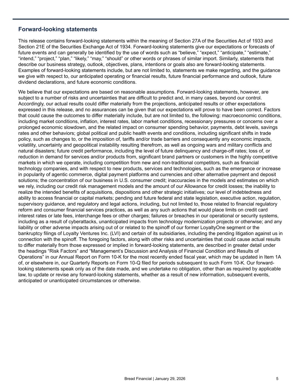Bread Financial | January 29, 2026 5 Forward-looking statements This release contains forward-looking statements within the meaning of Section 27A of the Securities Act of 1933 and Section 21E of the Securities Exchange Act of 1934. Forward-looking statements give our expectations or forecasts of future events and can generally be identified by the use of words such as “believe,” “expect,” “anticipate,” “estimate,” “intend,” “project,” “plan,” “likely,” “may,” “should” or other words or phrases of similar import. Similarly, statements that describe our business strategy, outlook, objectives, plans, intentions or goals also are forward-looking statements. Examples of forward-looking statements include, but are not limited to, statements we make regarding, and the guidance we give with respect to, our anticipated operating or financial results, future financial performance and outlook, future dividend declarations, and future economic conditions. We believe that our expectations are based on reasonable assumptions. Forward-looking statements, however, are subject to a number of risks and uncertainties that are difficult to predict and, in many cases, beyond our control. Accordingly, our actual results could differ materially from the projections, anticipated results or other expectations expressed in this release, and no assurances can be given that our expectations will prove to have been correct. Factors that could cause the outcomes to differ materially include, but are not limited to, the following: macroeconomic conditions, including market conditions, inflation, interest rates, labor market conditions, recessionary pressures or concerns over a prolonged economic slowdown, and the related impact on consumer spending behavior, payments, debt levels, savings rates and other behaviors; global political and public health events and conditions, including significant shifts in trade policy, such as changes to, or the imposition of, tariffs and/or trade barriers and consequently any economic impacts, volatility, uncertainty and geopolitical instability resulting therefrom, as well as ongoing wars and military conflicts and natural disasters; future credit performance, including the level of future delinquency and charge-off rates; loss of, or reduction in demand for services and/or products from, significant brand partners or customers in the highly competitive markets in which we operate, including competition from new and non-traditional competitors, such as financial technology companies, and with respect to new products, services and technologies, such as the emergence or increase in popularity of agentic commerce, digital payment platforms and currencies and other alternative payment and deposit solutions; the concentration of our business in U.S. consumer credit; inaccuracies in the models and estimates on which we rely, including our credit risk management models and the amount of our Allowance for credit losses; the inability to realize the intended benefits of acquisitions, dispositions and other strategic initiatives; our level of indebtedness and ability to access financial or capital markets; pending and future federal and state legislation, executive action, regulation, supervisory guidance, and regulatory and legal actions, including, but not limited to, those related to financial regulatory reform and consumer financial services practices, as well as any such actions that would place limits on credit card interest rates or late fees, interchange fees or other charges; failures or breaches in our operational or security systems, including as a result of cyberattacks, unanticipated impacts from technology modernization projects or otherwise; and any liability or other adverse impacts arising out of or related to the spinoff of our former LoyaltyOne segment or the bankruptcy filings of Loyalty Ventures Inc. (LVI) and certain of its subsidiaries, including the pending litigation against us in connection with the spinoff. The foregoing factors, along with other risks and uncertainties that could cause actual results to differ materially from those expressed or implied in forward-looking statements, are described in greater detail under the headings “Risk Factors” and “Management’s Discussion and Analysis of Financial Condition and Results of Operations” in our Annual Report on Form 10-K for the most recently ended fiscal year, which may be updated in Item 1A of, or elsewhere in, our Quarterly Reports on Form 10-Q filed for periods subsequent to such Form 10-K. Our forward- looking statements speak only as of the date made, and we undertake no obligation, other than as required by applicable law, to update or revise any forward-looking statements, whether as a result of new information, subsequent events, anticipated or unanticipated circumstances or otherwise.