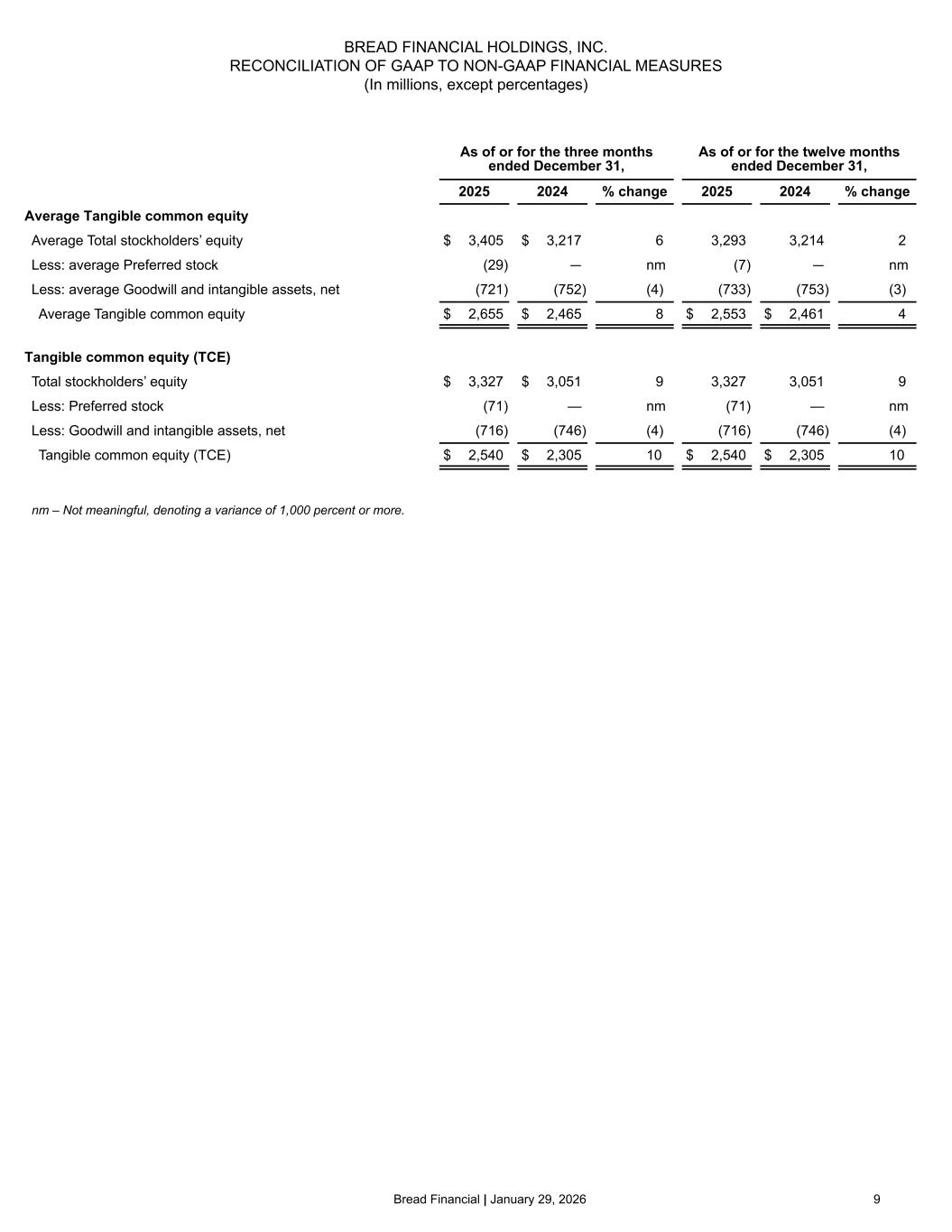 Bread Financial | January 29, 2026 9 BREAD FINANCIAL HOLDINGS, INC. RECONCILIATION OF GAAP TO NON-GAAP FINANCIAL MEASURES (In millions, except percentages) As of or for the three months ended December 31, As of or for the twelve months ended December 31, 2025 2024 % change 2025 2024 % change Average Tangible common equity Average Total stockholders’ equity $ 3,405 $ 3,217 6 3,293 3,214 2 Less: average Preferred stock (29) — nm (7) — nm Less: average Goodwill and intangible assets, net (721) (752) (4) (733) (753) (3) Average Tangible common equity $ 2,655 $ 2,465 8 $ 2,553 $ 2,461 4 Tangible common equity (TCE) Total stockholders’ equity $ 3,327 $ 3,051 9 3,327 3,051 9 Less: Preferred stock (71) — nm (71) — nm Less: Goodwill and intangible assets, net (716) (746) (4) (716) (746) (4) Tangible common equity (TCE) $ 2,540 $ 2,305 10 $ 2,540 $ 2,305 10 nm – Not meaningful, denoting a variance of 1,000 percent or more.