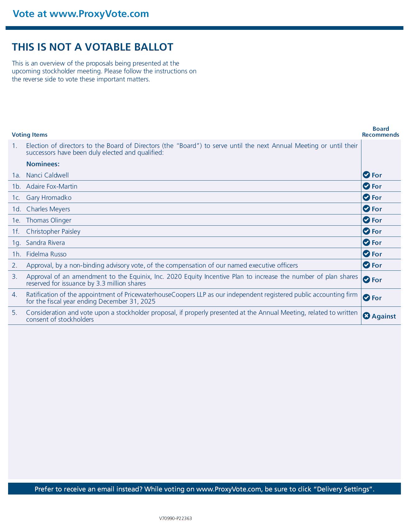Vote at www.ProxyVote.com  THIS IS NOT A VOTABLE BALLOT  This is an overview of the proposals being presented at the upcoming stockholder meeting. Please follow the instructions on the reverse side to vote these important matters.  Prefer to receive an email instead? While voting on www.ProxyVote.com, be sure to click “Delivery Settings”.  1. Election of directors to the Board of Directors (the “Board”) to serve until the next Annual Meeting or until their successors have been duly elected and qualified:  Nominees:  1a. Nanci Caldwell  For  1b.  Adaire Fox-Martin  For  1c.  Gary Hromadko  For  1d.  Charles Meyers  For  1e.  Thomas Olinger  For  1f.  Christopher Paisley  For  1g.  Sandra Rivera  For  1h.  Fidelma Russo  For  2. Approval, by a non-binding advisory vote, of the compensation of our named executive officers  For  3. Approval of an amendment to the Equinix, Inc. 2020 Equity Incentive Plan to increase the number of plan shares reserved for issuance by 3.3 million shares  For  4. Ratification of the appointment of PricewaterhouseCoopers LLP as our independent registered public accounting firm for the fiscal year ending December 31, 2025  For  5. Consideration and vote upon a stockholder proposal, if properly presented at the Annual Meeting, related to written consent of stockholders  Against  Voting Items  Board Recommends  V70990-P22363