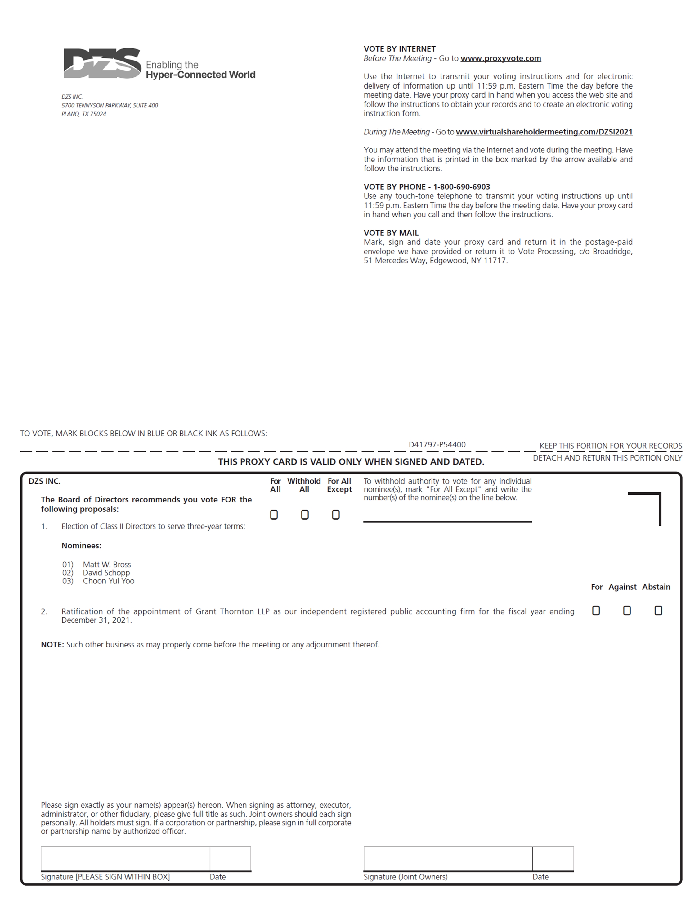 DZS Enabling the Hyper-Connected World DZS INC 5700 TENNYSON PARKWAY, SUITE 400 PLANO, TX 75024 VOTE BY INTERNET Before The Meeting- Go to www.proxyvote.com Use the Internet to transmit your voting instructions and for electronic delivery of information up until 11:59 p.m. Eastern Time the day before the meeting date. Have your proxy card in hand when you access the web site and follow the instructions to obtain your records and to create an electronic voting instruction form. During The Meeting- Go to www.virtualshareholdermeeting.com/DZSI2021. You may attend the meeting via the Internet and vote during the meeting. Have the information that is printed in the box marked by the arrow available and follow the instructions. VOTE BY PHONE-1-800-690-6903 Use any touch- tone telephone to transmit your voting instructions up until 11:59 p.m. Eastern Time the day before the meeting date. Have your proxy card in hand when you call and then follow the instructions. VOTE BY MAIL Mark, sign and date your proxy card and return it in the postage- paid envelope we have provided or return it to Vote Processing, c/o Broadridge, 51 Mercedes Way, Edgewood, NY11717 TO VOTE, MARK blocks below in blue or black ink as follows:d41797-p54400 keep this portion for your records this proxy card is valid only when signed and dated. detach and return this portion only dzs inc. for Withhold For All All All Except To withhold authority to vote for any individual nominee(S), mark * For All Except* and write the number(S) of the nominee(S) on the line below. The Board of Directors recommends you vote FOR the following proposals:1 election of class director to serve three-year terms nominees 01) matt w.bross 02) david schopp 03) choon yul yoo 2 ratification of the appointment of the grant Thornton LLP as as our independent registered public according firm for the fiscal year ending December 31,2021 Note Such other business as many properly come before meeting or any adjournment thereof Please sign exactly as your name(s) appears(s) hereon. When signing as attorney, executor, administrator, or other fiduciary, please give full title as such, Joint owners should each sign personally. All holders must be sign. If a corporation partnership, please sign in full corporate or partnership name by authorized officer. Signature [please sign within box] Date signature (Joint owners) Date