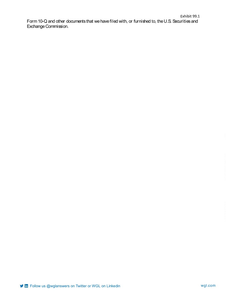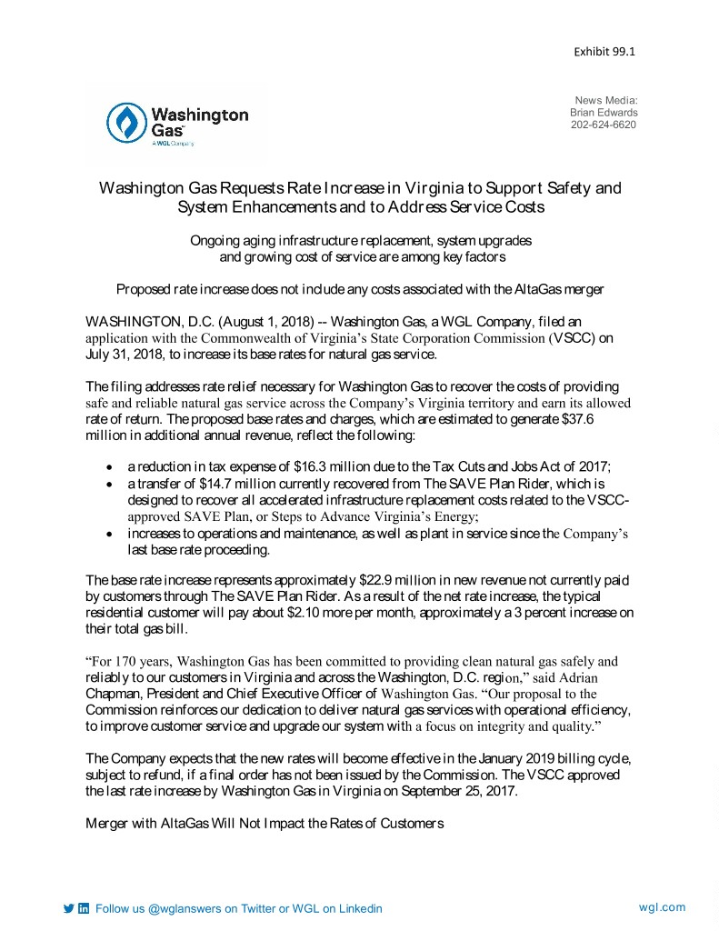 News Media: Brian Edwards 202-624-6620 Washington Gas Requests Rate Increase in Virginia to Support Safety and System Enhancements and to Address Service Costs Ongoing aging infrastructure replacement, system upgrades and growing cost of service are among key factors Proposed rate increase does not include any costs associated with the AltaGas merger WASHINGTON, D.C. (August 1, 2018) -- Washington Gas, a WGL Company, filed an application with the Commonwealth of Virginia’s State Corporation Commission (VSCC) on July 31, 2018, to increase its base rates for natural gas service. The filing addresses rate relief necessary for Washington Gas to recover the costs of providing safe and reliable natural gas service across the Company’s Virginia territory and earn its allowed rate of return. The proposed base rates and charges, which are estimated to generate $37.6 million in additional annual revenue, reflect the following: • a reduction in tax expense of $16.3 million due to the Tax Cuts and Jobs Act of 2017; • a transfer of $14.7 million currently recovered from The SAVE Plan Rider, which is designed to recover all accelerated infrastructure replacement costs related to the VSCC- approved SAVE Plan, or Steps to Advance Virginia’s Energy; • increases to operations and maintenance, as well as plant in service since the Company’s last base rate proceeding. The base rate increase represents approximately $22.9 million in new revenue not currently paid by customers through The SAVE Plan Rider. As a result of the net rate increase, the typical residential customer will pay about $2.10 more per month, approximately a 3 percent increase on their total gas bill. “For 170 years, Washington Gas has been committed to providing clean natural gas safely and reliably to our customers in Virginia and across the Washington, D.C. region,” said Adrian Chapman, President and Chief Executive Officer of Washington Gas. “Our proposal to the Commission reinforces our dedication to deliver natural gas services with operational efficiency, to improve customer service and upgrade our system with a focus on integrity and quality.” The Company expects that the new rates will become effective in the January 2019 billing cycle, subject to refund, if a final order has not been issued by the Commission. The VSCC approved the last rate increase by Washington Gas in Virginia on September 25, 2017. Merger with AltaGas Will Not Impact the Rates of Customers Follow us @wglanswers on Twitter or WGL on Linkedin wgl.com