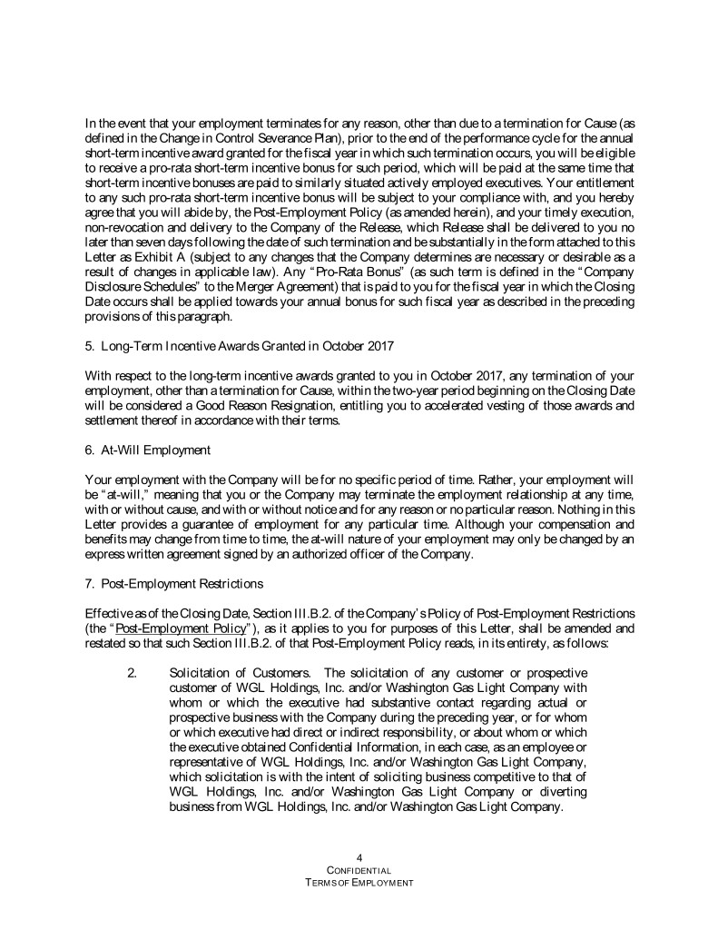 In the event that your employment terminates for any reason, other than due to a termination for Cause (as defined in the Change in Control Severance Plan), prior to the end of the performance cycle for the annual short-term incentive award granted for the fiscal year in which such termination occurs, you will be eligible to receive a pro-rata short-term incentive bonus for such period, which will be paid at the same time that short-term incentive bonuses are paid to similarly situated actively employed executives. Your entitlement to any such pro-rata short-term incentive bonus will be subject to your compliance with, and you hereby agree that you will abide by, the Post-Employment Policy (as amended herein), and your timely execution, non-revocation and delivery to the Company of the Release, which Release shall be delivered to you no later than seven days following the date of such termination and be substantially in the form attached to this Letter as Exhibit A (subject to any changes that the Company determines are necessary or desirable as a result of changes in applicable law). Any “Pro-Rata Bonus” (as such term is defined in the “Company Disclosure Schedules” to the Merger Agreement) that is paid to you for the fiscal year in which the Closing Date occurs shall be applied towards your annual bonus for such fiscal year as described in the preceding provisions of this paragraph. 5. Long-Term Incentive Awards Granted in October 2017 With respect to the long-term incentive awards granted to you in October 2017, any termination of your employment, other than a termination for Cause, within the two-year period beginning on the Closing Date will be considered a Good Reason Resignation, entitling you to accelerated vesting of those awards and settlement thereof in accordance with their terms. 6. At-Will Employment Your employment with the Company will be for no specific period of time. Rather, your employment will be “at-will,” meaning that you or the Company may terminate the employment relationship at any time, with or without cause, and with or without notice and for any reason or no particular reason. Nothing in this Letter provides a guarantee of employment for any particular time. Although your compensation and benefits may change from time to time, the at-will nature of your employment may only be changed by an express written agreement signed by an authorized officer of the Company. 7. Post-Employment Restrictions Effective as of the Closing Date, Section III.B.2. of the Company’s Policy of Post-Employment Restrictions (the “Post-Employment Policy”), as it applies to you for purposes of this Letter, shall be amended and restated so that such Section III.B.2. of that Post-Employment Policy reads, in its entirety, as follows: 2. Solicitation of Customers. The solicitation of any customer or prospective customer of WGL Holdings, Inc. and/or Washington Gas Light Company with whom or which the executive had substantive contact regarding actual or prospective business with the Company during the preceding year, or for whom or which executive had direct or indirect responsibility, or about whom or which the executive obtained Confidential Information, in each case, as an employee or representative of WGL Holdings, Inc. and/or Washington Gas Light Company, which solicitation is with the intent of soliciting business competitive to that of WGL Holdings, Inc. and/or Washington Gas Light Company or diverting business from WGL Holdings, Inc. and/or Washington Gas Light Company. 4 CONFIDENTIAL TERMS OF EMPLOYMENT