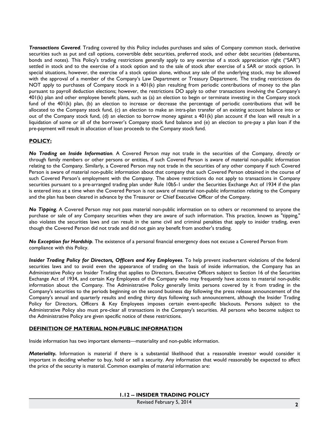 Transactions Covered. Trading covered by this Policy includes purchases and sales of Company common stock, derivative securities such as put and call options, convertible debt securities, preferred stock, and other debt securities (debentures, bonds and notes). This Policy's trading restrictions generally apply to any exercise of a stock appreciation right (“SAR”) settled in stock and to the exercise of a stock option and to the sale of stock after exercise of a SAR or stock option. In special situations, however, the exercise of a stock option alone, without any sale of the underlying stock, may be allowed with the approval of a member of the Company’s Law Department or Treasury Department. The trading restrictions do NOT apply to purchases of Company stock in a 401(k) plan resulting from periodic contributions of money to the plan pursuant to payroll deduction elections; however, the restrictions DO apply to other transactions involving the Company’s 401(k) plan and other employee benefit plans, such as (a) an election to begin or terminate investing in the Company stock fund of the 401(k) plan, (b) an election to increase or decrease the percentage of periodic contributions that will be allocated to the Company stock fund, (c) an election to make an intra-plan transfer of an existing account balance into or out of the Company stock fund, (d) an election to borrow money against a 401(k) plan account if the loan will result in a liquidation of some or all of the borrower’s Company stock fund balance and (e) an election to pre-pay a plan loan if the pre-payment will result in allocation of loan proceeds to the Company stock fund. POLICY: No Trading on Inside Information. A Covered Person may not trade in the securities of the Company, directly or through family members or other persons or entities, if such Covered Person is aware of material non-public information relating to the Company. Similarly, a Covered Person may not trade in the securities of any other company if such Covered Person is aware of material non-public information about that company that such Covered Person obtained in the course of such Covered Person’s employment with the Company. The above restrictions do not apply to transactions in Company securities pursuant to a pre-arranged trading plan under Rule 10b5-1 under the Securities Exchange Act of 1934 if the plan is entered into at a time when the Covered Person is not aware of material non-public information relating to the Company and the plan has been cleared in advance by the Treasurer or Chief Executive Officer of the Company. No Tipping. A Covered Person may not pass material non-public information on to others or recommend to anyone the purchase or sale of any Company securities when they are aware of such information. This practice, known as "tipping," also violates the securities laws and can result in the same civil and criminal penalties that apply to insider trading, even though the Covered Person did not trade and did not gain any benefit from another's trading. No Exception for Hardship. The existence of a personal financial emergency does not excuse a Covered Person from compliance with this Policy. Insider Trading Policy for Directors, Officers and Key Employees. To help prevent inadvertent violations of the federal securities laws and to avoid even the appearance of trading on the basis of inside information, the Company has an Administrative Policy on Insider Trading that applies to Directors, Executive Officers subject to Section 16 of the Securities Exchange Act of 1934, and certain Key Employees of the Company who may frequently have access to material non-public information about the Company. The Administrative Policy generally limits persons covered by it from trading in the Company's securities to the periods beginning on the second business day following the press release announcement of the Company’s annual and quarterly results and ending thirty days following such announcement, although the Insider Trading Policy for Directors, Officers & Key Employees imposes certain event-specific blackouts. Persons subject to the Administrative Policy also must pre-clear all transactions in the Company's securities. All persons who become subject to the Administrative Policy are given specific notice of these restrictions. DEFINITION OF MATERIAL NON-PUBLIC INFORMATION Inside information has two important elements—materiality and non-public information. Materiality. Information is material if there is a substantial likelihood that a reasonable investor would consider it important in deciding whether to buy, hold or sell a security. Any information that would reasonably be expected to affect the price of the security is material. Common examples of material information are: 1.12 -- INSIDER TRADING POLICY Revised February 5, 2014 2