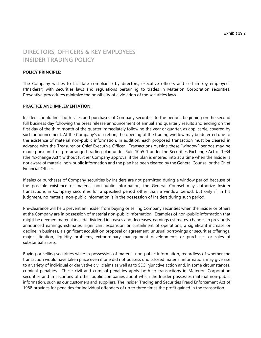 Exhibit 19.2 DIRECTORS, OFFICERS & KEY EMPLOYEES INSIDER TRADING POLICY POLICY PRINCIPLE: The Company wishes to facilitate compliance by directors, executive officers and certain key employees ("Insiders") with securities laws and regulations pertaining to trades in Materion Corporation securities. Preventive procedures minimize the possibility of a violation of the securities laws. PRACTICE AND IMPLEMENTATION: Insiders should limit both sales and purchases of Company securities to the periods beginning on the second full business day following the press release announcement of annual and quarterly results and ending on the first day of the third month of the quarter immediately following the year or quarter, as applicable, covered by such announcement. At the Company’s discretion, the opening of the trading window may be deferred due to the existence of material non-public information. In addition, each proposed transaction must be cleared in advance with the Treasurer or Chief Executive Officer. Transactions outside these “window” periods may be made pursuant to a pre-arranged trading plan under Rule 10b5-1 under the Securities Exchange Act of 1934 (the “Exchange Act”) without further Company approval if the plan is entered into at a time when the Insider is not aware of material non-public information and the plan has been cleared by the General Counsel or the Chief Financial Officer. If sales or purchases of Company securities by Insiders are not permitted during a window period because of the possible existence of material non-public information, the General Counsel may authorize Insider transactions in Company securities for a specified period other than a window period, but only if, in his judgment, no material non-public information is in the possession of Insiders during such period. Pre-clearance will help prevent an Insider from buying or selling Company securities when the insider or others at the Company are in possession of material non-public information. Examples of non-public information that might be deemed material include dividend increases and decreases, earnings estimates, changes in previously announced earnings estimates, significant expansion or curtailment of operations, a significant increase or decline in business, a significant acquisition proposal or agreement, unusual borrowings or securities offerings, major litigation, liquidity problems, extraordinary management developments or purchases or sales of substantial assets. Buying or selling securities while in possession of material non-public information, regardless of whether the transaction would have taken place even if one did not possess undisclosed material information, may give rise to a variety of individual or derivative civil claims as well as to SEC injunctive action and, in some circumstances, criminal penalties. These civil and criminal penalties apply both to transactions in Materion Corporation securities and in securities of other public companies about which the Insider possesses material non-public information, such as our customers and suppliers. The Insider Trading and Securities Fraud Enforcement Act of 1988 provides for penalties for individual offenders of up to three times the profit gained in the transaction.