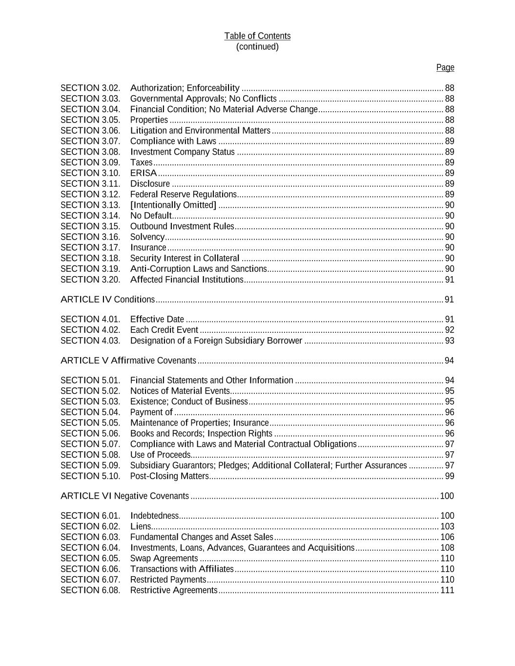 Table of Contents (continued) Page SECTION 3.02. Authorization; Enforceability ....................................................................................... 88 SECTION 3.03. Governmental Approvals; No Conflicts ....................................................................... 88 SECTION 3.04. Financial Condition; No Material Adverse Change ...................................................... 88 SECTION 3.05. Properties ...................................................................................................................... 88 SECTION 3.06. Litigation and Environmental Matters .......................................................................... 88 SECTION 3.07. Compliance with Laws ................................................................................................. 89 SECTION 3.08. Investment Company Status ......................................................................................... 89 SECTION 3.09. Taxes ............................................................................................................................. 89 SECTION 3.10. ERISA ........................................................................................................................... 89 SECTION 3.11. Disclosure ..................................................................................................................... 89 SECTION 3.12. Federal Reserve Regulations ......................................................................................... 89 SECTION 3.13. [Intentionally Omitted] ................................................................................................. 90 SECTION 3.14. No Default ..................................................................................................................... 90 SECTION 3.15. Outbound Investment Rules .......................................................................................... 90 SECTION 3.16. Solvency ........................................................................................................................ 90 SECTION 3.17. Insurance ....................................................................................................................... 90 SECTION 3.18. Security Interest in Collateral ....................................................................................... 90 SECTION 3.19. Anti-Corruption Laws and Sanctions ............................................................................ 90 SECTION 3.20. Affected Financial Institutions ...................................................................................... 91 ARTICLE IV Conditions ............................................................................................................................ 91 SECTION 4.01. Effective Date ............................................................................................................... 91 SECTION 4.02. Each Credit Event ......................................................................................................... 92 SECTION 4.03. Designation of a Foreign Subsidiary Borrower ............................................................ 93 ARTICLE V Affirmative Covenants .......................................................................................................... 94 SECTION 5.01. Financial Statements and Other Information ................................................................ 94 SECTION 5.02. Notices of Material Events ............................................................................................ 95 SECTION 5.03. Existence; Conduct of Business .................................................................................... 95 SECTION 5.04. Payment of .................................................................................................................... 96 SECTION 5.05. Maintenance of Properties; Insurance ........................................................................... 96 SECTION 5.06. Books and Records; Inspection Rights ......................................................................... 96 SECTION 5.07. Compliance with Laws and Material Contractual Obligations ..................................... 97 SECTION 5.08. Use of Proceeds............................................................................................................. 97 SECTION 5.09. Subsidiary Guarantors; Pledges; Additional Collateral; Further Assurances ............... 97 SECTION 5.10. Post-Closing Matters ..................................................................................................... 99 ARTICLE VI Negative Covenants ........................................................................................................... 100 SECTION 6.01. Indebtedness ................................................................................................................ 100 SECTION 6.02. Liens ............................................................................................................................ 103 SECTION 6.03. Fundamental Changes and Asset Sales ....................................................................... 106 SECTION 6.04. Investments, Loans, Advances, Guarantees and Acquisitions .................................... 108 SECTION 6.05. Swap Agreements ....................................................................................................... 110 SECTION 6.06. Transactions with Affiliates ........................................................................................ 110 SECTION 6.07. Restricted Payments .................................................................................................... 110 SECTION 6.08. Restrictive Agreements ............................................................................................... 111