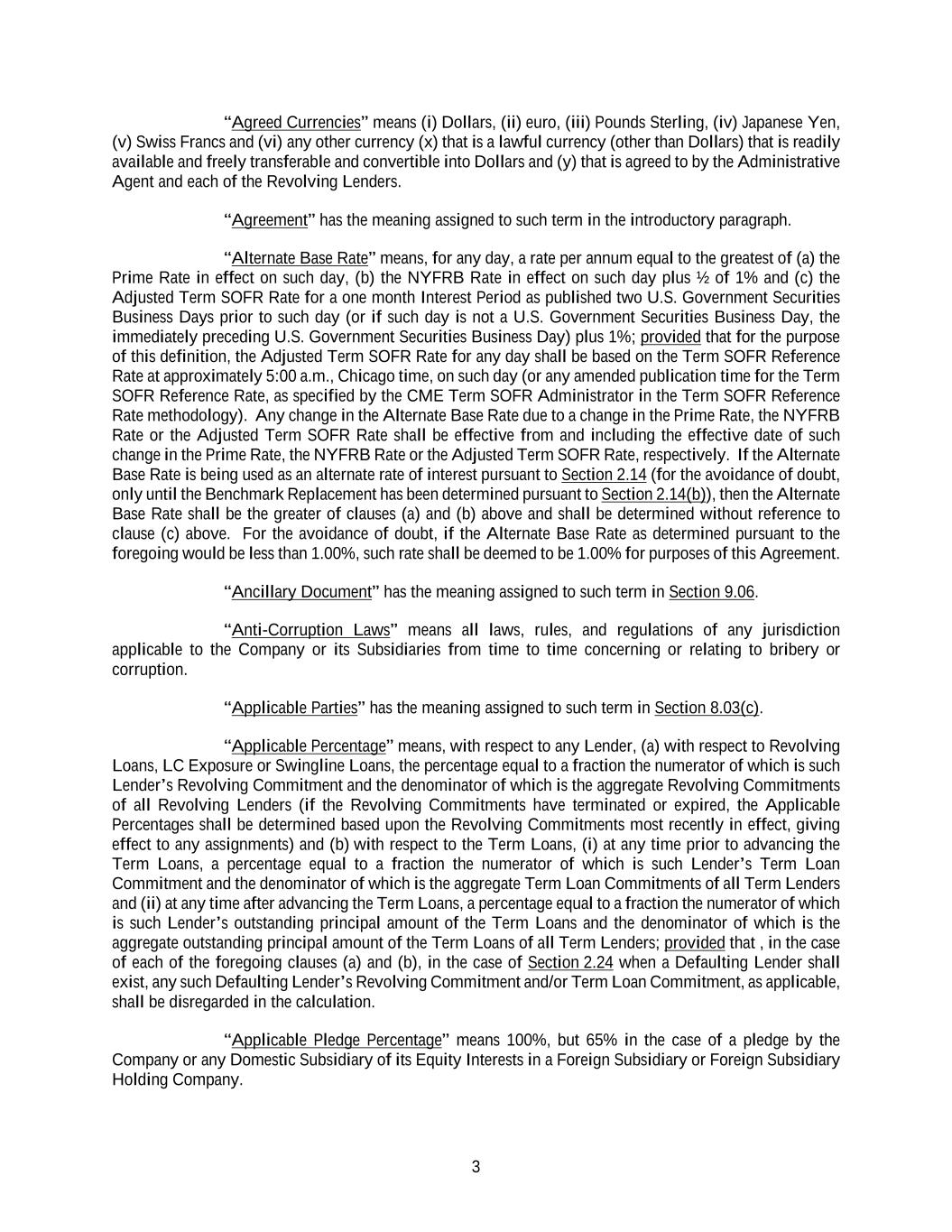 3 “Agreed Currencies” means (i) Dollars, (ii) euro, (iii) Pounds Sterling, (iv) Japanese Yen, (v) Swiss Francs and (vi) any other currency (x) that is a lawful currency (other than Dollars) that is readily available and freely transferable and convertible into Dollars and (y) that is agreed to by the Administrative Agent and each of the Revolving Lenders. “Agreement” has the meaning assigned to such term in the introductory paragraph. “Alternate Base Rate” means, for any day, a rate per annum equal to the greatest of (a) the Prime Rate in effect on such day, (b) the NYFRB Rate in effect on such day plus ½ of 1% and (c) the Adjusted Term SOFR Rate for a one month Interest Period as published two U.S. Government Securities Business Days prior to such day (or if such day is not a U.S. Government Securities Business Day, the immediately preceding U.S. Government Securities Business Day) plus 1%; provided that for the purpose of this definition, the Adjusted Term SOFR Rate for any day shall be based on the Term SOFR Reference Rate at approximately 5:00 a.m., Chicago time, on such day (or any amended publication time for the Term SOFR Reference Rate, as specified by the CME Term SOFR Administrator in the Term SOFR Reference Rate methodology). Any change in the Alternate Base Rate due to a change in the Prime Rate, the NYFRB Rate or the Adjusted Term SOFR Rate shall be effective from and including the effective date of such change in the Prime Rate, the NYFRB Rate or the Adjusted Term SOFR Rate, respectively. If the Alternate Base Rate is being used as an alternate rate of interest pursuant to Section 2.14 (for the avoidance of doubt, only until the Benchmark Replacement has been determined pursuant to Section 2.14(b)), then the Alternate Base Rate shall be the greater of clauses (a) and (b) above and shall be determined without reference to clause (c) above. For the avoidance of doubt, if the Alternate Base Rate as determined pursuant to the foregoing would be less than 1.00%, such rate shall be deemed to be 1.00% for purposes of this Agreement. “Ancillary Document” has the meaning assigned to such term in Section 9.06. “Anti-Corruption Laws” means all laws, rules, and regulations of any jurisdiction applicable to the Company or its Subsidiaries from time to time concerning or relating to bribery or corruption. “Applicable Parties” has the meaning assigned to such term in Section 8.03(c). “Applicable Percentage” means, with respect to any Lender, (a) with respect to Revolving Loans, LC Exposure or Swingline Loans, the percentage equal to a fraction the numerator of which is such Lender’s Revolving Commitment and the denominator of which is the aggregate Revolving Commitments of all Revolving Lenders (if the Revolving Commitments have terminated or expired, the Applicable Percentages shall be determined based upon the Revolving Commitments most recently in effect, giving effect to any assignments) and (b) with respect to the Term Loans, (i) at any time prior to advancing the Term Loans, a percentage equal to a fraction the numerator of which is such Lender’s Term Loan Commitment and the denominator of which is the aggregate Term Loan Commitments of all Term Lenders and (ii) at any time after advancing the Term Loans, a percentage equal to a fraction the numerator of which is such Lender’s outstanding principal amount of the Term Loans and the denominator of which is the aggregate outstanding principal amount of the Term Loans of all Term Lenders; provided that , in the case of each of the foregoing clauses (a) and (b), in the case of Section 2.24 when a Defaulting Lender shall exist, any such Defaulting Lender’s Revolving Commitment and/or Term Loan Commitment, as applicable, shall be disregarded in the calculation. “Applicable Pledge Percentage” means 100%, but 65% in the case of a pledge by the Company or any Domestic Subsidiary of its Equity Interests in a Foreign Subsidiary or Foreign Subsidiary Holding Company.