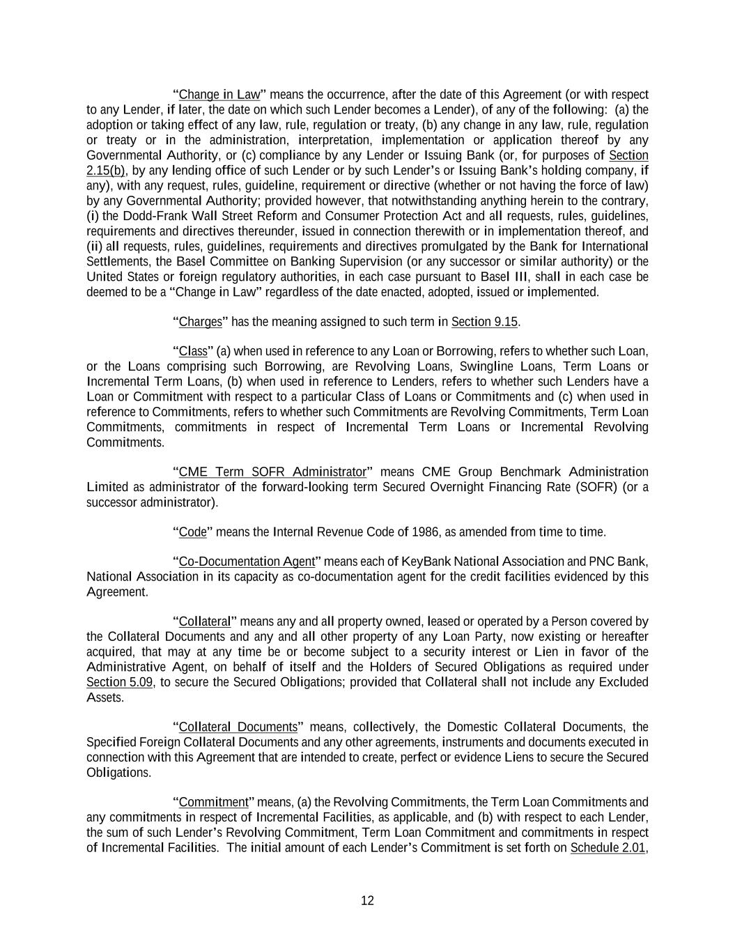 12 “Change in Law” means the occurrence, after the date of this Agreement (or with respect to any Lender, if later, the date on which such Lender becomes a Lender), of any of the following: (a) the adoption or taking effect of any law, rule, regulation or treaty, (b) any change in any law, rule, regulation or treaty or in the administration, interpretation, implementation or application thereof by any Governmental Authority, or (c) compliance by any Lender or Issuing Bank (or, for purposes of Section 2.15(b), by any lending office of such Lender or by such Lender’s or Issuing Bank’s holding company, if any), with any request, rules, guideline, requirement or directive (whether or not having the force of law) by any Governmental Authority; provided however, that notwithstanding anything herein to the contrary, (i) the Dodd-Frank Wall Street Reform and Consumer Protection Act and all requests, rules, guidelines, requirements and directives thereunder, issued in connection therewith or in implementation thereof, and (ii) all requests, rules, guidelines, requirements and directives promulgated by the Bank for International Settlements, the Basel Committee on Banking Supervision (or any successor or similar authority) or the United States or foreign regulatory authorities, in each case pursuant to Basel III, shall in each case be deemed to be a “Change in Law” regardless of the date enacted, adopted, issued or implemented. “Charges” has the meaning assigned to such term in Section 9.15. “Class” (a) when used in reference to any Loan or Borrowing, refers to whether such Loan, or the Loans comprising such Borrowing, are Revolving Loans, Swingline Loans, Term Loans or Incremental Term Loans, (b) when used in reference to Lenders, refers to whether such Lenders have a Loan or Commitment with respect to a particular Class of Loans or Commitments and (c) when used in reference to Commitments, refers to whether such Commitments are Revolving Commitments, Term Loan Commitments, commitments in respect of Incremental Term Loans or Incremental Revolving Commitments. “CME Term SOFR Administrator” means CME Group Benchmark Administration Limited as administrator of the forward-looking term Secured Overnight Financing Rate (SOFR) (or a successor administrator). “Code” means the Internal Revenue Code of 1986, as amended from time to time. “Co-Documentation Agent” means each of KeyBank National Association and PNC Bank, National Association in its capacity as co-documentation agent for the credit facilities evidenced by this Agreement. “Collateral” means any and all property owned, leased or operated by a Person covered by the Collateral Documents and any and all other property of any Loan Party, now existing or hereafter acquired, that may at any time be or become subject to a security interest or Lien in favor of the Administrative Agent, on behalf of itself and the Holders of Secured Obligations as required under Section 5.09, to secure the Secured Obligations; provided that Collateral shall not include any Excluded Assets. “Collateral Documents” means, collectively, the Domestic Collateral Documents, the Specified Foreign Collateral Documents and any other agreements, instruments and documents executed in connection with this Agreement that are intended to create, perfect or evidence Liens to secure the Secured Obligations. “Commitment” means, (a) the Revolving Commitments, the Term Loan Commitments and any commitments in respect of Incremental Facilities, as applicable, and (b) with respect to each Lender, the sum of such Lender’s Revolving Commitment, Term Loan Commitment and commitments in respect of Incremental Facilities. The initial amount of each Lender’s Commitment is set forth on Schedule 2.01,