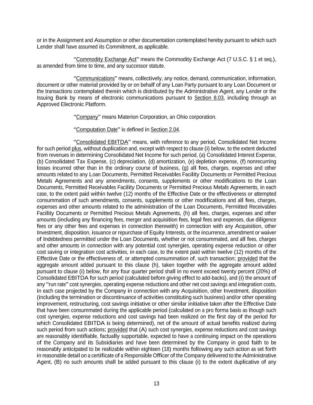 13 or in the Assignment and Assumption or other documentation contemplated hereby pursuant to which such Lender shall have assumed its Commitment, as applicable. “Commodity Exchange Act” means the Commodity Exchange Act (7 U.S.C. § 1 et seq.), as amended from time to time, and any successor statute. “Communications” means, collectively, any notice, demand, communication, information, document or other material provided by or on behalf of any Loan Party pursuant to any Loan Document or the transactions contemplated therein which is distributed by the Administrative Agent, any Lender or the Issuing Bank by means of electronic communications pursuant to Section 8.03, including through an Approved Electronic Platform. “Company” means Materion Corporation, an Ohio corporation. “Computation Date” is defined in Section 2.04. “Consolidated EBITDA” means, with reference to any period, Consolidated Net Income for such period plus, without duplication and, except with respect to clause (i) below, to the extent deducted from revenues in determining Consolidated Net Income for such period, (a) Consolidated Interest Expense, (b) Consolidated Tax Expense, (c) depreciation, (d) amortization, (e) depletion expense, (f) nonrecurring losses incurred other than in the ordinary course of business, (g) all fees, charges, expenses and other amounts related to any Loan Documents, Permitted Receivables Facility Documents or Permitted Precious Metals Agreements and any amendments, consents, supplements or other modifications to the Loan Documents, Permitted Receivables Facility Documents or Permitted Precious Metals Agreements, in each case, to the extent paid within twelve (12) months of the Effective Date or the effectiveness or attempted consummation of such amendments, consents, supplements or other modifications and all fees, charges, expenses and other amounts related to the administration of the Loan Documents, Permitted Receivables Facility Documents or Permitted Precious Metals Agreements, (h) all fees, charges, expenses and other amounts (including any financing fees, merger and acquisition fees, legal fees and expenses, due diligence fees or any other fees and expenses in connection therewith) in connection with any Acquisition, other Investment, disposition, issuance or repurchase of Equity Interests, or the incurrence, amendment or waiver of Indebtedness permitted under the Loan Documents, whether or not consummated, and all fees, charges and other amounts in connection with any potential cost synergies, operating expense reduction or other cost saving or integration cost activities, in each case, to the extent paid within twelve (12) months of the Effective Date or the effectiveness of, or attempted consummation of, such transaction; provided that the aggregate amount added pursuant to this clause (h), taken together with the aggregate amount added pursuant to clause (i) below, for any four quarter period shall in no event exceed twenty percent (20%) of Consolidated EBITDA for such period (calculated before giving effect to add-backs), and (i) the amount of any “run rate” cost synergies, operating expense reductions and other net cost savings and integration costs, in each case projected by the Company in connection with any Acquisition, other Investment, disposition (including the termination or discontinuance of activities constituting such business) and/or other operating improvement, restructuring, cost savings initiative or other similar initiative taken after the Effective Date that have been consummated during the applicable period (calculated on a pro forma basis as though such cost synergies, expense reductions and cost savings had been realized on the first day of the period for which Consolidated EBITDA is being determined), net of the amount of actual benefits realized during such period from such actions; provided that (A) such cost synergies, expense reductions and cost savings are reasonably identifiable, factually supportable, expected to have a continuing impact on the operations of the Company and its Subsidiaries and have been determined by the Company in good faith to be reasonably anticipated to be realizable within eighteen (18) months following any such action as set forth in reasonable detail on a certificate of a Responsible Officer of the Company delivered to the Administrative Agent, (B) no such amounts shall be added pursuant to this clause (i) to the extent duplicative of any