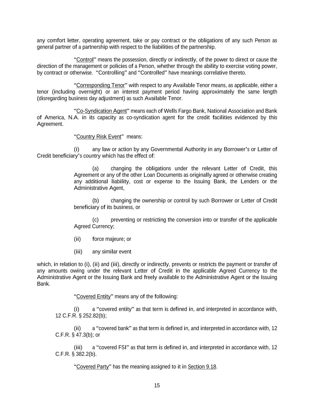 15 any comfort letter, operating agreement, take or pay contract or the obligations of any such Person as general partner of a partnership with respect to the liabilities of the partnership. “Control” means the possession, directly or indirectly, of the power to direct or cause the direction of the management or policies of a Person, whether through the ability to exercise voting power, by contract or otherwise. “Controlling” and “Controlled” have meanings correlative thereto. “Corresponding Tenor” with respect to any Available Tenor means, as applicable, either a tenor (including overnight) or an interest payment period having approximately the same length (disregarding business day adjustment) as such Available Tenor. “Co-Syndication Agent” means each of Wells Fargo Bank, National Association and Bank of America, N.A. in its capacity as co-syndication agent for the credit facilities evidenced by this Agreement. “Country Risk Event” means: (i) any law or action by any Governmental Authority in any Borrower’s or Letter of Credit beneficiary’s country which has the effect of: (a) changing the obligations under the relevant Letter of Credit, this Agreement or any of the other Loan Documents as originally agreed or otherwise creating any additional liability, cost or expense to the Issuing Bank, the Lenders or the Administrative Agent, (b) changing the ownership or control by such Borrower or Letter of Credit beneficiary of its business, or (c) preventing or restricting the conversion into or transfer of the applicable Agreed Currency; (ii) force majeure; or (iii) any similar event which, in relation to (i), (ii) and (iii), directly or indirectly, prevents or restricts the payment or transfer of any amounts owing under the relevant Letter of Credit in the applicable Agreed Currency to the Administrative Agent or the Issuing Bank and freely available to the Administrative Agent or the Issuing Bank. “Covered Entity” means any of the following: (i) a “covered entity” as that term is defined in, and interpreted in accordance with, 12 C.F.R. § 252.82(b); (ii) a “covered bank” as that term is defined in, and interpreted in accordance with, 12 C.F.R. § 47.3(b); or (iii) a “covered FSI” as that term is defined in, and interpreted in accordance with, 12 C.F.R. § 382.2(b). “Covered Party” has the meaning assigned to it in Section 9.18.