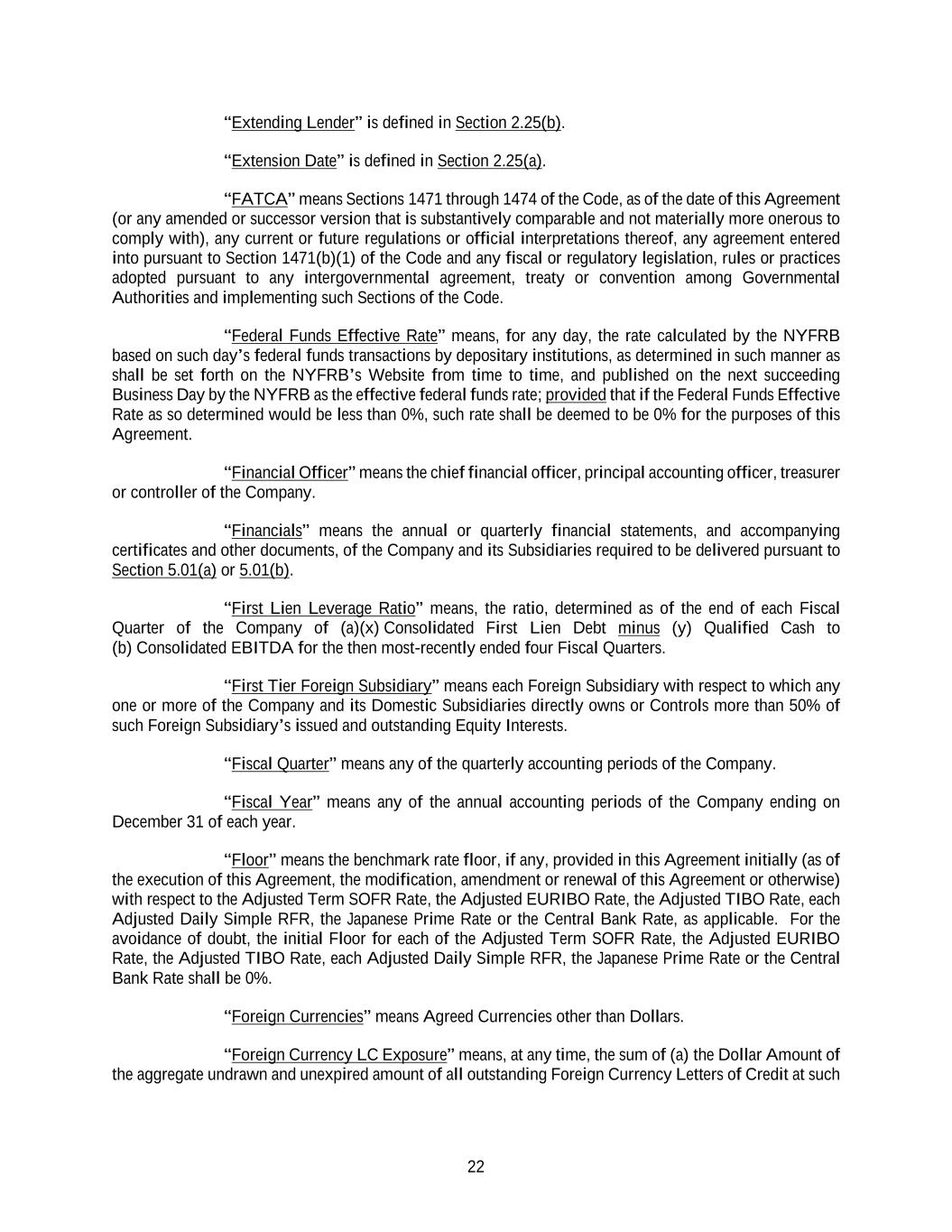 22 “Extending Lender” is defined in Section 2.25(b). “Extension Date” is defined in Section 2.25(a). “FATCA” means Sections 1471 through 1474 of the Code, as of the date of this Agreement (or any amended or successor version that is substantively comparable and not materially more onerous to comply with), any current or future regulations or official interpretations thereof, any agreement entered into pursuant to Section 1471(b)(1) of the Code and any fiscal or regulatory legislation, rules or practices adopted pursuant to any intergovernmental agreement, treaty or convention among Governmental Authorities and implementing such Sections of the Code. “Federal Funds Effective Rate” means, for any day, the rate calculated by the NYFRB based on such day’s federal funds transactions by depositary institutions, as determined in such manner as shall be set forth on the NYFRB’s Website from time to time, and published on the next succeeding Business Day by the NYFRB as the effective federal funds rate; provided that if the Federal Funds Effective Rate as so determined would be less than 0%, such rate shall be deemed to be 0% for the purposes of this Agreement. “Financial Officer” means the chief financial officer, principal accounting officer, treasurer or controller of the Company. “Financials” means the annual or quarterly financial statements, and accompanying certificates and other documents, of the Company and its Subsidiaries required to be delivered pursuant to Section 5.01(a) or 5.01(b). “First Lien Leverage Ratio” means, the ratio, determined as of the end of each Fiscal Quarter of the Company of (a)(x) Consolidated First Lien Debt minus (y) Qualified Cash to (b) Consolidated EBITDA for the then most-recently ended four Fiscal Quarters. “First Tier Foreign Subsidiary” means each Foreign Subsidiary with respect to which any one or more of the Company and its Domestic Subsidiaries directly owns or Controls more than 50% of such Foreign Subsidiary’s issued and outstanding Equity Interests. “Fiscal Quarter” means any of the quarterly accounting periods of the Company. “Fiscal Year” means any of the annual accounting periods of the Company ending on December 31 of each year. “Floor” means the benchmark rate floor, if any, provided in this Agreement initially (as of the execution of this Agreement, the modification, amendment or renewal of this Agreement or otherwise) with respect to the Adjusted Term SOFR Rate, the Adjusted EURIBO Rate, the Adjusted TIBO Rate, each Adjusted Daily Simple RFR, the Japanese Prime Rate or the Central Bank Rate, as applicable. For the avoidance of doubt, the initial Floor for each of the Adjusted Term SOFR Rate, the Adjusted EURIBO Rate, the Adjusted TIBO Rate, each Adjusted Daily Simple RFR, the Japanese Prime Rate or the Central Bank Rate shall be 0%. “Foreign Currencies” means Agreed Currencies other than Dollars. “Foreign Currency LC Exposure” means, at any time, the sum of (a) the Dollar Amount of the aggregate undrawn and unexpired amount of all outstanding Foreign Currency Letters of Credit at such