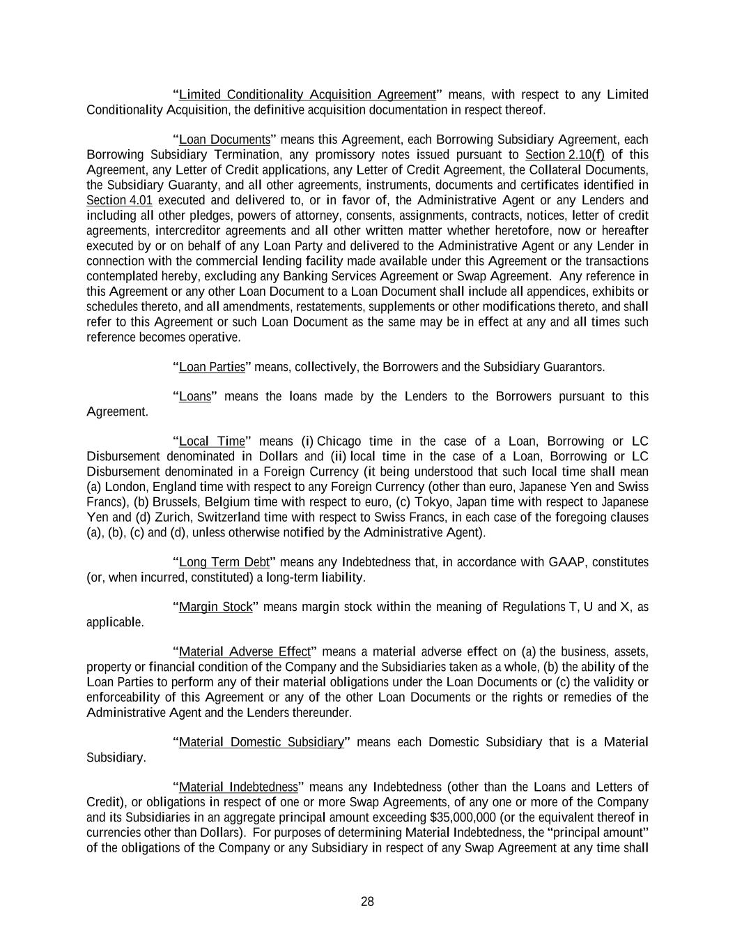 28 “Limited Conditionality Acquisition Agreement” means, with respect to any Limited Conditionality Acquisition, the definitive acquisition documentation in respect thereof. “Loan Documents” means this Agreement, each Borrowing Subsidiary Agreement, each Borrowing Subsidiary Termination, any promissory notes issued pursuant to Section 2.10(f) of this Agreement, any Letter of Credit applications, any Letter of Credit Agreement, the Collateral Documents, the Subsidiary Guaranty, and all other agreements, instruments, documents and certificates identified in Section 4.01 executed and delivered to, or in favor of, the Administrative Agent or any Lenders and including all other pledges, powers of attorney, consents, assignments, contracts, notices, letter of credit agreements, intercreditor agreements and all other written matter whether heretofore, now or hereafter executed by or on behalf of any Loan Party and delivered to the Administrative Agent or any Lender in connection with the commercial lending facility made available under this Agreement or the transactions contemplated hereby, excluding any Banking Services Agreement or Swap Agreement. Any reference in this Agreement or any other Loan Document to a Loan Document shall include all appendices, exhibits or schedules thereto, and all amendments, restatements, supplements or other modifications thereto, and shall refer to this Agreement or such Loan Document as the same may be in effect at any and all times such reference becomes operative. “Loan Parties” means, collectively, the Borrowers and the Subsidiary Guarantors. “Loans” means the loans made by the Lenders to the Borrowers pursuant to this Agreement. “Local Time” means (i) Chicago time in the case of a Loan, Borrowing or LC Disbursement denominated in Dollars and (ii) local time in the case of a Loan, Borrowing or LC Disbursement denominated in a Foreign Currency (it being understood that such local time shall mean (a) London, England time with respect to any Foreign Currency (other than euro, Japanese Yen and Swiss Francs), (b) Brussels, Belgium time with respect to euro, (c) Tokyo, Japan time with respect to Japanese Yen and (d) Zurich, Switzerland time with respect to Swiss Francs, in each case of the foregoing clauses (a), (b), (c) and (d), unless otherwise notified by the Administrative Agent). “Long Term Debt” means any Indebtedness that, in accordance with GAAP, constitutes (or, when incurred, constituted) a long-term liability. “Margin Stock” means margin stock within the meaning of Regulations T, U and X, as applicable. “Material Adverse Effect” means a material adverse effect on (a) the business, assets, property or financial condition of the Company and the Subsidiaries taken as a whole, (b) the ability of the Loan Parties to perform any of their material obligations under the Loan Documents or (c) the validity or enforceability of this Agreement or any of the other Loan Documents or the rights or remedies of the Administrative Agent and the Lenders thereunder. “Material Domestic Subsidiary” means each Domestic Subsidiary that is a Material Subsidiary. “Material Indebtedness” means any Indebtedness (other than the Loans and Letters of Credit), or obligations in respect of one or more Swap Agreements, of any one or more of the Company and its Subsidiaries in an aggregate principal amount exceeding $35,000,000 (or the equivalent thereof in currencies other than Dollars). For purposes of determining Material Indebtedness, the “principal amount” of the obligations of the Company or any Subsidiary in respect of any Swap Agreement at any time shall