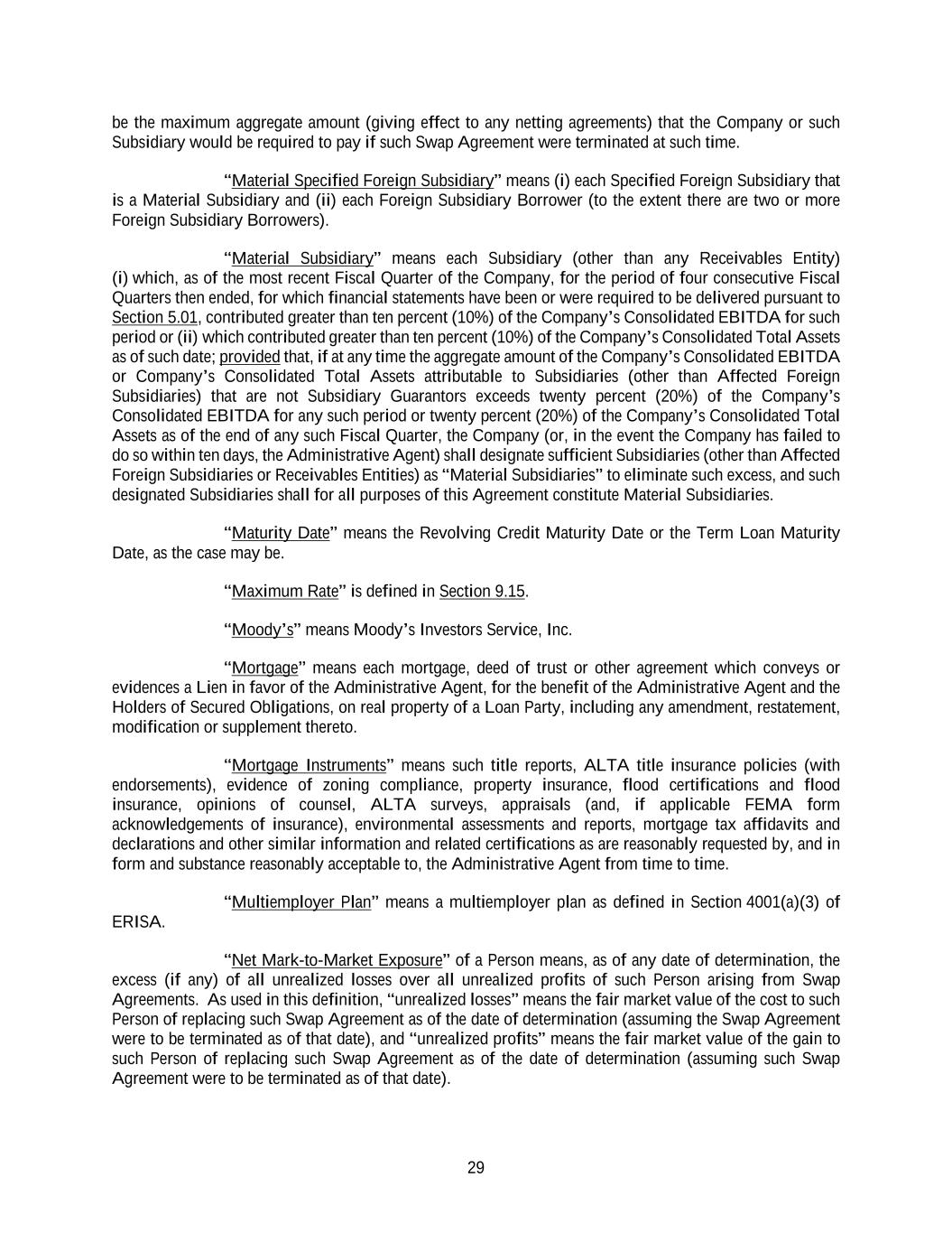 29 be the maximum aggregate amount (giving effect to any netting agreements) that the Company or such Subsidiary would be required to pay if such Swap Agreement were terminated at such time. “Material Specified Foreign Subsidiary” means (i) each Specified Foreign Subsidiary that is a Material Subsidiary and (ii) each Foreign Subsidiary Borrower (to the extent there are two or more Foreign Subsidiary Borrowers). “Material Subsidiary” means each Subsidiary (other than any Receivables Entity) (i) which, as of the most recent Fiscal Quarter of the Company, for the period of four consecutive Fiscal Quarters then ended, for which financial statements have been or were required to be delivered pursuant to Section 5.01, contributed greater than ten percent (10%) of the Company’s Consolidated EBITDA for such period or (ii) which contributed greater than ten percent (10%) of the Company’s Consolidated Total Assets as of such date; provided that, if at any time the aggregate amount of the Company’s Consolidated EBITDA or Company’s Consolidated Total Assets attributable to Subsidiaries (other than Affected Foreign Subsidiaries) that are not Subsidiary Guarantors exceeds twenty percent (20%) of the Company’s Consolidated EBITDA for any such period or twenty percent (20%) of the Company’s Consolidated Total Assets as of the end of any such Fiscal Quarter, the Company (or, in the event the Company has failed to do so within ten days, the Administrative Agent) shall designate sufficient Subsidiaries (other than Affected Foreign Subsidiaries or Receivables Entities) as “Material Subsidiaries” to eliminate such excess, and such designated Subsidiaries shall for all purposes of this Agreement constitute Material Subsidiaries. “Maturity Date” means the Revolving Credit Maturity Date or the Term Loan Maturity Date, as the case may be. “Maximum Rate” is defined in Section 9.15. “Moody’s” means Moody’s Investors Service, Inc. “Mortgage” means each mortgage, deed of trust or other agreement which conveys or evidences a Lien in favor of the Administrative Agent, for the benefit of the Administrative Agent and the Holders of Secured Obligations, on real property of a Loan Party, including any amendment, restatement, modification or supplement thereto. “Mortgage Instruments” means such title reports, ALTA title insurance policies (with endorsements), evidence of zoning compliance, property insurance, flood certifications and flood insurance, opinions of counsel, ALTA surveys, appraisals (and, if applicable FEMA form acknowledgements of insurance), environmental assessments and reports, mortgage tax affidavits and declarations and other similar information and related certifications as are reasonably requested by, and in form and substance reasonably acceptable to, the Administrative Agent from time to time. “Multiemployer Plan” means a multiemployer plan as defined in Section 4001(a)(3) of ERISA. “Net Mark-to-Market Exposure” of a Person means, as of any date of determination, the excess (if any) of all unrealized losses over all unrealized profits of such Person arising from Swap Agreements. As used in this definition, “unrealized losses” means the fair market value of the cost to such Person of replacing such Swap Agreement as of the date of determination (assuming the Swap Agreement were to be terminated as of that date), and “unrealized profits” means the fair market value of the gain to such Person of replacing such Swap Agreement as of the date of determination (assuming such Swap Agreement were to be terminated as of that date).