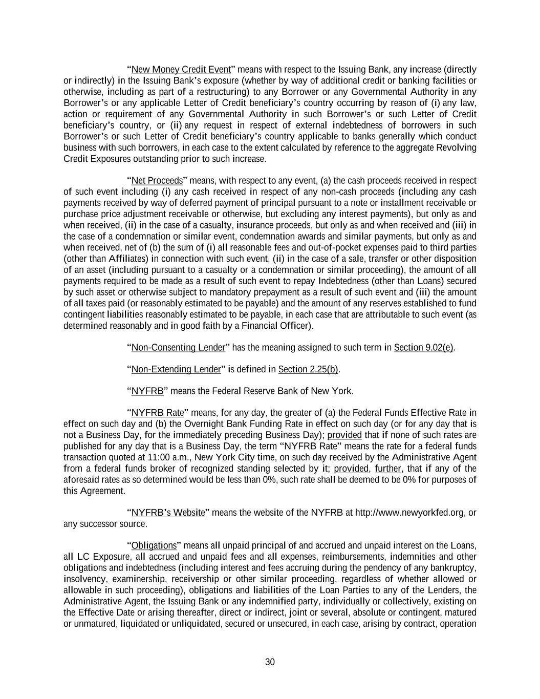 30 “New Money Credit Event” means with respect to the Issuing Bank, any increase (directly or indirectly) in the Issuing Bank’s exposure (whether by way of additional credit or banking facilities or otherwise, including as part of a restructuring) to any Borrower or any Governmental Authority in any Borrower’s or any applicable Letter of Credit beneficiary’s country occurring by reason of (i) any law, action or requirement of any Governmental Authority in such Borrower’s or such Letter of Credit beneficiary’s country, or (ii) any request in respect of external indebtedness of borrowers in such Borrower’s or such Letter of Credit beneficiary’s country applicable to banks generally which conduct business with such borrowers, in each case to the extent calculated by reference to the aggregate Revolving Credit Exposures outstanding prior to such increase. “Net Proceeds” means, with respect to any event, (a) the cash proceeds received in respect of such event including (i) any cash received in respect of any non-cash proceeds (including any cash payments received by way of deferred payment of principal pursuant to a note or installment receivable or purchase price adjustment receivable or otherwise, but excluding any interest payments), but only as and when received, (ii) in the case of a casualty, insurance proceeds, but only as and when received and (iii) in the case of a condemnation or similar event, condemnation awards and similar payments, but only as and when received, net of (b) the sum of (i) all reasonable fees and out-of-pocket expenses paid to third parties (other than Affiliates) in connection with such event, (ii) in the case of a sale, transfer or other disposition of an asset (including pursuant to a casualty or a condemnation or similar proceeding), the amount of all payments required to be made as a result of such event to repay Indebtedness (other than Loans) secured by such asset or otherwise subject to mandatory prepayment as a result of such event and (iii) the amount of all taxes paid (or reasonably estimated to be payable) and the amount of any reserves established to fund contingent liabilities reasonably estimated to be payable, in each case that are attributable to such event (as determined reasonably and in good faith by a Financial Officer). “Non-Consenting Lender” has the meaning assigned to such term in Section 9.02(e). “Non-Extending Lender” is defined in Section 2.25(b). “NYFRB” means the Federal Reserve Bank of New York. “NYFRB Rate” means, for any day, the greater of (a) the Federal Funds Effective Rate in effect on such day and (b) the Overnight Bank Funding Rate in effect on such day (or for any day that is not a Business Day, for the immediately preceding Business Day); provided that if none of such rates are published for any day that is a Business Day, the term “NYFRB Rate” means the rate for a federal funds transaction quoted at 11:00 a.m., New York City time, on such day received by the Administrative Agent from a federal funds broker of recognized standing selected by it; provided, further, that if any of the aforesaid rates as so determined would be less than 0%, such rate shall be deemed to be 0% for purposes of this Agreement. “NYFRB’s Website” means the website of the NYFRB at http://www.newyorkfed.org, or any successor source. “Obligations” means all unpaid principal of and accrued and unpaid interest on the Loans, all LC Exposure, all accrued and unpaid fees and all expenses, reimbursements, indemnities and other obligations and indebtedness (including interest and fees accruing during the pendency of any bankruptcy, insolvency, examinership, receivership or other similar proceeding, regardless of whether allowed or allowable in such proceeding), obligations and liabilities of the Loan Parties to any of the Lenders, the Administrative Agent, the Issuing Bank or any indemnified party, individually or collectively, existing on the Effective Date or arising thereafter, direct or indirect, joint or several, absolute or contingent, matured or unmatured, liquidated or unliquidated, secured or unsecured, in each case, arising by contract, operation