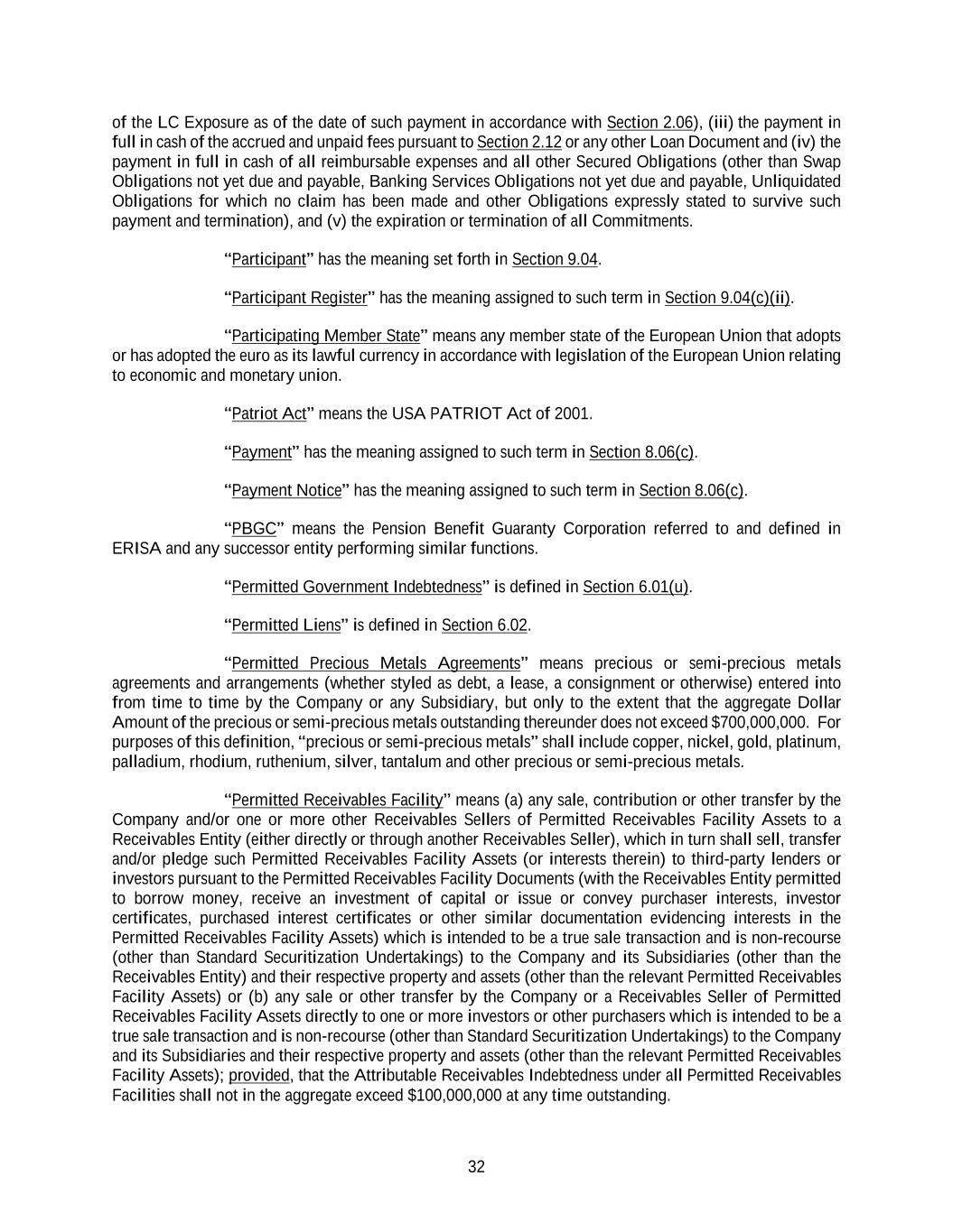 32 of the LC Exposure as of the date of such payment in accordance with Section 2.06), (iii) the payment in full in cash of the accrued and unpaid fees pursuant to Section 2.12 or any other Loan Document and (iv) the payment in full in cash of all reimbursable expenses and all other Secured Obligations (other than Swap Obligations not yet due and payable, Banking Services Obligations not yet due and payable, Unliquidated Obligations for which no claim has been made and other Obligations expressly stated to survive such payment and termination), and (v) the expiration or termination of all Commitments. “Participant” has the meaning set forth in Section 9.04. “Participant Register” has the meaning assigned to such term in Section 9.04(c)(ii). “Participating Member State” means any member state of the European Union that adopts or has adopted the euro as its lawful currency in accordance with legislation of the European Union relating to economic and monetary union. “Patriot Act” means the USA PATRIOT Act of 2001. “Payment” has the meaning assigned to such term in Section 8.06(c). “Payment Notice” has the meaning assigned to such term in Section 8.06(c). “PBGC” means the Pension Benefit Guaranty Corporation referred to and defined in ERISA and any successor entity performing similar functions. “Permitted Government Indebtedness” is defined in Section 6.01(u). “Permitted Liens” is defined in Section 6.02. “Permitted Precious Metals Agreements” means precious or semi-precious metals agreements and arrangements (whether styled as debt, a lease, a consignment or otherwise) entered into from time to time by the Company or any Subsidiary, but only to the extent that the aggregate Dollar Amount of the precious or semi-precious metals outstanding thereunder does not exceed $700,000,000. For purposes of this definition, “precious or semi-precious metals” shall include copper, nickel, gold, platinum, palladium, rhodium, ruthenium, silver, tantalum and other precious or semi-precious metals. “Permitted Receivables Facility” means (a) any sale, contribution or other transfer by the Company and/or one or more other Receivables Sellers of Permitted Receivables Facility Assets to a Receivables Entity (either directly or through another Receivables Seller), which in turn shall sell, transfer and/or pledge such Permitted Receivables Facility Assets (or interests therein) to third-party lenders or investors pursuant to the Permitted Receivables Facility Documents (with the Receivables Entity permitted to borrow money, receive an investment of capital or issue or convey purchaser interests, investor certificates, purchased interest certificates or other similar documentation evidencing interests in the Permitted Receivables Facility Assets) which is intended to be a true sale transaction and is non-recourse (other than Standard Securitization Undertakings) to the Company and its Subsidiaries (other than the Receivables Entity) and their respective property and assets (other than the relevant Permitted Receivables Facility Assets) or (b) any sale or other transfer by the Company or a Receivables Seller of Permitted Receivables Facility Assets directly to one or more investors or other purchasers which is intended to be a true sale transaction and is non-recourse (other than Standard Securitization Undertakings) to the Company and its Subsidiaries and their respective property and assets (other than the relevant Permitted Receivables Facility Assets); provided, that the Attributable Receivables Indebtedness under all Permitted Receivables Facilities shall not in the aggregate exceed $100,000,000 at any time outstanding.