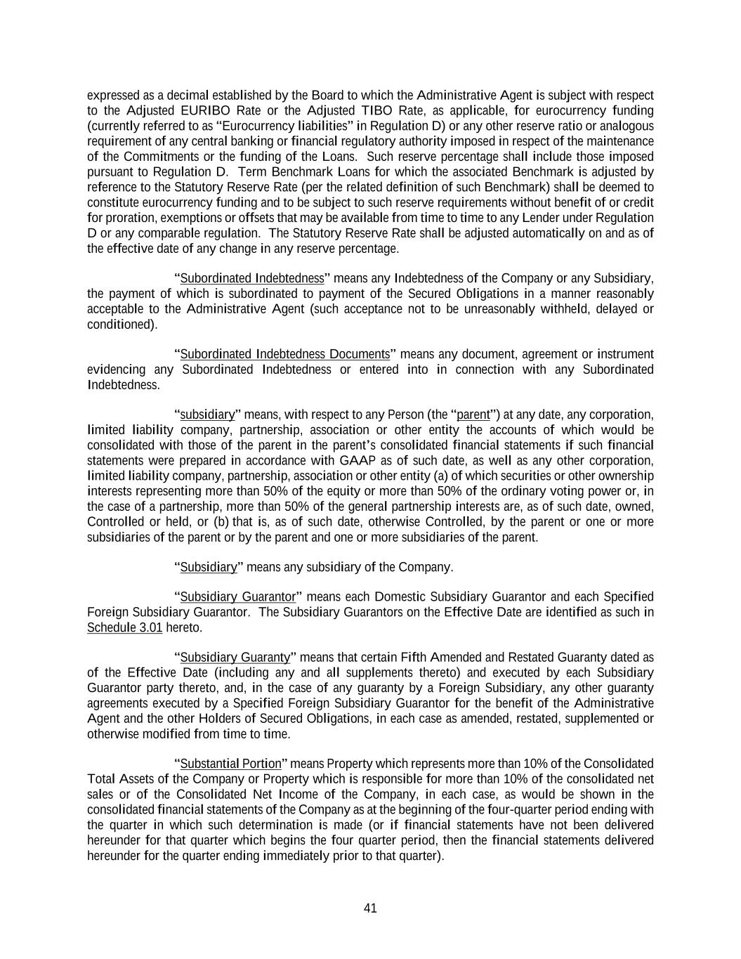 41 expressed as a decimal established by the Board to which the Administrative Agent is subject with respect to the Adjusted EURIBO Rate or the Adjusted TIBO Rate, as applicable, for eurocurrency funding (currently referred to as “Eurocurrency liabilities” in Regulation D) or any other reserve ratio or analogous requirement of any central banking or financial regulatory authority imposed in respect of the maintenance of the Commitments or the funding of the Loans. Such reserve percentage shall include those imposed pursuant to Regulation D. Term Benchmark Loans for which the associated Benchmark is adjusted by reference to the Statutory Reserve Rate (per the related definition of such Benchmark) shall be deemed to constitute eurocurrency funding and to be subject to such reserve requirements without benefit of or credit for proration, exemptions or offsets that may be available from time to time to any Lender under Regulation D or any comparable regulation. The Statutory Reserve Rate shall be adjusted automatically on and as of the effective date of any change in any reserve percentage. “Subordinated Indebtedness” means any Indebtedness of the Company or any Subsidiary, the payment of which is subordinated to payment of the Secured Obligations in a manner reasonably acceptable to the Administrative Agent (such acceptance not to be unreasonably withheld, delayed or conditioned). “Subordinated Indebtedness Documents” means any document, agreement or instrument evidencing any Subordinated Indebtedness or entered into in connection with any Subordinated Indebtedness. “subsidiary” means, with respect to any Person (the “parent”) at any date, any corporation, limited liability company, partnership, association or other entity the accounts of which would be consolidated with those of the parent in the parent’s consolidated financial statements if such financial statements were prepared in accordance with GAAP as of such date, as well as any other corporation, limited liability company, partnership, association or other entity (a) of which securities or other ownership interests representing more than 50% of the equity or more than 50% of the ordinary voting power or, in the case of a partnership, more than 50% of the general partnership interests are, as of such date, owned, Controlled or held, or (b) that is, as of such date, otherwise Controlled, by the parent or one or more subsidiaries of the parent or by the parent and one or more subsidiaries of the parent. “Subsidiary” means any subsidiary of the Company. “Subsidiary Guarantor” means each Domestic Subsidiary Guarantor and each Specified Foreign Subsidiary Guarantor. The Subsidiary Guarantors on the Effective Date are identified as such in Schedule 3.01 hereto. “Subsidiary Guaranty” means that certain Fifth Amended and Restated Guaranty dated as of the Effective Date (including any and all supplements thereto) and executed by each Subsidiary Guarantor party thereto, and, in the case of any guaranty by a Foreign Subsidiary, any other guaranty agreements executed by a Specified Foreign Subsidiary Guarantor for the benefit of the Administrative Agent and the other Holders of Secured Obligations, in each case as amended, restated, supplemented or otherwise modified from time to time. “Substantial Portion” means Property which represents more than 10% of the Consolidated Total Assets of the Company or Property which is responsible for more than 10% of the consolidated net sales or of the Consolidated Net Income of the Company, in each case, as would be shown in the consolidated financial statements of the Company as at the beginning of the four-quarter period ending with the quarter in which such determination is made (or if financial statements have not been delivered hereunder for that quarter which begins the four quarter period, then the financial statements delivered hereunder for the quarter ending immediately prior to that quarter).