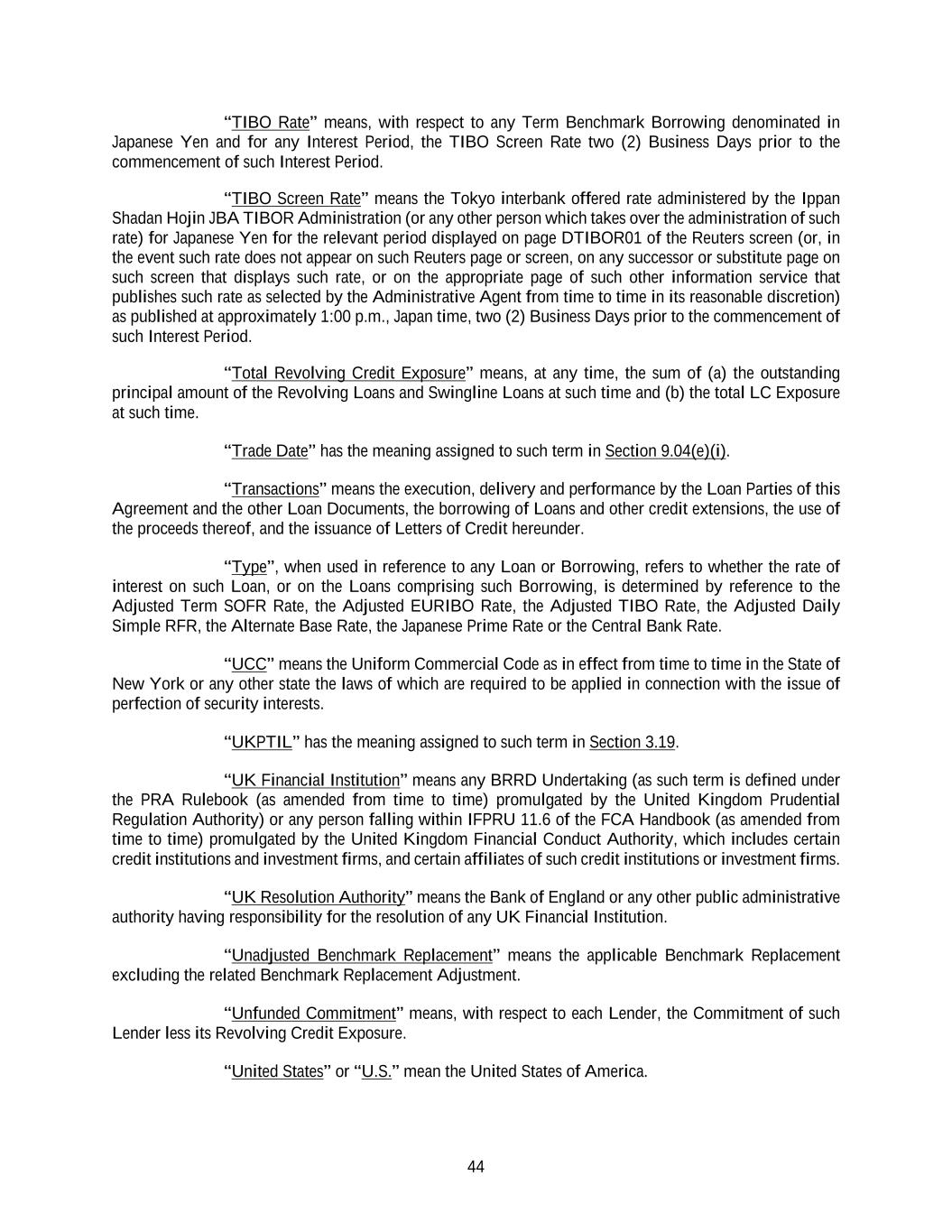 44 “TIBO Rate” means, with respect to any Term Benchmark Borrowing denominated in Japanese Yen and for any Interest Period, the TIBO Screen Rate two (2) Business Days prior to the commencement of such Interest Period. “TIBO Screen Rate” means the Tokyo interbank offered rate administered by the Ippan Shadan Hojin JBA TIBOR Administration (or any other person which takes over the administration of such rate) for Japanese Yen for the relevant period displayed on page DTIBOR01 of the Reuters screen (or, in the event such rate does not appear on such Reuters page or screen, on any successor or substitute page on such screen that displays such rate, or on the appropriate page of such other information service that publishes such rate as selected by the Administrative Agent from time to time in its reasonable discretion) as published at approximately 1:00 p.m., Japan time, two (2) Business Days prior to the commencement of such Interest Period. “Total Revolving Credit Exposure” means, at any time, the sum of (a) the outstanding principal amount of the Revolving Loans and Swingline Loans at such time and (b) the total LC Exposure at such time. “Trade Date” has the meaning assigned to such term in Section 9.04(e)(i). “Transactions” means the execution, delivery and performance by the Loan Parties of this Agreement and the other Loan Documents, the borrowing of Loans and other credit extensions, the use of the proceeds thereof, and the issuance of Letters of Credit hereunder. “Type”, when used in reference to any Loan or Borrowing, refers to whether the rate of interest on such Loan, or on the Loans comprising such Borrowing, is determined by reference to the Adjusted Term SOFR Rate, the Adjusted EURIBO Rate, the Adjusted TIBO Rate, the Adjusted Daily Simple RFR, the Alternate Base Rate, the Japanese Prime Rate or the Central Bank Rate. “UCC” means the Uniform Commercial Code as in effect from time to time in the State of New York or any other state the laws of which are required to be applied in connection with the issue of perfection of security interests. “UKPTIL” has the meaning assigned to such term in Section 3.19. “UK Financial Institution” means any BRRD Undertaking (as such term is defined under the PRA Rulebook (as amended from time to time) promulgated by the United Kingdom Prudential Regulation Authority) or any person falling within IFPRU 11.6 of the FCA Handbook (as amended from time to time) promulgated by the United Kingdom Financial Conduct Authority, which includes certain credit institutions and investment firms, and certain affiliates of such credit institutions or investment firms. “UK Resolution Authority” means the Bank of England or any other public administrative authority having responsibility for the resolution of any UK Financial Institution. “Unadjusted Benchmark Replacement” means the applicable Benchmark Replacement excluding the related Benchmark Replacement Adjustment. “Unfunded Commitment” means, with respect to each Lender, the Commitment of such Lender less its Revolving Credit Exposure. “United States” or “U.S.” mean the United States of America.