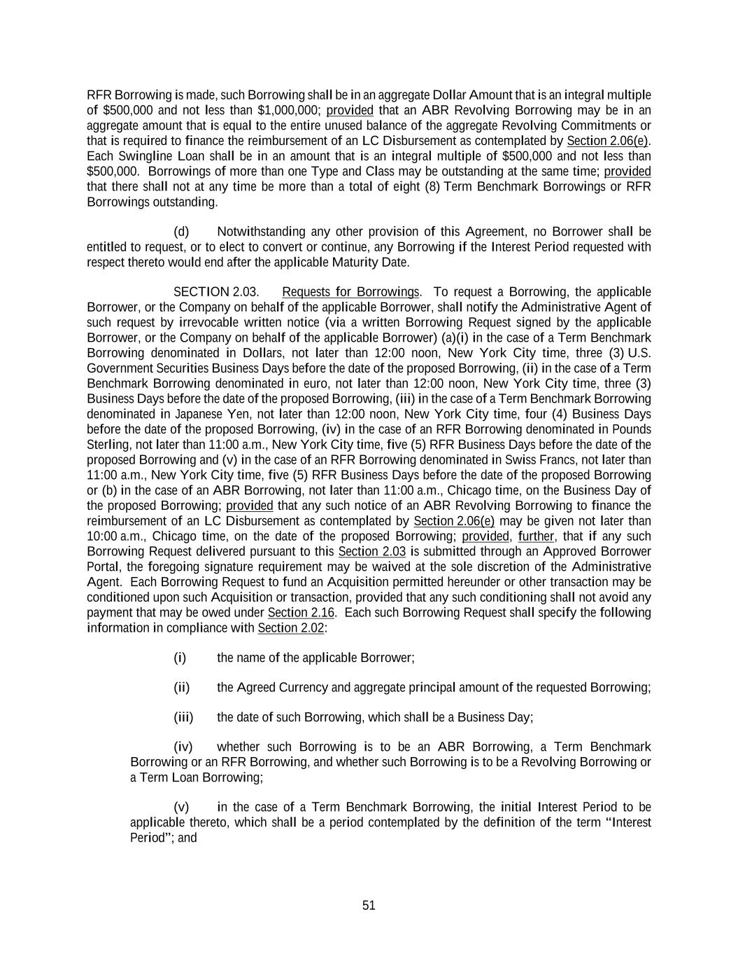 51 RFR Borrowing is made, such Borrowing shall be in an aggregate Dollar Amount that is an integral multiple of $500,000 and not less than $1,000,000; provided that an ABR Revolving Borrowing may be in an aggregate amount that is equal to the entire unused balance of the aggregate Revolving Commitments or that is required to finance the reimbursement of an LC Disbursement as contemplated by Section 2.06(e). Each Swingline Loan shall be in an amount that is an integral multiple of $500,000 and not less than $500,000. Borrowings of more than one Type and Class may be outstanding at the same time; provided that there shall not at any time be more than a total of eight (8) Term Benchmark Borrowings or RFR Borrowings outstanding. (d) Notwithstanding any other provision of this Agreement, no Borrower shall be entitled to request, or to elect to convert or continue, any Borrowing if the Interest Period requested with respect thereto would end after the applicable Maturity Date. SECTION 2.03. Requests for Borrowings. To request a Borrowing, the applicable Borrower, or the Company on behalf of the applicable Borrower, shall notify the Administrative Agent of such request by irrevocable written notice (via a written Borrowing Request signed by the applicable Borrower, or the Company on behalf of the applicable Borrower) (a)(i) in the case of a Term Benchmark Borrowing denominated in Dollars, not later than 12:00 noon, New York City time, three (3) U.S. Government Securities Business Days before the date of the proposed Borrowing, (ii) in the case of a Term Benchmark Borrowing denominated in euro, not later than 12:00 noon, New York City time, three (3) Business Days before the date of the proposed Borrowing, (iii) in the case of a Term Benchmark Borrowing denominated in Japanese Yen, not later than 12:00 noon, New York City time, four (4) Business Days before the date of the proposed Borrowing, (iv) in the case of an RFR Borrowing denominated in Pounds Sterling, not later than 11:00 a.m., New York City time, five (5) RFR Business Days before the date of the proposed Borrowing and (v) in the case of an RFR Borrowing denominated in Swiss Francs, not later than 11:00 a.m., New York City time, five (5) RFR Business Days before the date of the proposed Borrowing or (b) in the case of an ABR Borrowing, not later than 11:00 a.m., Chicago time, on the Business Day of the proposed Borrowing; provided that any such notice of an ABR Revolving Borrowing to finance the reimbursement of an LC Disbursement as contemplated by Section 2.06(e) may be given not later than 10:00 a.m., Chicago time, on the date of the proposed Borrowing; provided, further, that if any such Borrowing Request delivered pursuant to this Section 2.03 is submitted through an Approved Borrower Portal, the foregoing signature requirement may be waived at the sole discretion of the Administrative Agent. Each Borrowing Request to fund an Acquisition permitted hereunder or other transaction may be conditioned upon such Acquisition or transaction, provided that any such conditioning shall not avoid any payment that may be owed under Section 2.16. Each such Borrowing Request shall specify the following information in compliance with Section 2.02: (i) the name of the applicable Borrower; (ii) the Agreed Currency and aggregate principal amount of the requested Borrowing; (iii) the date of such Borrowing, which shall be a Business Day; (iv) whether such Borrowing is to be an ABR Borrowing, a Term Benchmark Borrowing or an RFR Borrowing, and whether such Borrowing is to be a Revolving Borrowing or a Term Loan Borrowing; (v) in the case of a Term Benchmark Borrowing, the initial Interest Period to be applicable thereto, which shall be a period contemplated by the definition of the term “Interest Period”; and