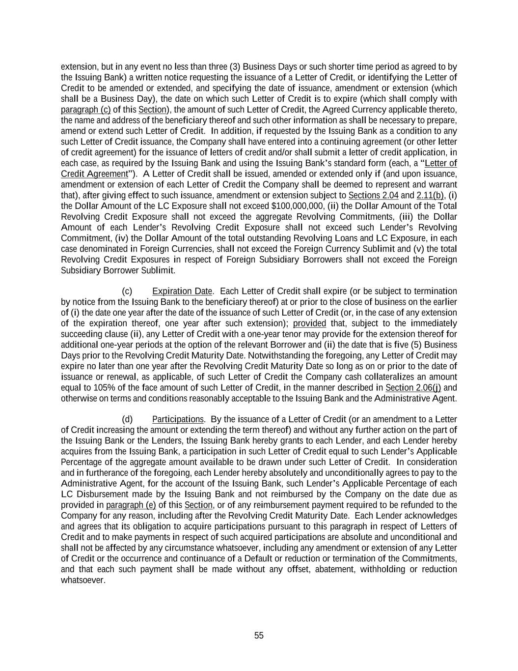 55 extension, but in any event no less than three (3) Business Days or such shorter time period as agreed to by the Issuing Bank) a written notice requesting the issuance of a Letter of Credit, or identifying the Letter of Credit to be amended or extended, and specifying the date of issuance, amendment or extension (which shall be a Business Day), the date on which such Letter of Credit is to expire (which shall comply with paragraph (c) of this Section), the amount of such Letter of Credit, the Agreed Currency applicable thereto, the name and address of the beneficiary thereof and such other information as shall be necessary to prepare, amend or extend such Letter of Credit. In addition, if requested by the Issuing Bank as a condition to any such Letter of Credit issuance, the Company shall have entered into a continuing agreement (or other letter of credit agreement) for the issuance of letters of credit and/or shall submit a letter of credit application, in each case, as required by the Issuing Bank and using the Issuing Bank’s standard form (each, a “Letter of Credit Agreement”). A Letter of Credit shall be issued, amended or extended only if (and upon issuance, amendment or extension of each Letter of Credit the Company shall be deemed to represent and warrant that), after giving effect to such issuance, amendment or extension subject to Sections 2.04 and 2.11(b), (i) the Dollar Amount of the LC Exposure shall not exceed $100,000,000, (ii) the Dollar Amount of the Total Revolving Credit Exposure shall not exceed the aggregate Revolving Commitments, (iii) the Dollar Amount of each Lender’s Revolving Credit Exposure shall not exceed such Lender’s Revolving Commitment, (iv) the Dollar Amount of the total outstanding Revolving Loans and LC Exposure, in each case denominated in Foreign Currencies, shall not exceed the Foreign Currency Sublimit and (v) the total Revolving Credit Exposures in respect of Foreign Subsidiary Borrowers shall not exceed the Foreign Subsidiary Borrower Sublimit. (c) Expiration Date. Each Letter of Credit shall expire (or be subject to termination by notice from the Issuing Bank to the beneficiary thereof) at or prior to the close of business on the earlier of (i) the date one year after the date of the issuance of such Letter of Credit (or, in the case of any extension of the expiration thereof, one year after such extension); provided that, subject to the immediately succeeding clause (ii), any Letter of Credit with a one-year tenor may provide for the extension thereof for additional one-year periods at the option of the relevant Borrower and (ii) the date that is five (5) Business Days prior to the Revolving Credit Maturity Date. Notwithstanding the foregoing, any Letter of Credit may expire no later than one year after the Revolving Credit Maturity Date so long as on or prior to the date of issuance or renewal, as applicable, of such Letter of Credit the Company cash collateralizes an amount equal to 105% of the face amount of such Letter of Credit, in the manner described in Section 2.06(j) and otherwise on terms and conditions reasonably acceptable to the Issuing Bank and the Administrative Agent. (d) Participations. By the issuance of a Letter of Credit (or an amendment to a Letter of Credit increasing the amount or extending the term thereof) and without any further action on the part of the Issuing Bank or the Lenders, the Issuing Bank hereby grants to each Lender, and each Lender hereby acquires from the Issuing Bank, a participation in such Letter of Credit equal to such Lender’s Applicable Percentage of the aggregate amount available to be drawn under such Letter of Credit. In consideration and in furtherance of the foregoing, each Lender hereby absolutely and unconditionally agrees to pay to the Administrative Agent, for the account of the Issuing Bank, such Lender’s Applicable Percentage of each LC Disbursement made by the Issuing Bank and not reimbursed by the Company on the date due as provided in paragraph (e) of this Section, or of any reimbursement payment required to be refunded to the Company for any reason, including after the Revolving Credit Maturity Date. Each Lender acknowledges and agrees that its obligation to acquire participations pursuant to this paragraph in respect of Letters of Credit and to make payments in respect of such acquired participations are absolute and unconditional and shall not be affected by any circumstance whatsoever, including any amendment or extension of any Letter of Credit or the occurrence and continuance of a Default or reduction or termination of the Commitments, and that each such payment shall be made without any offset, abatement, withholding or reduction whatsoever.