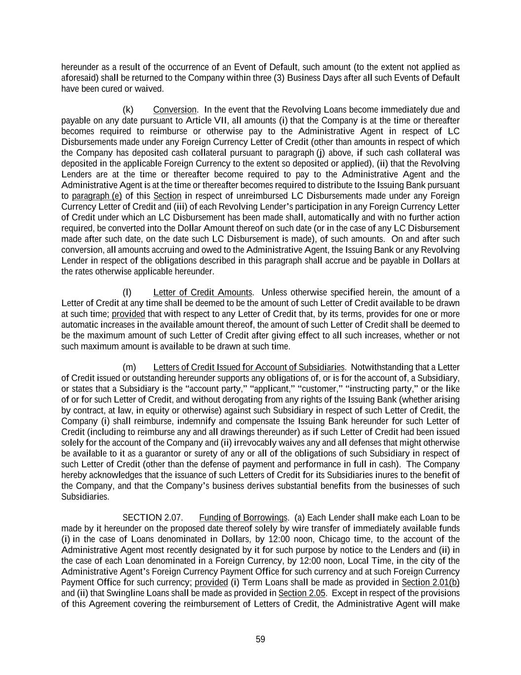59 hereunder as a result of the occurrence of an Event of Default, such amount (to the extent not applied as aforesaid) shall be returned to the Company within three (3) Business Days after all such Events of Default have been cured or waived. (k) Conversion. In the event that the Revolving Loans become immediately due and payable on any date pursuant to Article VII, all amounts (i) that the Company is at the time or thereafter becomes required to reimburse or otherwise pay to the Administrative Agent in respect of LC Disbursements made under any Foreign Currency Letter of Credit (other than amounts in respect of which the Company has deposited cash collateral pursuant to paragraph (j) above, if such cash collateral was deposited in the applicable Foreign Currency to the extent so deposited or applied), (ii) that the Revolving Lenders are at the time or thereafter become required to pay to the Administrative Agent and the Administrative Agent is at the time or thereafter becomes required to distribute to the Issuing Bank pursuant to paragraph (e) of this Section in respect of unreimbursed LC Disbursements made under any Foreign Currency Letter of Credit and (iii) of each Revolving Lender’s participation in any Foreign Currency Letter of Credit under which an LC Disbursement has been made shall, automatically and with no further action required, be converted into the Dollar Amount thereof on such date (or in the case of any LC Disbursement made after such date, on the date such LC Disbursement is made), of such amounts. On and after such conversion, all amounts accruing and owed to the Administrative Agent, the Issuing Bank or any Revolving Lender in respect of the obligations described in this paragraph shall accrue and be payable in Dollars at the rates otherwise applicable hereunder. (l) Letter of Credit Amounts. Unless otherwise specified herein, the amount of a Letter of Credit at any time shall be deemed to be the amount of such Letter of Credit available to be drawn at such time; provided that with respect to any Letter of Credit that, by its terms, provides for one or more automatic increases in the available amount thereof, the amount of such Letter of Credit shall be deemed to be the maximum amount of such Letter of Credit after giving effect to all such increases, whether or not such maximum amount is available to be drawn at such time. (m) Letters of Credit Issued for Account of Subsidiaries. Notwithstanding that a Letter of Credit issued or outstanding hereunder supports any obligations of, or is for the account of, a Subsidiary, or states that a Subsidiary is the “account party,” “applicant,” “customer,” “instructing party,” or the like of or for such Letter of Credit, and without derogating from any rights of the Issuing Bank (whether arising by contract, at law, in equity or otherwise) against such Subsidiary in respect of such Letter of Credit, the Company (i) shall reimburse, indemnify and compensate the Issuing Bank hereunder for such Letter of Credit (including to reimburse any and all drawings thereunder) as if such Letter of Credit had been issued solely for the account of the Company and (ii) irrevocably waives any and all defenses that might otherwise be available to it as a guarantor or surety of any or all of the obligations of such Subsidiary in respect of such Letter of Credit (other than the defense of payment and performance in full in cash). The Company hereby acknowledges that the issuance of such Letters of Credit for its Subsidiaries inures to the benefit of the Company, and that the Company’s business derives substantial benefits from the businesses of such Subsidiaries. SECTION 2.07. Funding of Borrowings. (a) Each Lender shall make each Loan to be made by it hereunder on the proposed date thereof solely by wire transfer of immediately available funds (i) in the case of Loans denominated in Dollars, by 12:00 noon, Chicago time, to the account of the Administrative Agent most recently designated by it for such purpose by notice to the Lenders and (ii) in the case of each Loan denominated in a Foreign Currency, by 12:00 noon, Local Time, in the city of the Administrative Agent’s Foreign Currency Payment Office for such currency and at such Foreign Currency Payment Office for such currency; provided (i) Term Loans shall be made as provided in Section 2.01(b) and (ii) that Swingline Loans shall be made as provided in Section 2.05. Except in respect of the provisions of this Agreement covering the reimbursement of Letters of Credit, the Administrative Agent will make