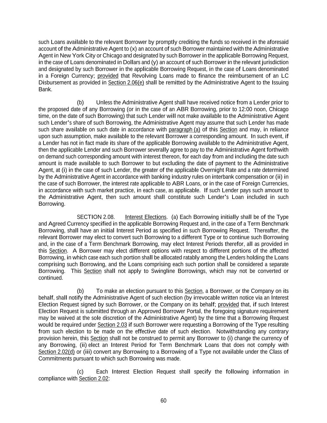 60 such Loans available to the relevant Borrower by promptly crediting the funds so received in the aforesaid account of the Administrative Agent to (x) an account of such Borrower maintained with the Administrative Agent in New York City or Chicago and designated by such Borrower in the applicable Borrowing Request, in the case of Loans denominated in Dollars and (y) an account of such Borrower in the relevant jurisdiction and designated by such Borrower in the applicable Borrowing Request, in the case of Loans denominated in a Foreign Currency; provided that Revolving Loans made to finance the reimbursement of an LC Disbursement as provided in Section 2.06(e) shall be remitted by the Administrative Agent to the Issuing Bank. (b) Unless the Administrative Agent shall have received notice from a Lender prior to the proposed date of any Borrowing (or in the case of an ABR Borrowing, prior to 12:00 noon, Chicago time, on the date of such Borrowing) that such Lender will not make available to the Administrative Agent such Lender’s share of such Borrowing, the Administrative Agent may assume that such Lender has made such share available on such date in accordance with paragraph (a) of this Section and may, in reliance upon such assumption, make available to the relevant Borrower a corresponding amount. In such event, if a Lender has not in fact made its share of the applicable Borrowing available to the Administrative Agent, then the applicable Lender and such Borrower severally agree to pay to the Administrative Agent forthwith on demand such corresponding amount with interest thereon, for each day from and including the date such amount is made available to such Borrower to but excluding the date of payment to the Administrative Agent, at (i) in the case of such Lender, the greater of the applicable Overnight Rate and a rate determined by the Administrative Agent in accordance with banking industry rules on interbank compensation or (ii) in the case of such Borrower, the interest rate applicable to ABR Loans, or in the case of Foreign Currencies, in accordance with such market practice, in each case, as applicable. If such Lender pays such amount to the Administrative Agent, then such amount shall constitute such Lender’s Loan included in such Borrowing. SECTION 2.08. Interest Elections. (a) Each Borrowing initially shall be of the Type and Agreed Currency specified in the applicable Borrowing Request and, in the case of a Term Benchmark Borrowing, shall have an initial Interest Period as specified in such Borrowing Request. Thereafter, the relevant Borrower may elect to convert such Borrowing to a different Type or to continue such Borrowing and, in the case of a Term Benchmark Borrowing, may elect Interest Periods therefor, all as provided in this Section. A Borrower may elect different options with respect to different portions of the affected Borrowing, in which case each such portion shall be allocated ratably among the Lenders holding the Loans comprising such Borrowing, and the Loans comprising each such portion shall be considered a separate Borrowing. This Section shall not apply to Swingline Borrowings, which may not be converted or continued. (b) To make an election pursuant to this Section, a Borrower, or the Company on its behalf, shall notify the Administrative Agent of such election (by irrevocable written notice via an Interest Election Request signed by such Borrower, or the Company on its behalf; provided that, if such Interest Election Request is submitted through an Approved Borrower Portal, the foregoing signature requirement may be waived at the sole discretion of the Administrative Agent) by the time that a Borrowing Request would be required under Section 2.03 if such Borrower were requesting a Borrowing of the Type resulting from such election to be made on the effective date of such election. Notwithstanding any contrary provision herein, this Section shall not be construed to permit any Borrower to (i) change the currency of any Borrowing, (ii) elect an Interest Period for Term Benchmark Loans that does not comply with Section 2.02(d) or (iii) convert any Borrowing to a Borrowing of a Type not available under the Class of Commitments pursuant to which such Borrowing was made. (c) Each Interest Election Request shall specify the following information in compliance with Section 2.02: