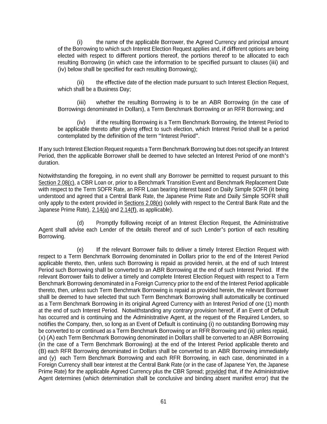 61 (i) the name of the applicable Borrower, the Agreed Currency and principal amount of the Borrowing to which such Interest Election Request applies and, if different options are being elected with respect to different portions thereof, the portions thereof to be allocated to each resulting Borrowing (in which case the information to be specified pursuant to clauses (iii) and (iv) below shall be specified for each resulting Borrowing); (ii) the effective date of the election made pursuant to such Interest Election Request, which shall be a Business Day; (iii) whether the resulting Borrowing is to be an ABR Borrowing (in the case of Borrowings denominated in Dollars), a Term Benchmark Borrowing or an RFR Borrowing; and (iv) if the resulting Borrowing is a Term Benchmark Borrowing, the Interest Period to be applicable thereto after giving effect to such election, which Interest Period shall be a period contemplated by the definition of the term “Interest Period”. If any such Interest Election Request requests a Term Benchmark Borrowing but does not specify an Interest Period, then the applicable Borrower shall be deemed to have selected an Interest Period of one month’s duration. Notwithstanding the foregoing, in no event shall any Borrower be permitted to request pursuant to this Section 2.08(c), a CBR Loan or, prior to a Benchmark Transition Event and Benchmark Replacement Date with respect to the Term SOFR Rate, an RFR Loan bearing interest based on Daily Simple SOFR (it being understood and agreed that a Central Bank Rate, the Japanese Prime Rate and Daily Simple SOFR shall only apply to the extent provided in Sections 2.08(e) (solely with respect to the Central Bank Rate and the Japanese Prime Rate), 2.14(a) and 2.14(f), as applicable). (d) Promptly following receipt of an Interest Election Request, the Administrative Agent shall advise each Lender of the details thereof and of such Lender’s portion of each resulting Borrowing. (e) If the relevant Borrower fails to deliver a timely Interest Election Request with respect to a Term Benchmark Borrowing denominated in Dollars prior to the end of the Interest Period applicable thereto, then, unless such Borrowing is repaid as provided herein, at the end of such Interest Period such Borrowing shall be converted to an ABR Borrowing at the end of such Interest Period. If the relevant Borrower fails to deliver a timely and complete Interest Election Request with respect to a Term Benchmark Borrowing denominated in a Foreign Currency prior to the end of the Interest Period applicable thereto, then, unless such Term Benchmark Borrowing is repaid as provided herein, the relevant Borrower shall be deemed to have selected that such Term Benchmark Borrowing shall automatically be continued as a Term Benchmark Borrowing in its original Agreed Currency with an Interest Period of one (1) month at the end of such Interest Period. Notwithstanding any contrary provision hereof, if an Event of Default has occurred and is continuing and the Administrative Agent, at the request of the Required Lenders, so notifies the Company, then, so long as an Event of Default is continuing (i) no outstanding Borrowing may be converted to or continued as a Term Benchmark Borrowing or an RFR Borrowing and (ii) unless repaid, (x) (A) each Term Benchmark Borrowing denominated in Dollars shall be converted to an ABR Borrowing (in the case of a Term Benchmark Borrowing) at the end of the Interest Period applicable thereto and (B) each RFR Borrowing denominated in Dollars shall be converted to an ABR Borrowing immediately and (y) each Term Benchmark Borrowing and each RFR Borrowing, in each case, denominated in a Foreign Currency shall bear interest at the Central Bank Rate (or in the case of Japanese Yen, the Japanese Prime Rate) for the applicable Agreed Currency plus the CBR Spread; provided that, if the Administrative Agent determines (which determination shall be conclusive and binding absent manifest error) that the