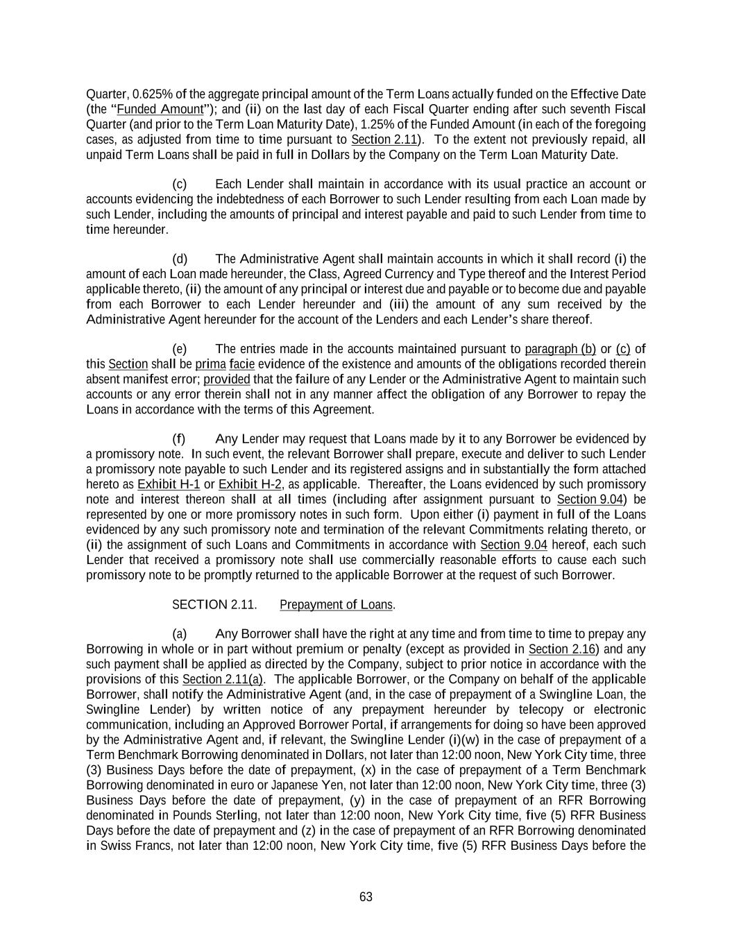 63 Quarter, 0.625% of the aggregate principal amount of the Term Loans actually funded on the Effective Date (the “Funded Amount”); and (ii) on the last day of each Fiscal Quarter ending after such seventh Fiscal Quarter (and prior to the Term Loan Maturity Date), 1.25% of the Funded Amount (in each of the foregoing cases, as adjusted from time to time pursuant to Section 2.11). To the extent not previously repaid, all unpaid Term Loans shall be paid in full in Dollars by the Company on the Term Loan Maturity Date. (c) Each Lender shall maintain in accordance with its usual practice an account or accounts evidencing the indebtedness of each Borrower to such Lender resulting from each Loan made by such Lender, including the amounts of principal and interest payable and paid to such Lender from time to time hereunder. (d) The Administrative Agent shall maintain accounts in which it shall record (i) the amount of each Loan made hereunder, the Class, Agreed Currency and Type thereof and the Interest Period applicable thereto, (ii) the amount of any principal or interest due and payable or to become due and payable from each Borrower to each Lender hereunder and (iii) the amount of any sum received by the Administrative Agent hereunder for the account of the Lenders and each Lender’s share thereof. (e) The entries made in the accounts maintained pursuant to paragraph (b) or (c) of this Section shall be prima facie evidence of the existence and amounts of the obligations recorded therein absent manifest error; provided that the failure of any Lender or the Administrative Agent to maintain such accounts or any error therein shall not in any manner affect the obligation of any Borrower to repay the Loans in accordance with the terms of this Agreement. (f) Any Lender may request that Loans made by it to any Borrower be evidenced by a promissory note. In such event, the relevant Borrower shall prepare, execute and deliver to such Lender a promissory note payable to such Lender and its registered assigns and in substantially the form attached hereto as Exhibit H-1 or Exhibit H-2, as applicable. Thereafter, the Loans evidenced by such promissory note and interest thereon shall at all times (including after assignment pursuant to Section 9.04) be represented by one or more promissory notes in such form. Upon either (i) payment in full of the Loans evidenced by any such promissory note and termination of the relevant Commitments relating thereto, or (ii) the assignment of such Loans and Commitments in accordance with Section 9.04 hereof, each such Lender that received a promissory note shall use commercially reasonable efforts to cause each such promissory note to be promptly returned to the applicable Borrower at the request of such Borrower. SECTION 2.11. Prepayment of Loans. (a) Any Borrower shall have the right at any time and from time to time to prepay any Borrowing in whole or in part without premium or penalty (except as provided in Section 2.16) and any such payment shall be applied as directed by the Company, subject to prior notice in accordance with the provisions of this Section 2.11(a). The applicable Borrower, or the Company on behalf of the applicable Borrower, shall notify the Administrative Agent (and, in the case of prepayment of a Swingline Loan, the Swingline Lender) by written notice of any prepayment hereunder by telecopy or electronic communication, including an Approved Borrower Portal, if arrangements for doing so have been approved by the Administrative Agent and, if relevant, the Swingline Lender (i)(w) in the case of prepayment of a Term Benchmark Borrowing denominated in Dollars, not later than 12:00 noon, New York City time, three (3) Business Days before the date of prepayment, (x) in the case of prepayment of a Term Benchmark Borrowing denominated in euro or Japanese Yen, not later than 12:00 noon, New York City time, three (3) Business Days before the date of prepayment, (y) in the case of prepayment of an RFR Borrowing denominated in Pounds Sterling, not later than 12:00 noon, New York City time, five (5) RFR Business Days before the date of prepayment and (z) in the case of prepayment of an RFR Borrowing denominated in Swiss Francs, not later than 12:00 noon, New York City time, five (5) RFR Business Days before the