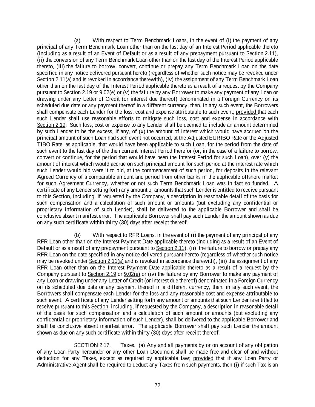72 (a) With respect to Term Benchmark Loans, in the event of (i) the payment of any principal of any Term Benchmark Loan other than on the last day of an Interest Period applicable thereto (including as a result of an Event of Default or as a result of any prepayment pursuant to Section 2.11), (ii) the conversion of any Term Benchmark Loan other than on the last day of the Interest Period applicable thereto, (iii) the failure to borrow, convert, continue or prepay any Term Benchmark Loan on the date specified in any notice delivered pursuant hereto (regardless of whether such notice may be revoked under Section 2.11(a) and is revoked in accordance therewith), (iv) the assignment of any Term Benchmark Loan other than on the last day of the Interest Period applicable thereto as a result of a request by the Company pursuant to Section 2.19 or 9.02(e) or (v) the failure by any Borrower to make any payment of any Loan or drawing under any Letter of Credit (or interest due thereof) denominated in a Foreign Currency on its scheduled due date or any payment thereof in a different currency, then, in any such event, the Borrowers shall compensate each Lender for the loss, cost and expense attributable to such event; provided that each such Lender shall use reasonable efforts to mitigate such loss, cost and expense in accordance with Section 2.19. Such loss, cost or expense to any Lender shall be deemed to include an amount determined by such Lender to be the excess, if any, of (x) the amount of interest which would have accrued on the principal amount of such Loan had such event not occurred, at the Adjusted EURIBO Rate or the Adjusted TIBO Rate, as applicable, that would have been applicable to such Loan, for the period from the date of such event to the last day of the then current Interest Period therefor (or, in the case of a failure to borrow, convert or continue, for the period that would have been the Interest Period for such Loan), over (y) the amount of interest which would accrue on such principal amount for such period at the interest rate which such Lender would bid were it to bid, at the commencement of such period, for deposits in the relevant Agreed Currency of a comparable amount and period from other banks in the applicable offshore market for such Agreement Currency, whether or not such Term Benchmark Loan was in fact so funded. A certificate of any Lender setting forth any amount or amounts that such Lender is entitled to receive pursuant to this Section, including, if requested by the Company, a description in reasonable detail of the basis for such compensation and a calculation of such amount or amounts (but excluding any confidential or proprietary information of such Lender), shall be delivered to the applicable Borrower and shall be conclusive absent manifest error. The applicable Borrower shall pay such Lender the amount shown as due on any such certificate within thirty (30) days after receipt thereof. (b) With respect to RFR Loans, in the event of (i) the payment of any principal of any RFR Loan other than on the Interest Payment Date applicable thereto (including as a result of an Event of Default or as a result of any prepayment pursuant to Section 2.11), (ii) the failure to borrow or prepay any RFR Loan on the date specified in any notice delivered pursuant hereto (regardless of whether such notice may be revoked under Section 2.11(a) and is revoked in accordance therewith), (iii) the assignment of any RFR Loan other than on the Interest Payment Date applicable thereto as a result of a request by the Company pursuant to Section 2.19 or 9.02(e) or (iv) the failure by any Borrower to make any payment of any Loan or drawing under any Letter of Credit (or interest due thereof) denominated in a Foreign Currency on its scheduled due date or any payment thereof in a different currency, then, in any such event, the Borrowers shall compensate each Lender for the loss and any reasonable cost and expense attributable to such event. A certificate of any Lender setting forth any amount or amounts that such Lender is entitled to receive pursuant to this Section, including, if requested by the Company, a description in reasonable detail of the basis for such compensation and a calculation of such amount or amounts (but excluding any confidential or proprietary information of such Lender), shall be delivered to the applicable Borrower and shall be conclusive absent manifest error. The applicable Borrower shall pay such Lender the amount shown as due on any such certificate within thirty (30) days after receipt thereof. SECTION 2.17. Taxes. (a) Any and all payments by or on account of any obligation of any Loan Party hereunder or any other Loan Document shall be made free and clear of and without deduction for any Taxes, except as required by applicable law; provided that if any Loan Party or Administrative Agent shall be required to deduct any Taxes from such payments, then (i) if such Tax is an