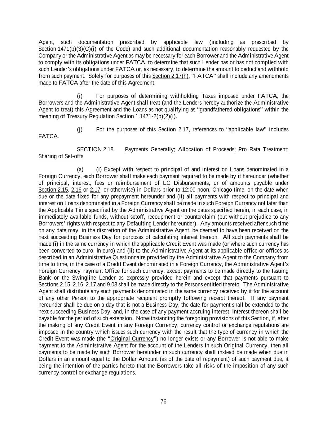 76 Agent, such documentation prescribed by applicable law (including as prescribed by Section 1471(b)(3)(C)(i) of the Code) and such additional documentation reasonably requested by the Company or the Administrative Agent as may be necessary for each Borrower and the Administrative Agent to comply with its obligations under FATCA, to determine that such Lender has or has not complied with such Lender’s obligations under FATCA or, as necessary, to determine the amount to deduct and withhold from such payment. Solely for purposes of this Section 2.17(h), “FATCA” shall include any amendments made to FATCA after the date of this Agreement. (i) For purposes of determining withholding Taxes imposed under FATCA, the Borrowers and the Administrative Agent shall treat (and the Lenders hereby authorize the Administrative Agent to treat) this Agreement and the Loans as not qualifying as “grandfathered obligations” within the meaning of Treasury Regulation Section 1.1471-2(b)(2)(i). (j) For the purposes of this Section 2.17, references to “applicable law” includes FATCA. SECTION 2.18. Payments Generally; Allocation of Proceeds; Pro Rata Treatment; Sharing of Set-offs. (a) (i) Except with respect to principal of and interest on Loans denominated in a Foreign Currency, each Borrower shall make each payment required to be made by it hereunder (whether of principal, interest, fees or reimbursement of LC Disbursements, or of amounts payable under Section 2.15, 2.16 or 2.17, or otherwise) in Dollars prior to 12:00 noon, Chicago time, on the date when due or the date fixed for any prepayment hereunder and (ii) all payments with respect to principal and interest on Loans denominated in a Foreign Currency shall be made in such Foreign Currency not later than the Applicable Time specified by the Administrative Agent on the dates specified herein, in each case, in immediately available funds, without setoff, recoupment or counterclaim (but without prejudice to any Borrowers’ rights with respect to any Defaulting Lender hereunder). Any amounts received after such time on any date may, in the discretion of the Administrative Agent, be deemed to have been received on the next succeeding Business Day for purposes of calculating interest thereon. All such payments shall be made (i) in the same currency in which the applicable Credit Event was made (or where such currency has been converted to euro, in euro) and (ii) to the Administrative Agent at its applicable office or offices as described in an Administrative Questionnaire provided by the Administrative Agent to the Company from time to time, in the case of a Credit Event denominated in a Foreign Currency, the Administrative Agent’s Foreign Currency Payment Office for such currency, except payments to be made directly to the Issuing Bank or the Swingline Lender as expressly provided herein and except that payments pursuant to Sections 2.15, 2.16, 2.17 and 9.03 shall be made directly to the Persons entitled thereto. The Administrative Agent shall distribute any such payments denominated in the same currency received by it for the account of any other Person to the appropriate recipient promptly following receipt thereof. If any payment hereunder shall be due on a day that is not a Business Day, the date for payment shall be extended to the next succeeding Business Day, and, in the case of any payment accruing interest, interest thereon shall be payable for the period of such extension. Notwithstanding the foregoing provisions of this Section, if, after the making of any Credit Event in any Foreign Currency, currency control or exchange regulations are imposed in the country which issues such currency with the result that the type of currency in which the Credit Event was made (the “Original Currency”) no longer exists or any Borrower is not able to make payment to the Administrative Agent for the account of the Lenders in such Original Currency, then all payments to be made by such Borrower hereunder in such currency shall instead be made when due in Dollars in an amount equal to the Dollar Amount (as of the date of repayment) of such payment due, it being the intention of the parties hereto that the Borrowers take all risks of the imposition of any such currency control or exchange regulations.