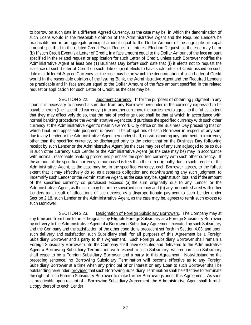 82 to borrow on such date in a different Agreed Currency, as the case may be, in which the denomination of such Loans would in the reasonable opinion of the Administrative Agent and the Required Lenders be practicable and in an aggregate principal amount equal to the Dollar Amount of the aggregate principal amount specified in the related Credit Event Request or Interest Election Request, as the case may be or (b) if such Credit Event is a Letter of Credit, in a face amount equal to the Dollar Amount of the face amount specified in the related request or application for such Letter of Credit, unless such Borrower notifies the Administrative Agent at least one (1) Business Day before such date that (i) it elects not to request the issuance of such Letter of Credit on such date or (ii) it elects to have such Letter of Credit issued on such date in a different Agreed Currency, as the case may be, in which the denomination of such Letter of Credit would in the reasonable opinion of the Issuing Bank, the Administrative Agent and the Required Lenders be practicable and in face amount equal to the Dollar Amount of the face amount specified in the related request or application for such Letter of Credit, as the case may be. SECTION 2.22. Judgment Currency. If for the purposes of obtaining judgment in any court it is necessary to convert a sum due from any Borrower hereunder in the currency expressed to be payable herein (the “specified currency”) into another currency, the parties hereto agree, to the fullest extent that they may effectively do so, that the rate of exchange used shall be that at which in accordance with normal banking procedures the Administrative Agent could purchase the specified currency with such other currency at the Administrative Agent’s main New York City office on the Business Day preceding that on which final, non appealable judgment is given. The obligations of each Borrower in respect of any sum due to any Lender or the Administrative Agent hereunder shall, notwithstanding any judgment in a currency other than the specified currency, be discharged only to the extent that on the Business Day following receipt by such Lender or the Administrative Agent (as the case may be) of any sum adjudged to be so due in such other currency such Lender or the Administrative Agent (as the case may be) may in accordance with normal, reasonable banking procedures purchase the specified currency with such other currency. If the amount of the specified currency so purchased is less than the sum originally due to such Lender or the Administrative Agent, as the case may be, in the specified currency, each Borrower agrees, to the fullest extent that it may effectively do so, as a separate obligation and notwithstanding any such judgment, to indemnify such Lender or the Administrative Agent, as the case may be, against such loss, and if the amount of the specified currency so purchased exceeds (a) the sum originally due to any Lender or the Administrative Agent, as the case may be, in the specified currency and (b) any amounts shared with other Lenders as a result of allocations of such excess as a disproportionate payment to such Lender under Section 2.18, such Lender or the Administrative Agent, as the case may be, agrees to remit such excess to such Borrower. SECTION 2.23. Designation of Foreign Subsidiary Borrowers. The Company may at any time and from time to time designate any Eligible Foreign Subsidiary as a Foreign Subsidiary Borrower by delivery to the Administrative Agent of a Borrowing Subsidiary Agreement executed by such Subsidiary and the Company and the satisfaction of the other conditions precedent set forth in Section 4.03, and upon such delivery and satisfaction such Subsidiary shall for all purposes of this Agreement be a Foreign Subsidiary Borrower and a party to this Agreement. Each Foreign Subsidiary Borrower shall remain a Foreign Subsidiary Borrower until the Company shall have executed and delivered to the Administrative Agent a Borrowing Subsidiary Termination with respect to such Subsidiary, whereupon such Subsidiary shall cease to be a Foreign Subsidiary Borrower and a party to this Agreement. Notwithstanding the preceding sentence, no Borrowing Subsidiary Termination will become effective as to any Foreign Subsidiary Borrower at a time when any principal of or interest on any Loan to such Borrower shall be outstanding hereunder, provided that such Borrowing Subsidiary Termination shall be effective to terminate the right of such Foreign Subsidiary Borrower to make further Borrowings under this Agreement. As soon as practicable upon receipt of a Borrowing Subsidiary Agreement, the Administrative Agent shall furnish a copy thereof to each Lender.