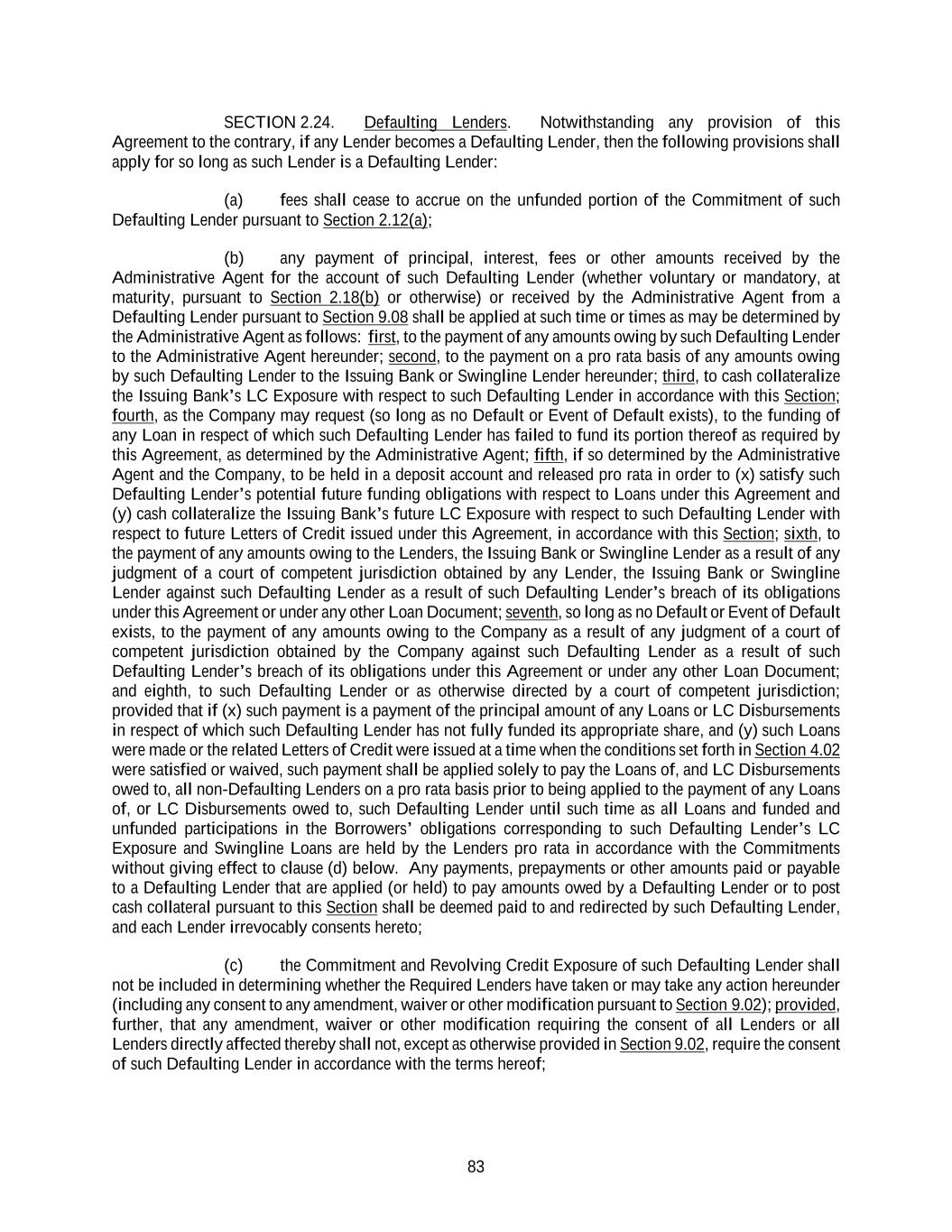 83 SECTION 2.24. Defaulting Lenders. Notwithstanding any provision of this Agreement to the contrary, if any Lender becomes a Defaulting Lender, then the following provisions shall apply for so long as such Lender is a Defaulting Lender: (a) fees shall cease to accrue on the unfunded portion of the Commitment of such Defaulting Lender pursuant to Section 2.12(a); (b) any payment of principal, interest, fees or other amounts received by the Administrative Agent for the account of such Defaulting Lender (whether voluntary or mandatory, at maturity, pursuant to Section 2.18(b) or otherwise) or received by the Administrative Agent from a Defaulting Lender pursuant to Section 9.08 shall be applied at such time or times as may be determined by the Administrative Agent as follows: first, to the payment of any amounts owing by such Defaulting Lender to the Administrative Agent hereunder; second, to the payment on a pro rata basis of any amounts owing by such Defaulting Lender to the Issuing Bank or Swingline Lender hereunder; third, to cash collateralize the Issuing Bank’s LC Exposure with respect to such Defaulting Lender in accordance with this Section; fourth, as the Company may request (so long as no Default or Event of Default exists), to the funding of any Loan in respect of which such Defaulting Lender has failed to fund its portion thereof as required by this Agreement, as determined by the Administrative Agent; fifth, if so determined by the Administrative Agent and the Company, to be held in a deposit account and released pro rata in order to (x) satisfy such Defaulting Lender’s potential future funding obligations with respect to Loans under this Agreement and (y) cash collateralize the Issuing Bank’s future LC Exposure with respect to such Defaulting Lender with respect to future Letters of Credit issued under this Agreement, in accordance with this Section; sixth, to the payment of any amounts owing to the Lenders, the Issuing Bank or Swingline Lender as a result of any judgment of a court of competent jurisdiction obtained by any Lender, the Issuing Bank or Swingline Lender against such Defaulting Lender as a result of such Defaulting Lender’s breach of its obligations under this Agreement or under any other Loan Document; seventh, so long as no Default or Event of Default exists, to the payment of any amounts owing to the Company as a result of any judgment of a court of competent jurisdiction obtained by the Company against such Defaulting Lender as a result of such Defaulting Lender’s breach of its obligations under this Agreement or under any other Loan Document; and eighth, to such Defaulting Lender or as otherwise directed by a court of competent jurisdiction; provided that if (x) such payment is a payment of the principal amount of any Loans or LC Disbursements in respect of which such Defaulting Lender has not fully funded its appropriate share, and (y) such Loans were made or the related Letters of Credit were issued at a time when the conditions set forth in Section 4.02 were satisfied or waived, such payment shall be applied solely to pay the Loans of, and LC Disbursements owed to, all non-Defaulting Lenders on a pro rata basis prior to being applied to the payment of any Loans of, or LC Disbursements owed to, such Defaulting Lender until such time as all Loans and funded and unfunded participations in the Borrowers’ obligations corresponding to such Defaulting Lender’s LC Exposure and Swingline Loans are held by the Lenders pro rata in accordance with the Commitments without giving effect to clause (d) below. Any payments, prepayments or other amounts paid or payable to a Defaulting Lender that are applied (or held) to pay amounts owed by a Defaulting Lender or to post cash collateral pursuant to this Section shall be deemed paid to and redirected by such Defaulting Lender, and each Lender irrevocably consents hereto; (c) the Commitment and Revolving Credit Exposure of such Defaulting Lender shall not be included in determining whether the Required Lenders have taken or may take any action hereunder (including any consent to any amendment, waiver or other modification pursuant to Section 9.02); provided, further, that any amendment, waiver or other modification requiring the consent of all Lenders or all Lenders directly affected thereby shall not, except as otherwise provided in Section 9.02, require the consent of such Defaulting Lender in accordance with the terms hereof;