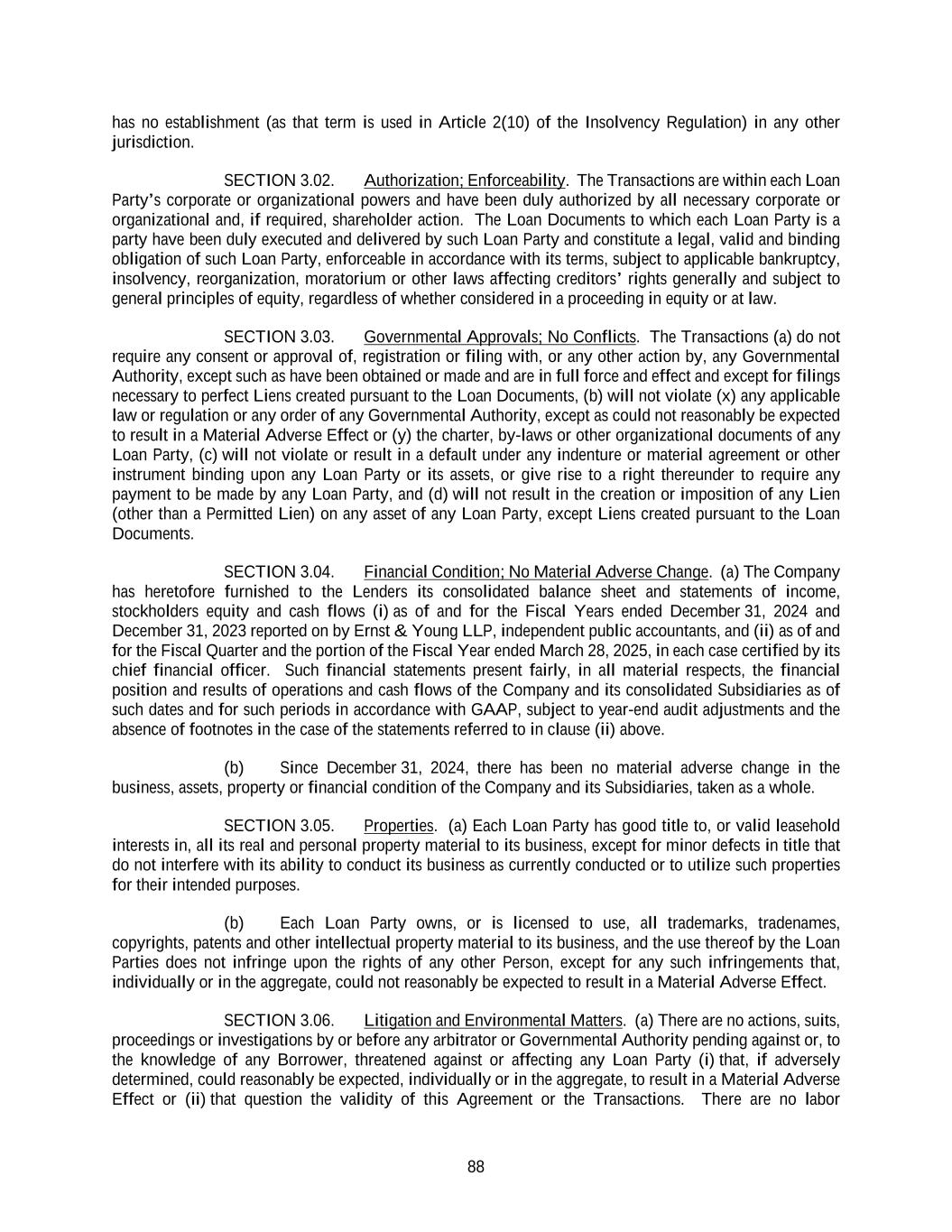 88 has no establishment (as that term is used in Article 2(10) of the Insolvency Regulation) in any other jurisdiction. SECTION 3.02. Authorization; Enforceability. The Transactions are within each Loan Party’s corporate or organizational powers and have been duly authorized by all necessary corporate or organizational and, if required, shareholder action. The Loan Documents to which each Loan Party is a party have been duly executed and delivered by such Loan Party and constitute a legal, valid and binding obligation of such Loan Party, enforceable in accordance with its terms, subject to applicable bankruptcy, insolvency, reorganization, moratorium or other laws affecting creditors’ rights generally and subject to general principles of equity, regardless of whether considered in a proceeding in equity or at law. SECTION 3.03. Governmental Approvals; No Conflicts. The Transactions (a) do not require any consent or approval of, registration or filing with, or any other action by, any Governmental Authority, except such as have been obtained or made and are in full force and effect and except for filings necessary to perfect Liens created pursuant to the Loan Documents, (b) will not violate (x) any applicable law or regulation or any order of any Governmental Authority, except as could not reasonably be expected to result in a Material Adverse Effect or (y) the charter, by-laws or other organizational documents of any Loan Party, (c) will not violate or result in a default under any indenture or material agreement or other instrument binding upon any Loan Party or its assets, or give rise to a right thereunder to require any payment to be made by any Loan Party, and (d) will not result in the creation or imposition of any Lien (other than a Permitted Lien) on any asset of any Loan Party, except Liens created pursuant to the Loan Documents. SECTION 3.04. Financial Condition; No Material Adverse Change. (a) The Company has heretofore furnished to the Lenders its consolidated balance sheet and statements of income, stockholders equity and cash flows (i) as of and for the Fiscal Years ended December 31, 2024 and December 31, 2023 reported on by Ernst & Young LLP, independent public accountants, and (ii) as of and for the Fiscal Quarter and the portion of the Fiscal Year ended March 28, 2025, in each case certified by its chief financial officer. Such financial statements present fairly, in all material respects, the financial position and results of operations and cash flows of the Company and its consolidated Subsidiaries as of such dates and for such periods in accordance with GAAP, subject to year-end audit adjustments and the absence of footnotes in the case of the statements referred to in clause (ii) above. (b) Since December 31, 2024, there has been no material adverse change in the business, assets, property or financial condition of the Company and its Subsidiaries, taken as a whole. SECTION 3.05. Properties. (a) Each Loan Party has good title to, or valid leasehold interests in, all its real and personal property material to its business, except for minor defects in title that do not interfere with its ability to conduct its business as currently conducted or to utilize such properties for their intended purposes. (b) Each Loan Party owns, or is licensed to use, all trademarks, tradenames, copyrights, patents and other intellectual property material to its business, and the use thereof by the Loan Parties does not infringe upon the rights of any other Person, except for any such infringements that, individually or in the aggregate, could not reasonably be expected to result in a Material Adverse Effect. SECTION 3.06. Litigation and Environmental Matters. (a) There are no actions, suits, proceedings or investigations by or before any arbitrator or Governmental Authority pending against or, to the knowledge of any Borrower, threatened against or affecting any Loan Party (i) that, if adversely determined, could reasonably be expected, individually or in the aggregate, to result in a Material Adverse Effect or (ii) that question the validity of this Agreement or the Transactions. There are no labor