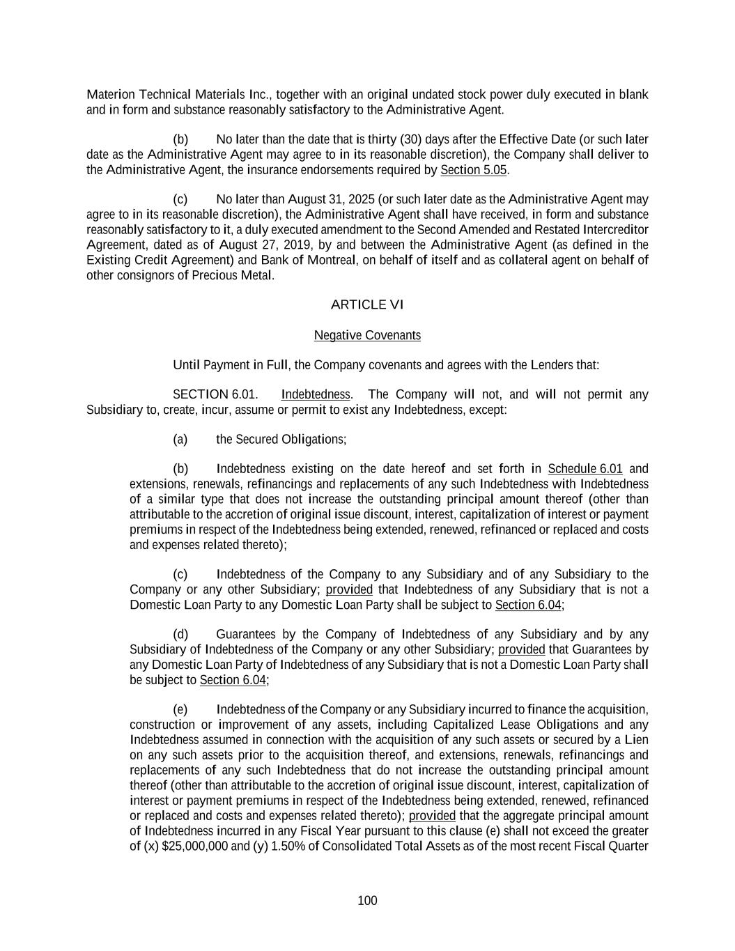 100 Materion Technical Materials Inc., together with an original undated stock power duly executed in blank and in form and substance reasonably satisfactory to the Administrative Agent. (b) No later than the date that is thirty (30) days after the Effective Date (or such later date as the Administrative Agent may agree to in its reasonable discretion), the Company shall deliver to the Administrative Agent, the insurance endorsements required by Section 5.05. (c) No later than August 31, 2025 (or such later date as the Administrative Agent may agree to in its reasonable discretion), the Administrative Agent shall have received, in form and substance reasonably satisfactory to it, a duly executed amendment to the Second Amended and Restated Intercreditor Agreement, dated as of August 27, 2019, by and between the Administrative Agent (as defined in the Existing Credit Agreement) and Bank of Montreal, on behalf of itself and as collateral agent on behalf of other consignors of Precious Metal. ARTICLE VI Negative Covenants Until Payment in Full, the Company covenants and agrees with the Lenders that: SECTION 6.01. Indebtedness. The Company will not, and will not permit any Subsidiary to, create, incur, assume or permit to exist any Indebtedness, except: (a) the Secured Obligations; (b) Indebtedness existing on the date hereof and set forth in Schedule 6.01 and extensions, renewals, refinancings and replacements of any such Indebtedness with Indebtedness of a similar type that does not increase the outstanding principal amount thereof (other than attributable to the accretion of original issue discount, interest, capitalization of interest or payment premiums in respect of the Indebtedness being extended, renewed, refinanced or replaced and costs and expenses related thereto); (c) Indebtedness of the Company to any Subsidiary and of any Subsidiary to the Company or any other Subsidiary; provided that Indebtedness of any Subsidiary that is not a Domestic Loan Party to any Domestic Loan Party shall be subject to Section 6.04; (d) Guarantees by the Company of Indebtedness of any Subsidiary and by any Subsidiary of Indebtedness of the Company or any other Subsidiary; provided that Guarantees by any Domestic Loan Party of Indebtedness of any Subsidiary that is not a Domestic Loan Party shall be subject to Section 6.04; (e) Indebtedness of the Company or any Subsidiary incurred to finance the acquisition, construction or improvement of any assets, including Capitalized Lease Obligations and any Indebtedness assumed in connection with the acquisition of any such assets or secured by a Lien on any such assets prior to the acquisition thereof, and extensions, renewals, refinancings and replacements of any such Indebtedness that do not increase the outstanding principal amount thereof (other than attributable to the accretion of original issue discount, interest, capitalization of interest or payment premiums in respect of the Indebtedness being extended, renewed, refinanced or replaced and costs and expenses related thereto); provided that the aggregate principal amount of Indebtedness incurred in any Fiscal Year pursuant to this clause (e) shall not exceed the greater of (x) $25,000,000 and (y) 1.50% of Consolidated Total Assets as of the most recent Fiscal Quarter